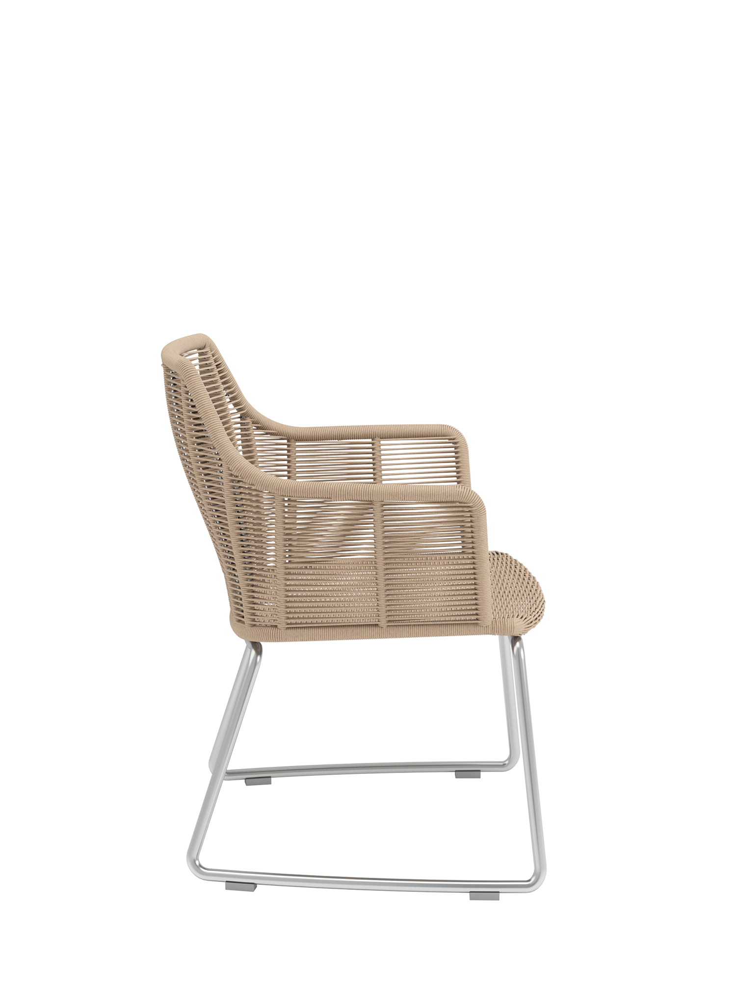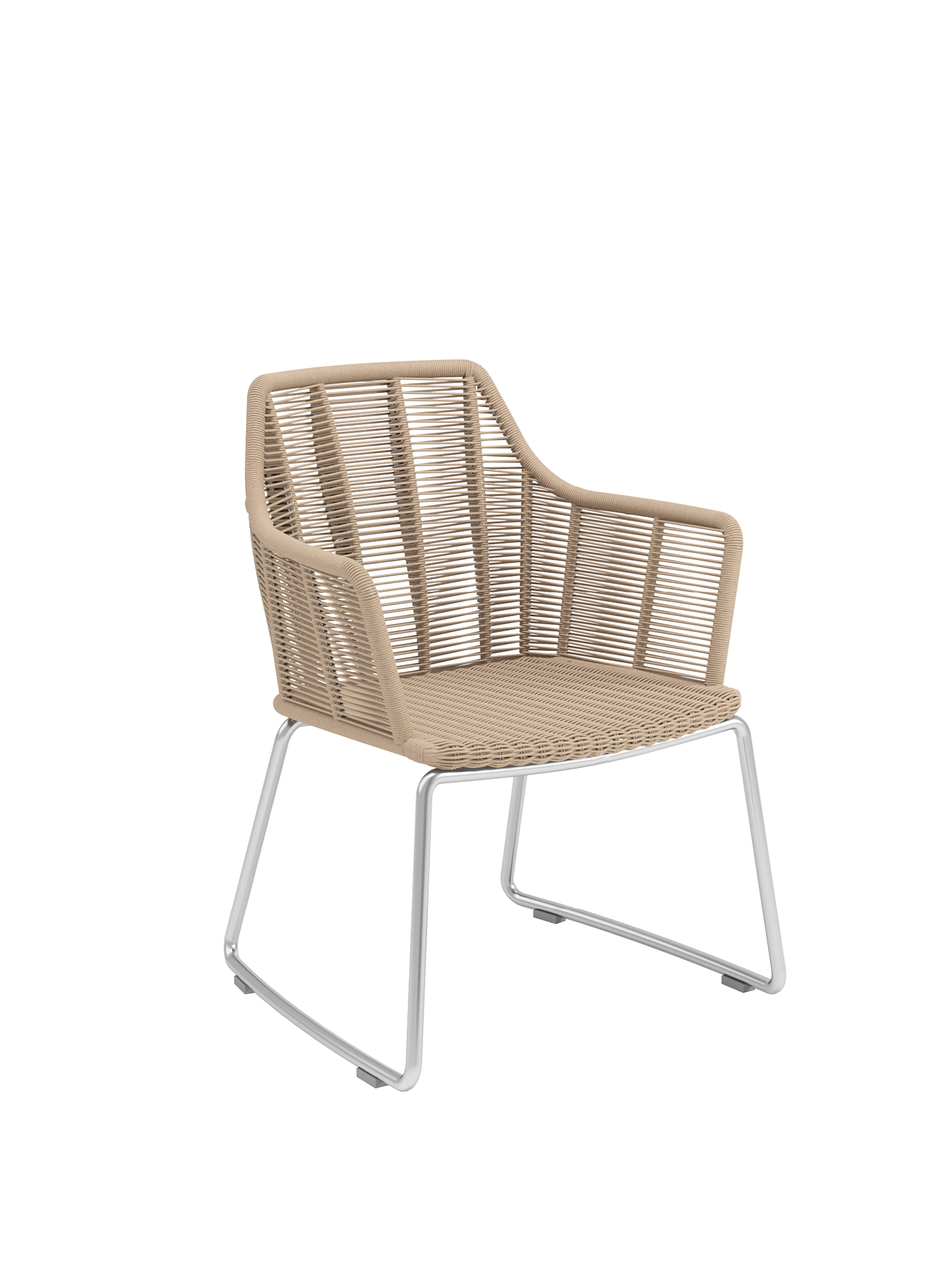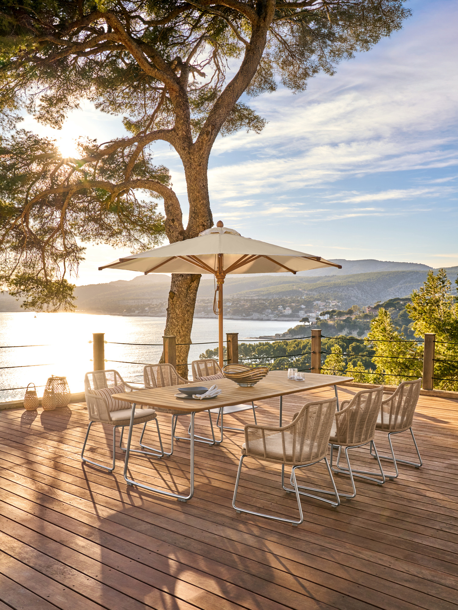 An ergonomically shaped double-sided backrest and traised armrests of the garden chair have an airy, pleasantly cocooning quality. The particularly natural and soft feel of the woven material further heightens seating comfort. Slender stainless steel runners provide the armchairs with unfailing support. The dining tables of the collection, with teak or synthetic resin tops, take their place as delightfully harmonious counterparts.