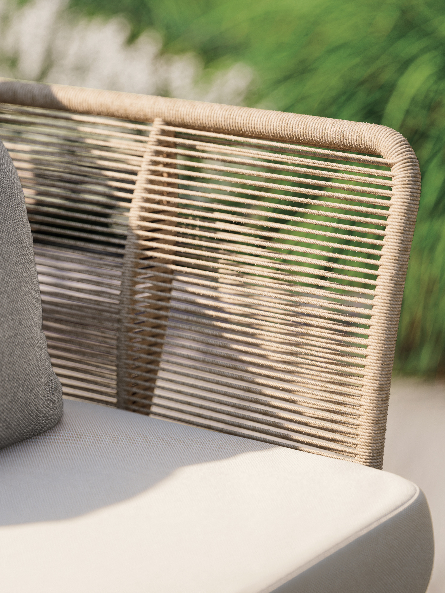 The unconventional lounge format of the inviting sofa with its soft cushions and transparent cord wickerwork, creates the perfect setting for relaxation.