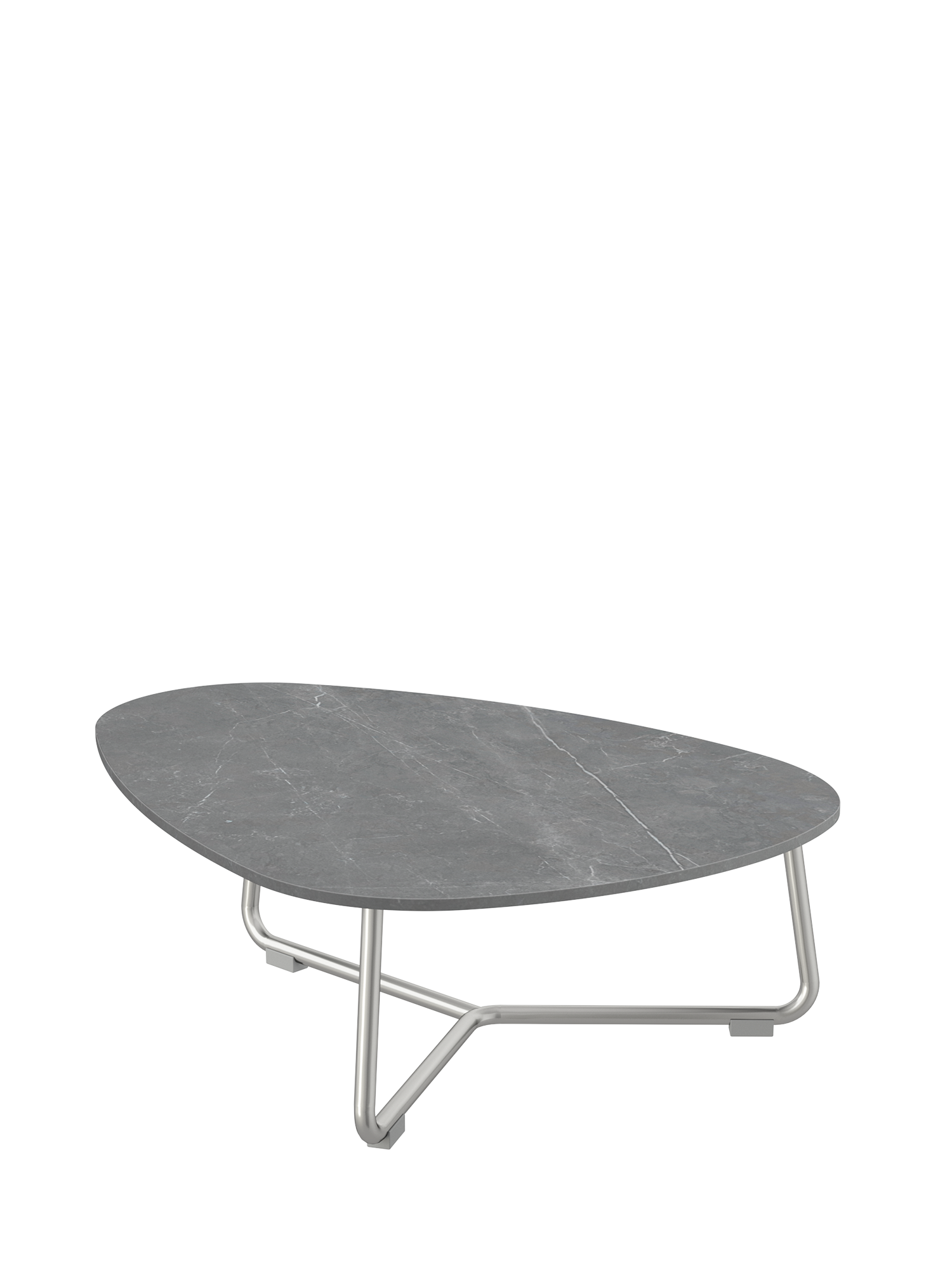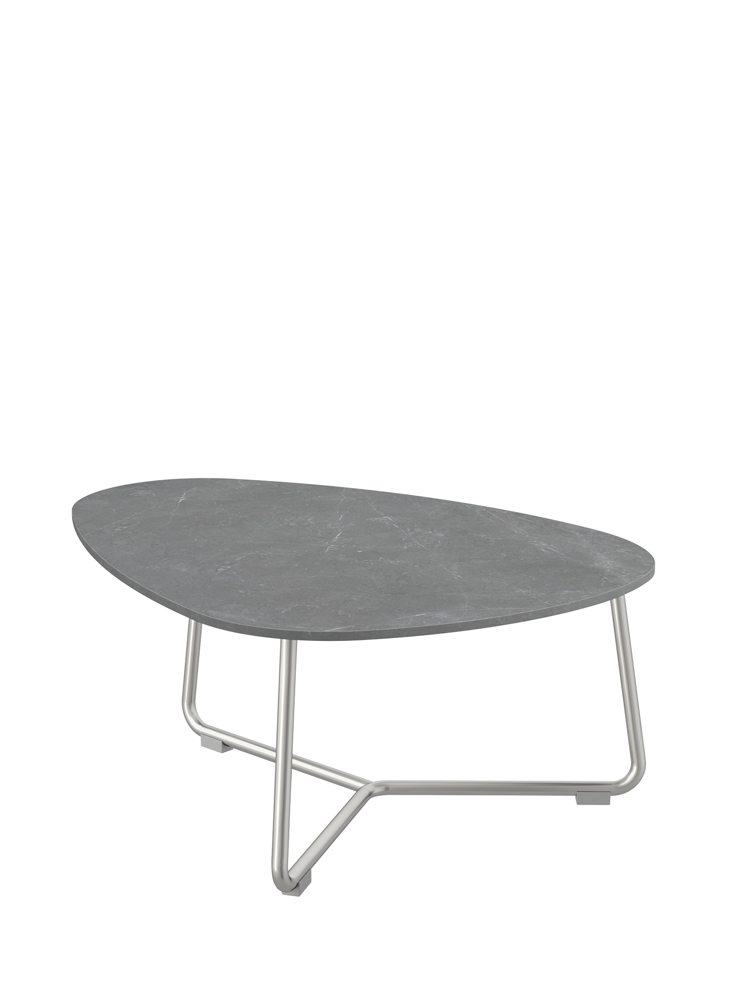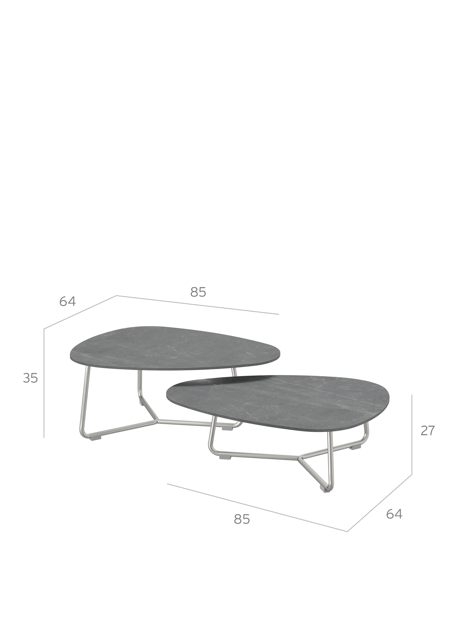 The Lounge Table Set combines a higher and a lower table with ceramic tops of the same size. The asymmetric, rounded shapes allow for flexible and individual variation. Their height is perfectly aligned with that of the lounge furniture. When their long sides are placed parallel to each other, the two lounge tables can be pushed close together or wider apart – depending on how much space is available.