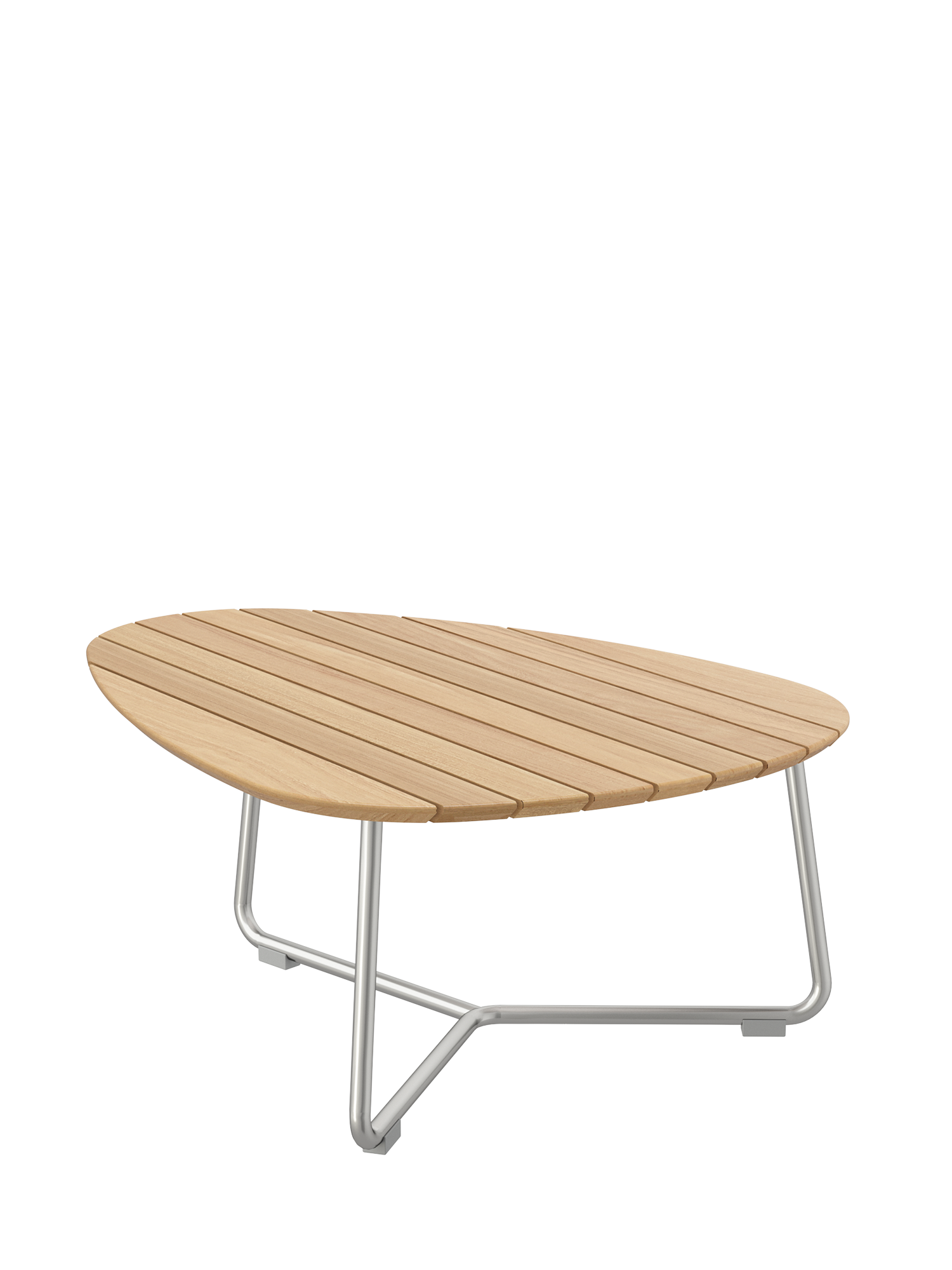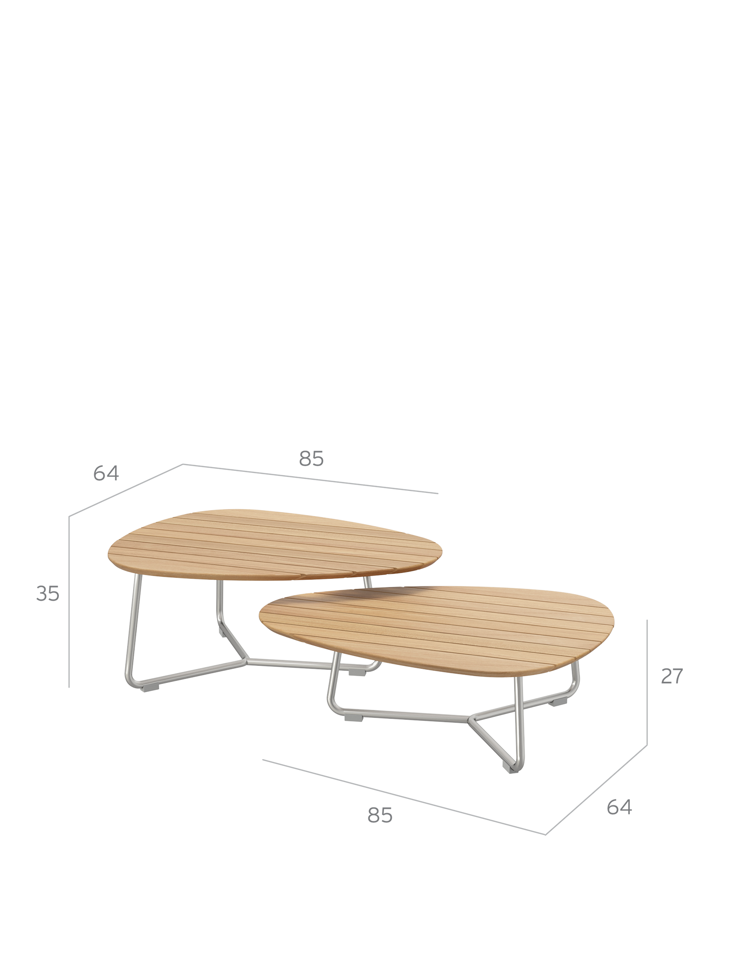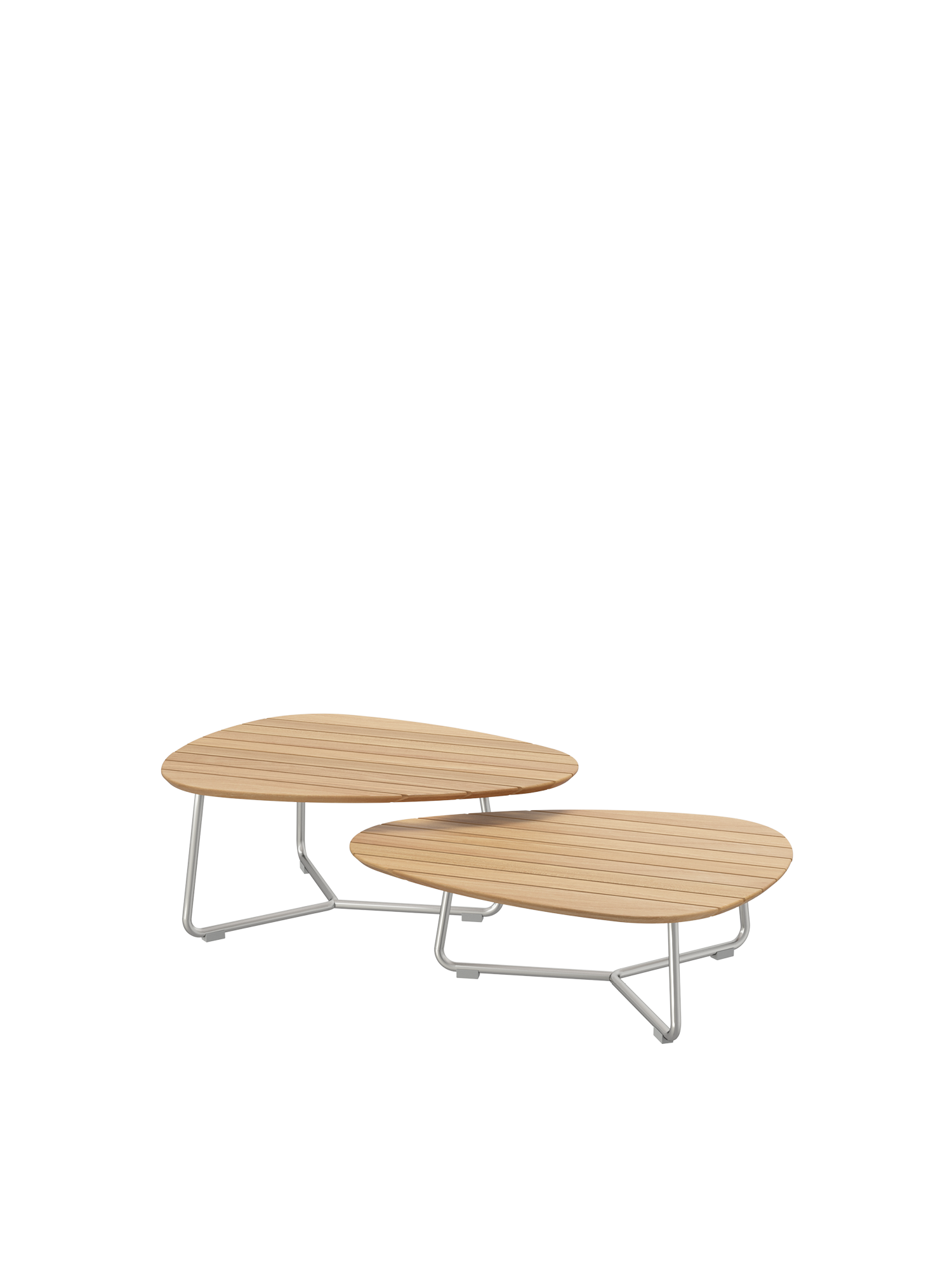 The Lounge Table Set combines a higher and a lower table with teak tops of the same size. The asymmetric, rounded shapes allow for flexible and individual variation. Their height is perfectly aligned with that of the lounge furniture. When their long sides are placed parallel to each other, the two lounge tables can be pushed close together or wider apart – depending on how much space is available.