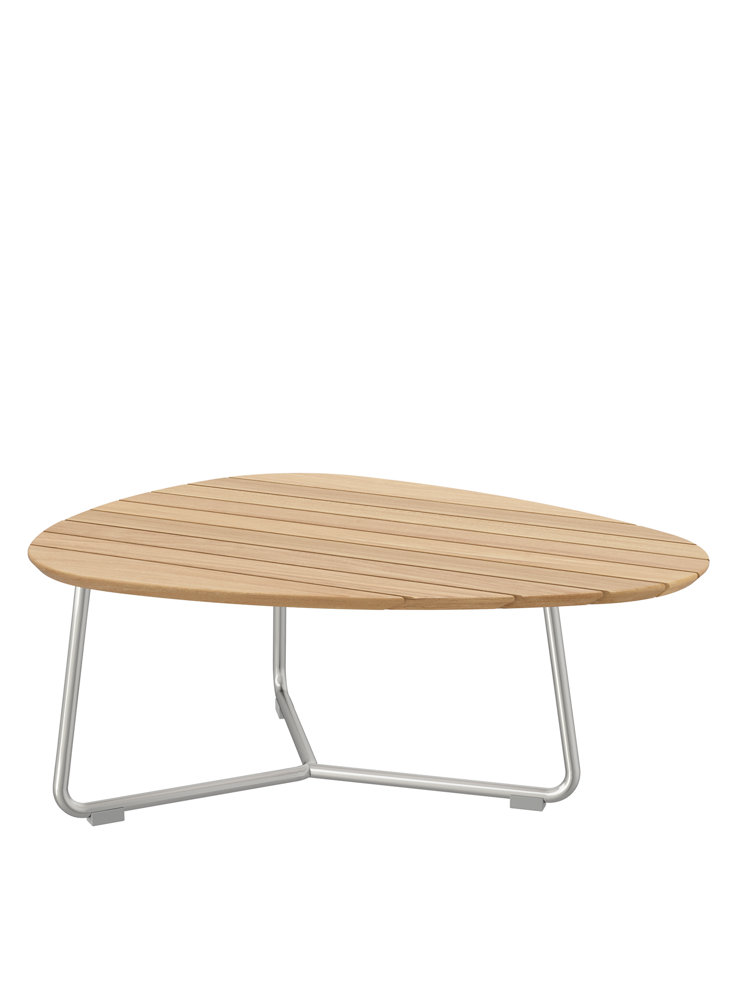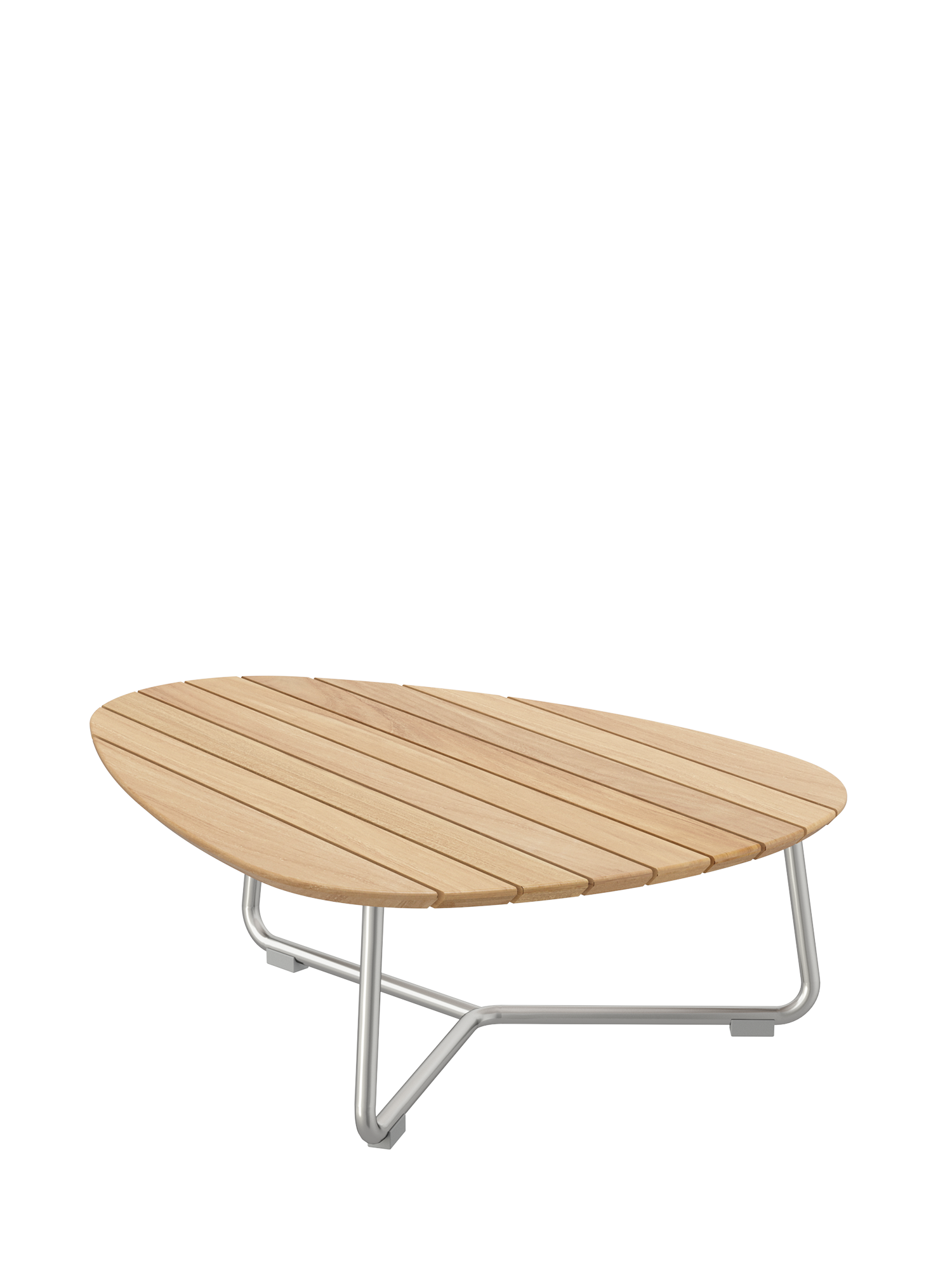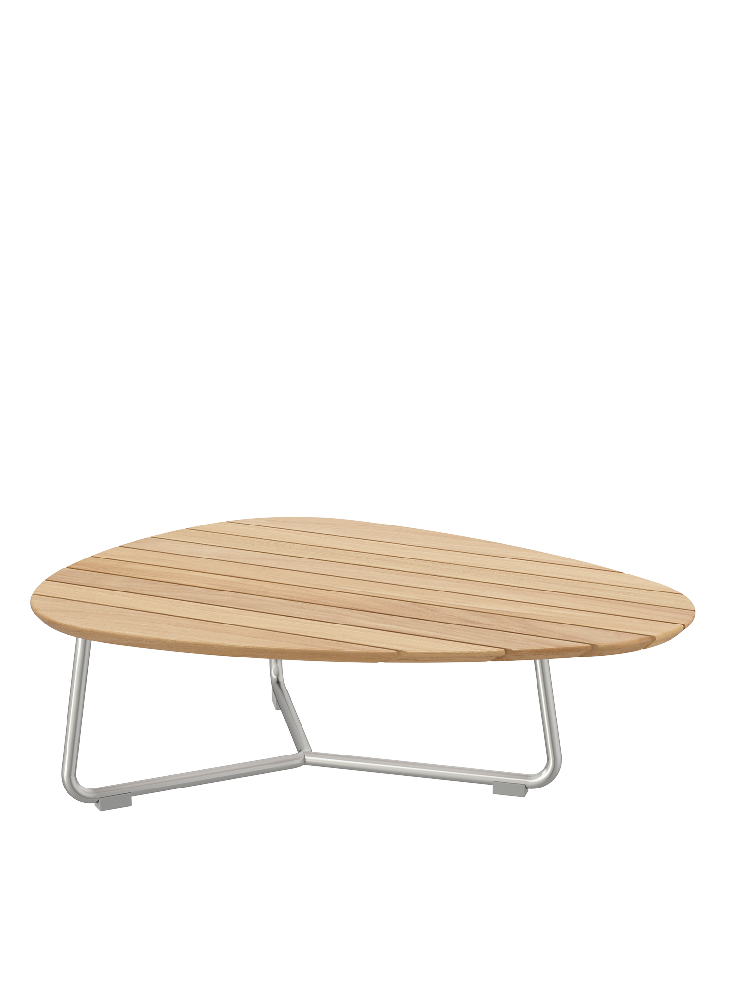 The Lounge Table Set combines a higher and a lower table with teak tops of the same size. The asymmetric, rounded shapes allow for flexible and individual variation. Their height is perfectly aligned with that of the lounge furniture. When their long sides are placed parallel to each other, the two lounge tables can be pushed close together or wider apart – depending on how much space is available.