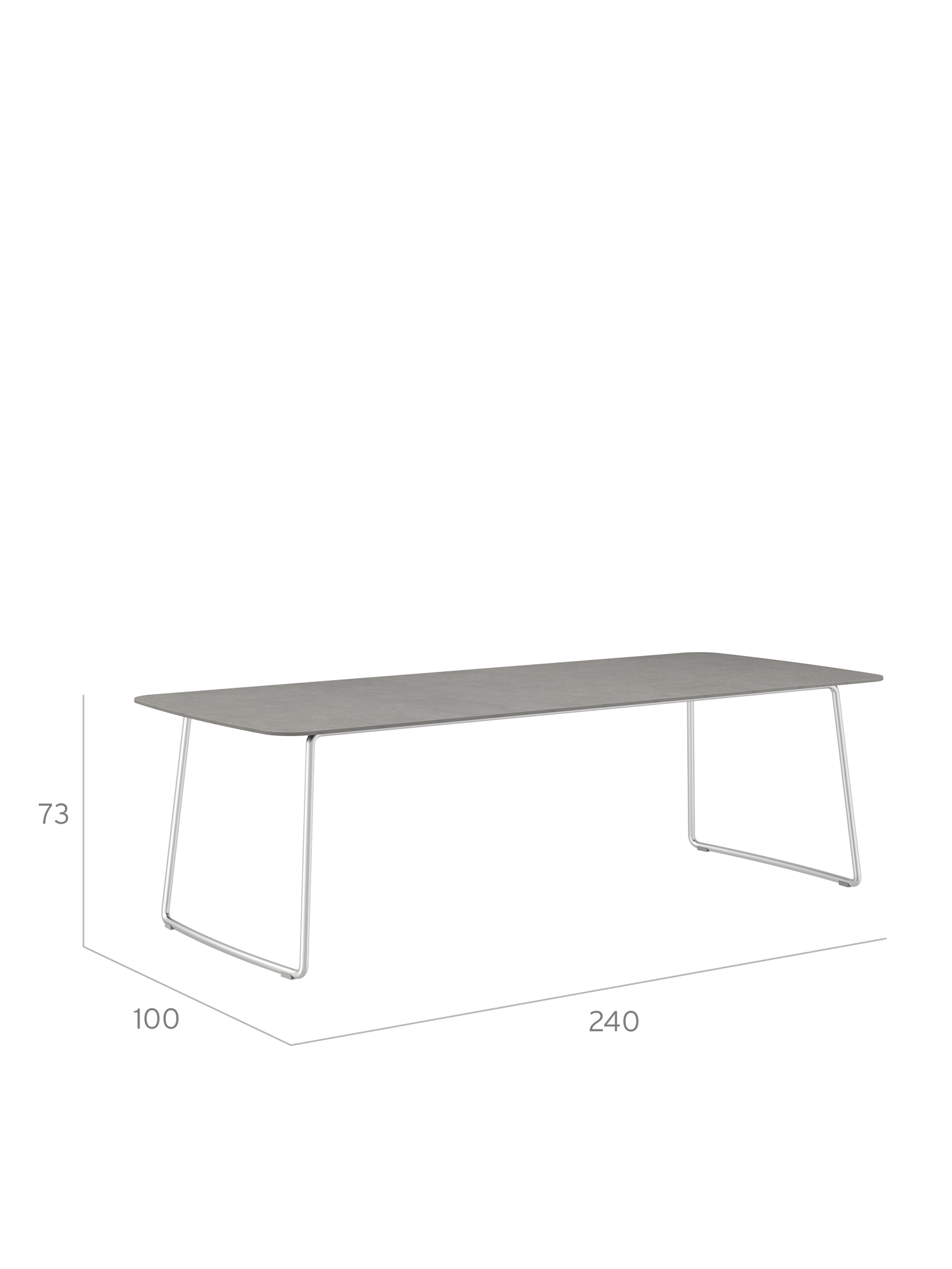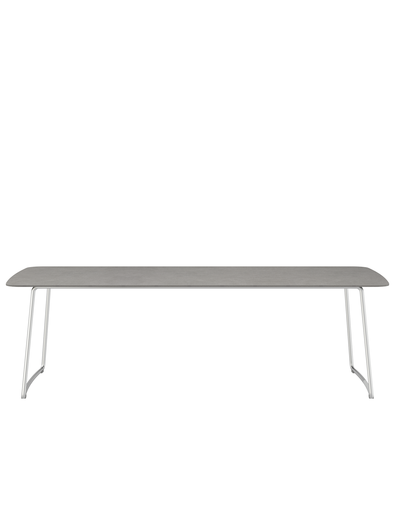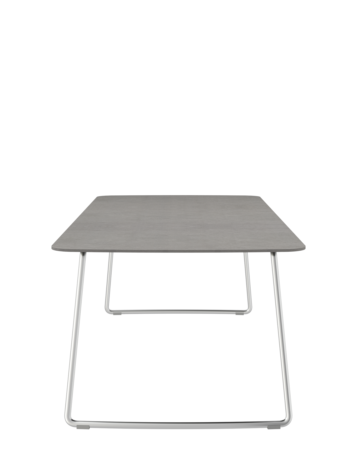 The slim table top made of synthetic resin in the colour Shade is held by the curved stainless steel runners of the table. They also blend harmoniously into the overall appearance of the Amari series. The matching armchairs can simply be pushed under the table after use.