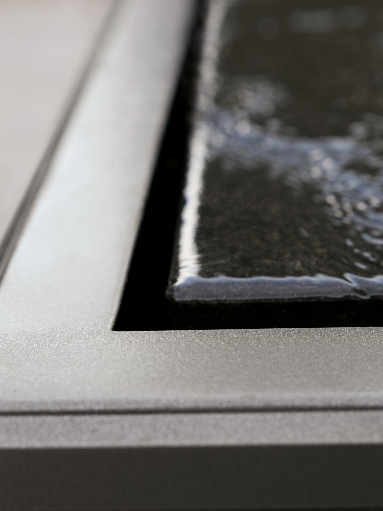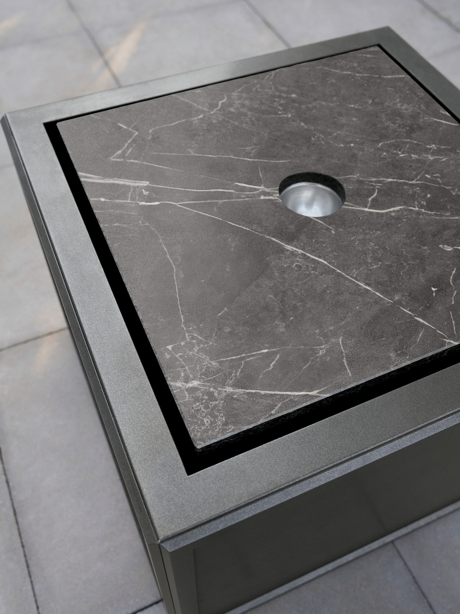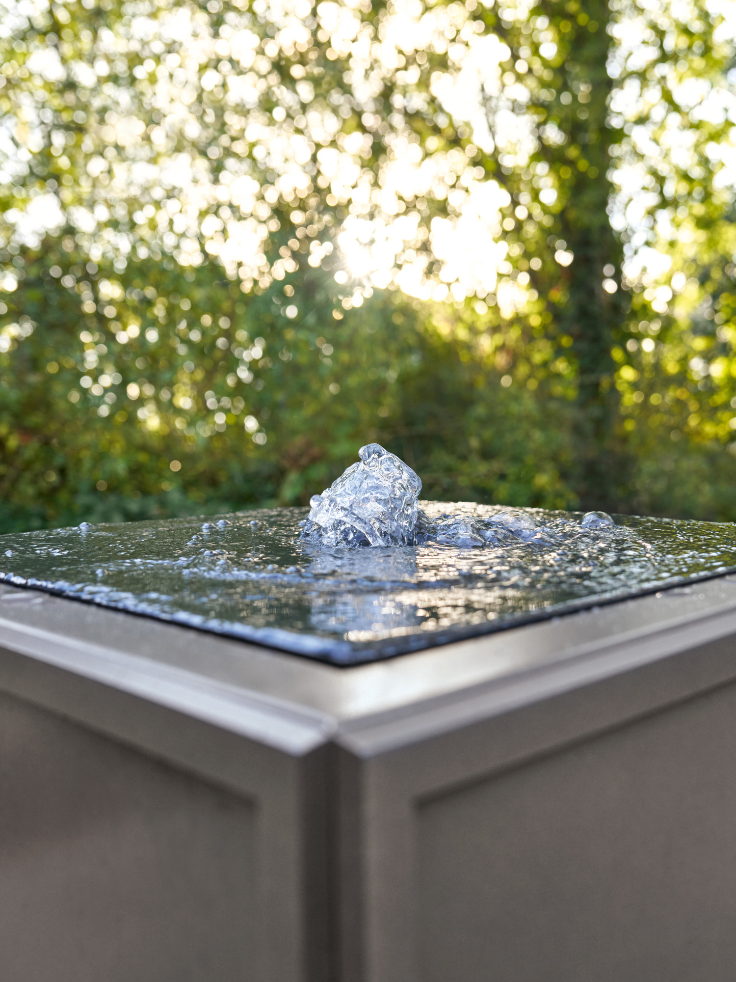 Rising up from the square fountain made of powder-coated aluminium, water ripples over a surface made of weatherproof marbled ceramic and flows down the sides. The circuit driven by a pump, requires merely one power connection. Water drainage, cable outlet, and overflow guarantee reliable operation. In winter, the fountain must be completely emptied, the pump removed and stored in a frost-free place.