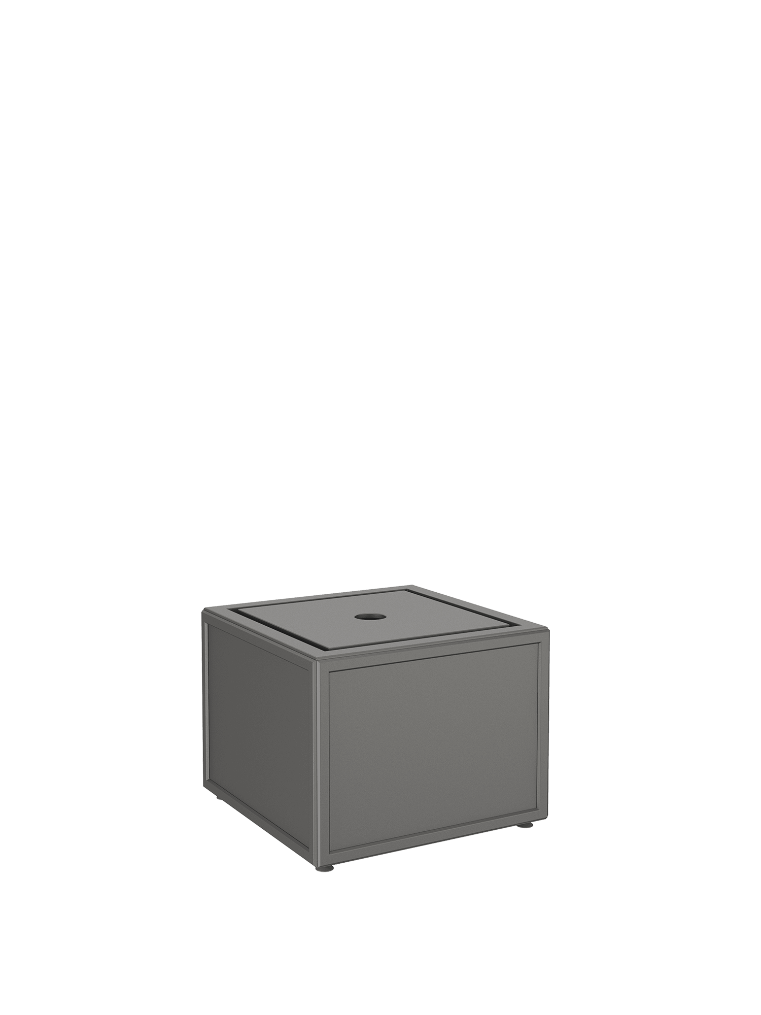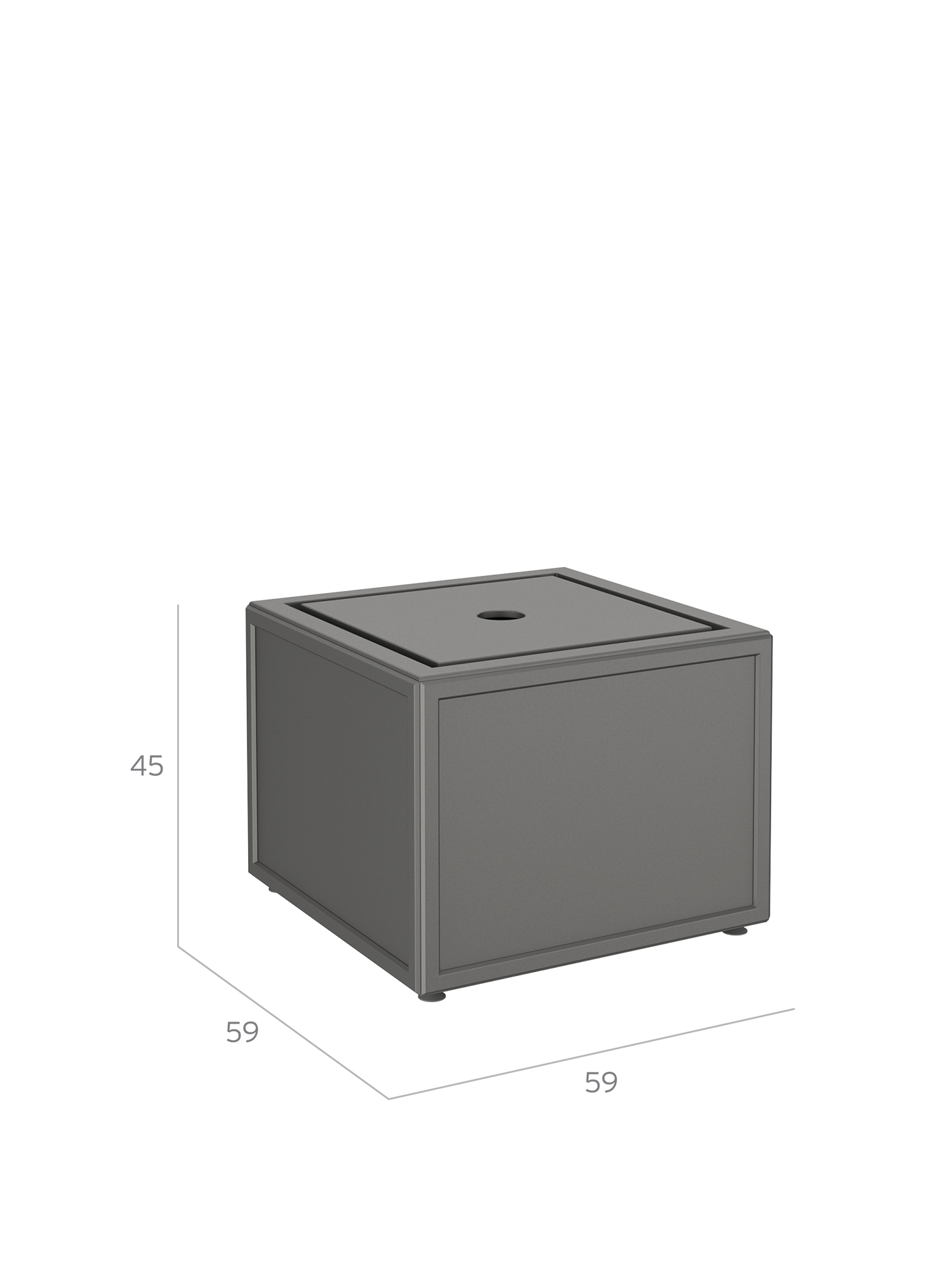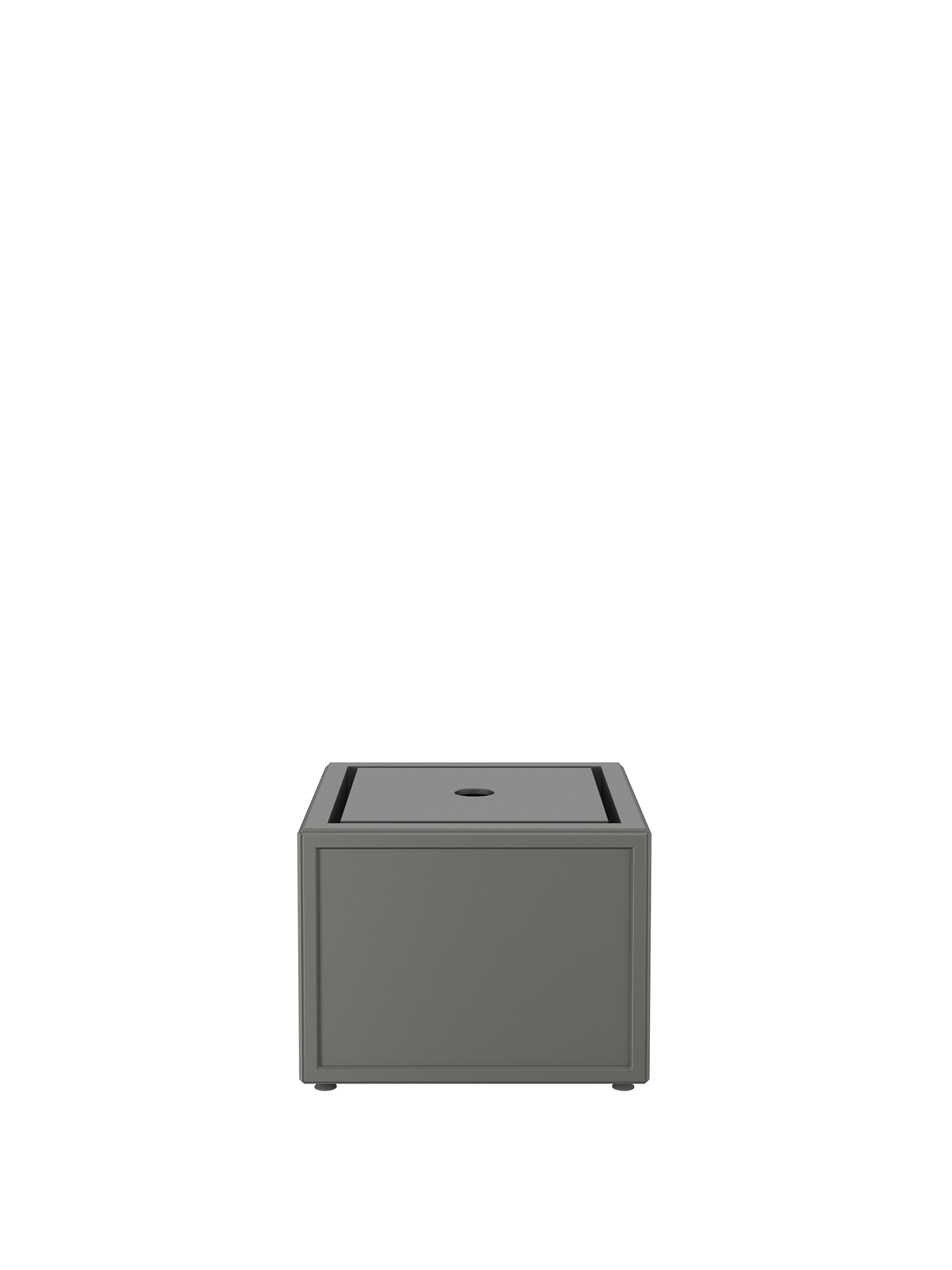 Rising up from the square fountain made of powder-coated aluminium, water ripples over a surface made of weatherproof marbled ceramic and flows down the sides. The circuit driven by a pump, requires merely one power connection. Water drainage, cable outlet, and overflow guarantee reliable operation. In winter, the fountain must be completely emptied, the pump removed and stored in a frost-free place.