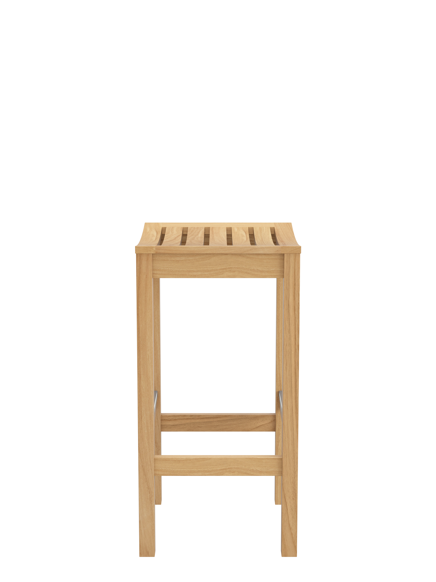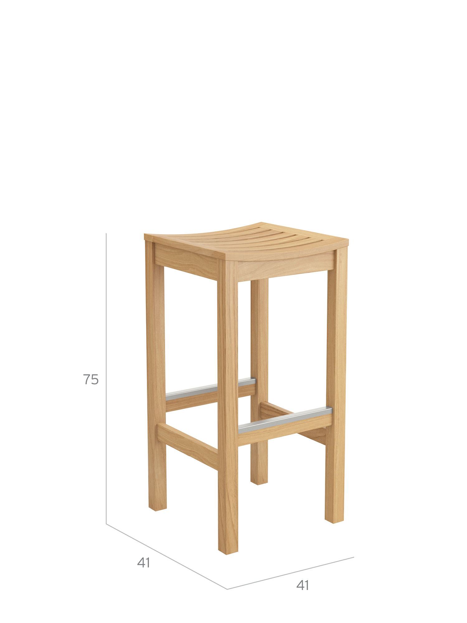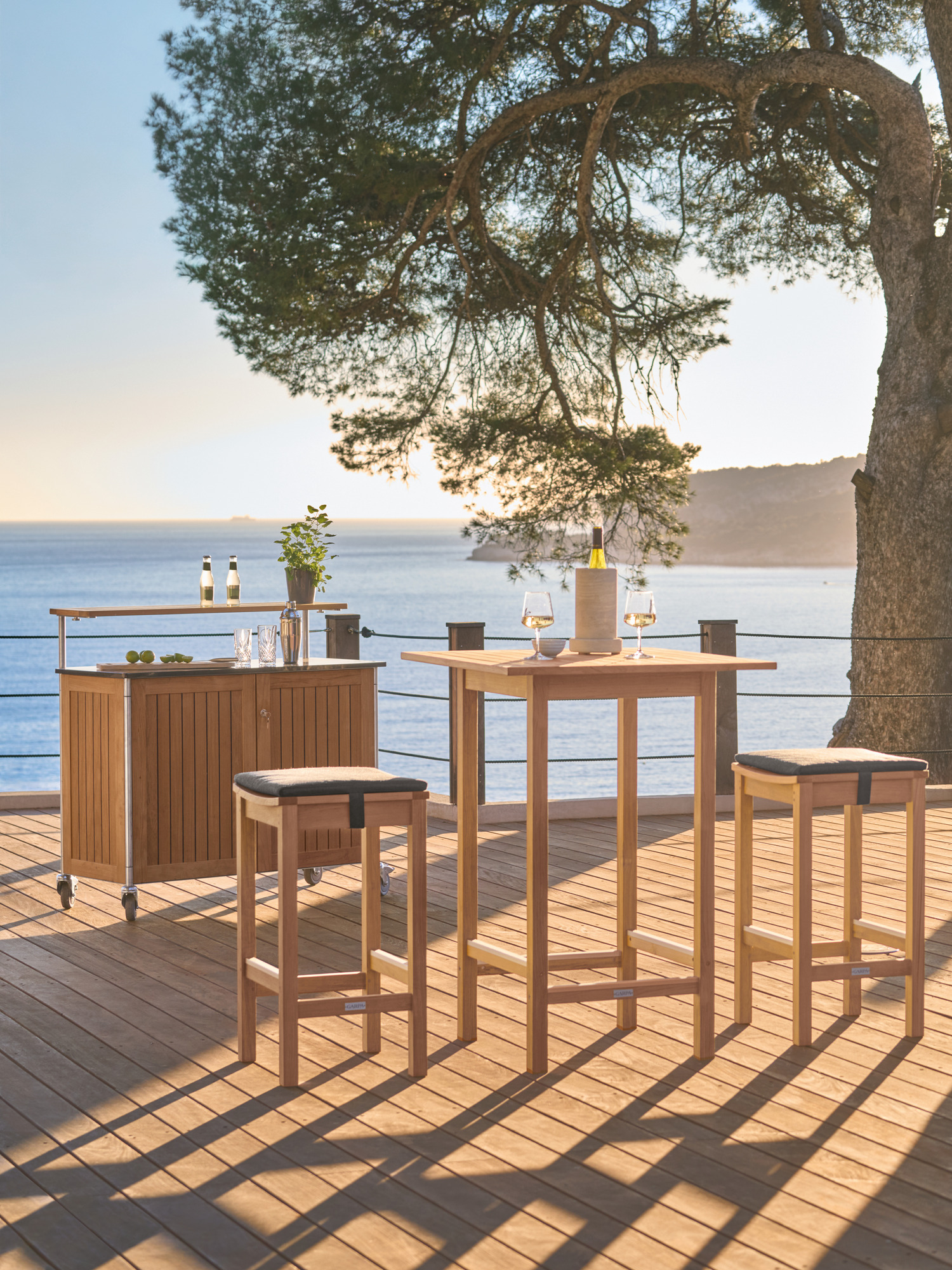 The pared-down design reveals genuine craftsmanship – strong plantation teakwood, ergonomically shaped slats, solid joints. Whether a quick snack or happy hour with friends, the ensemble is an invitation to a casual gathering on the terrace or balcony. The teak supports of both table and stool are protected by aluminium profiles and provide a stable foothold.