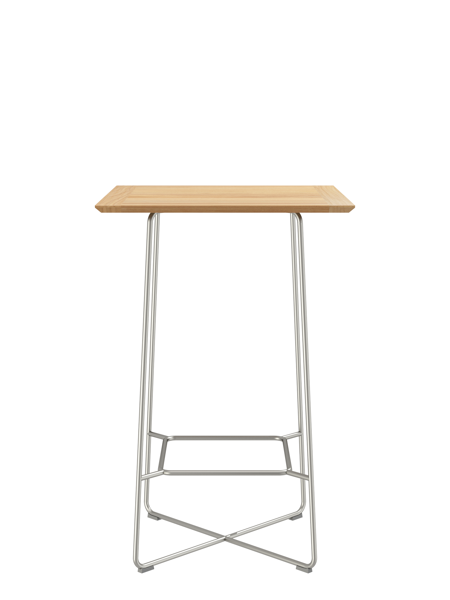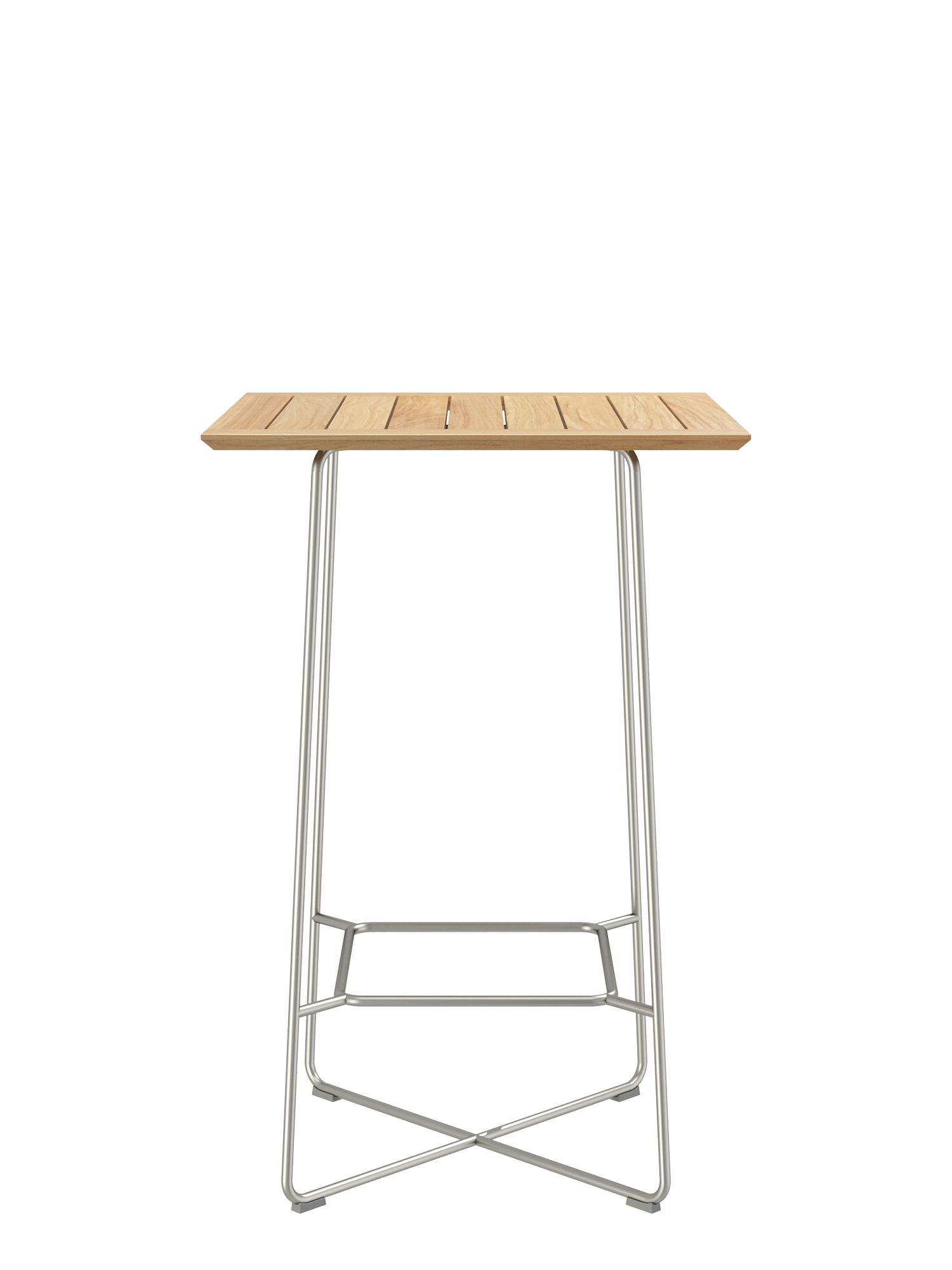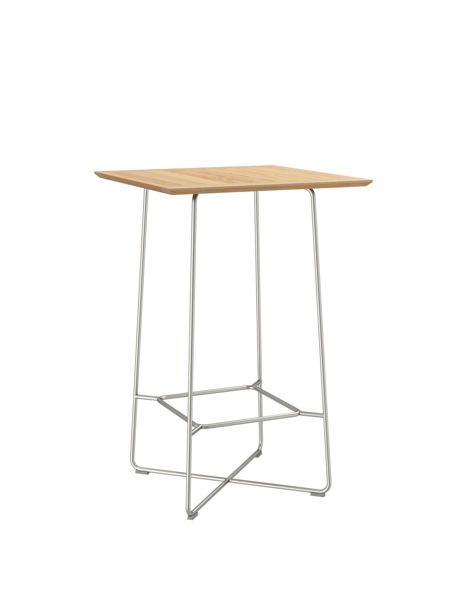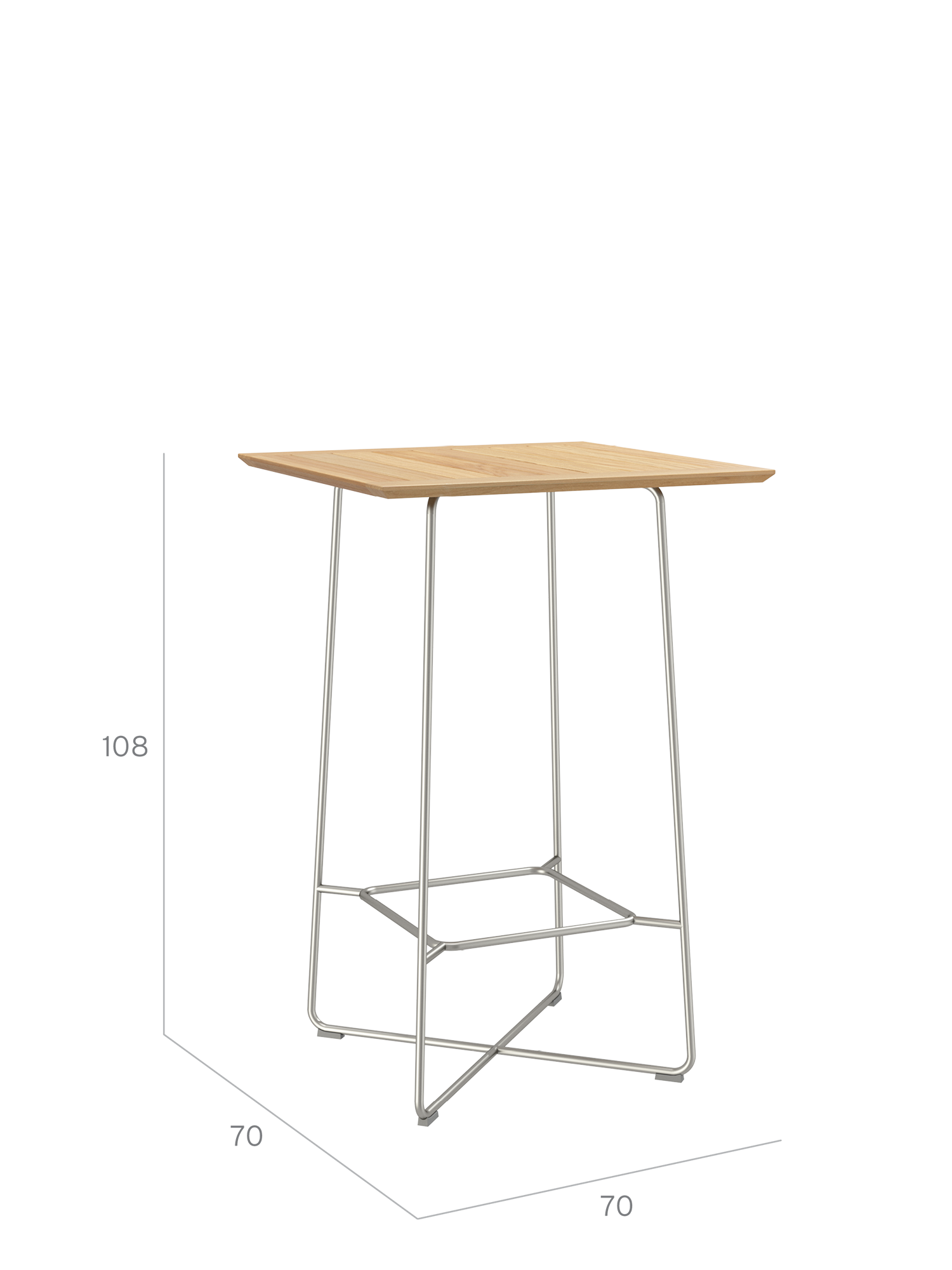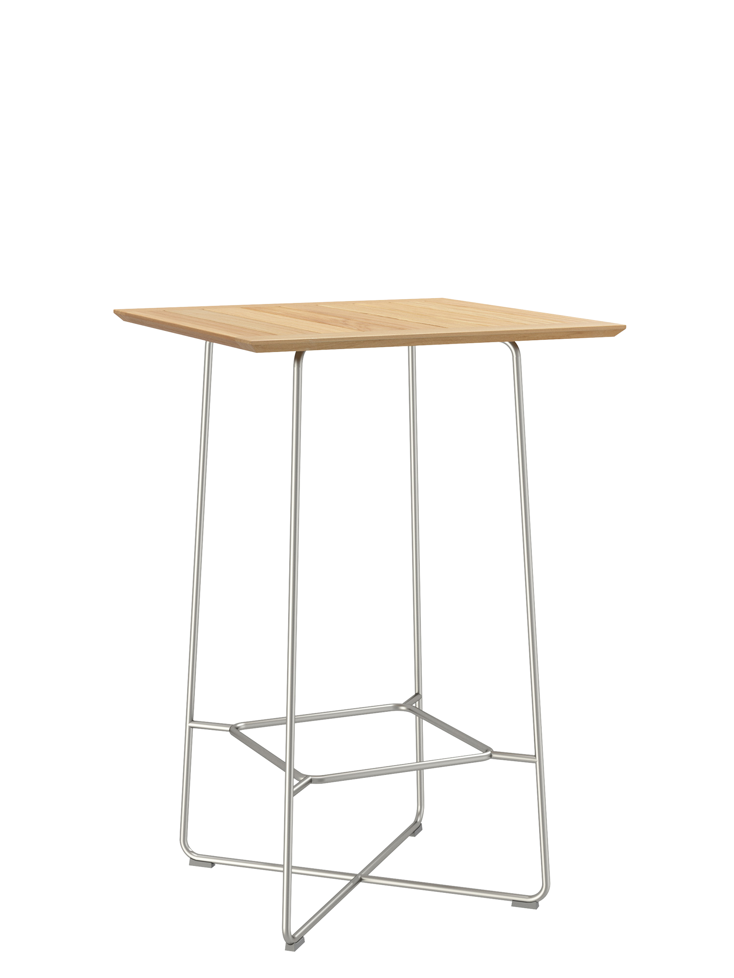 The square bar table is a perfect match for the informal bar stools of the Benton series. The frame of stainless steel has a top of weatherproof plantation teak.