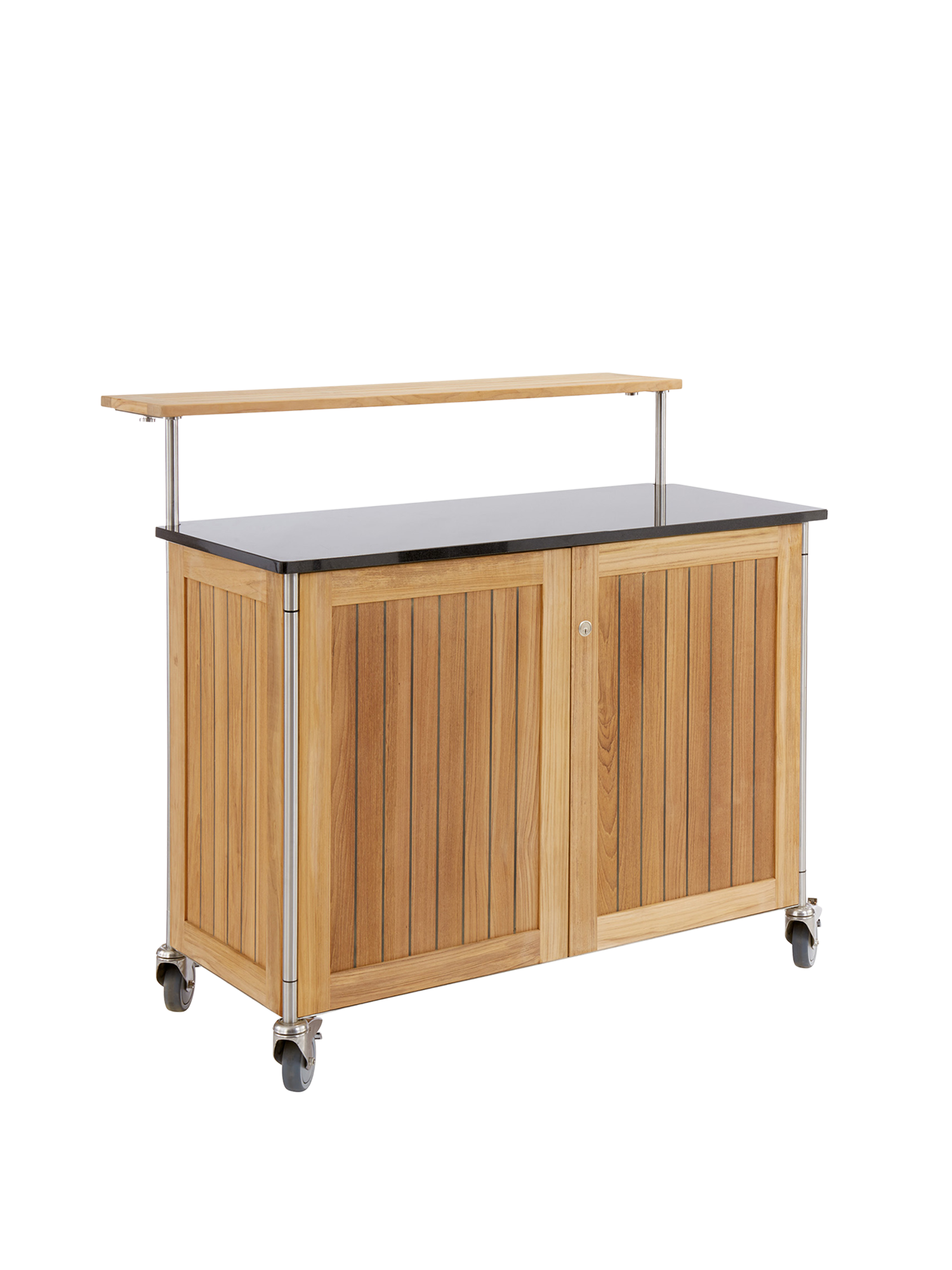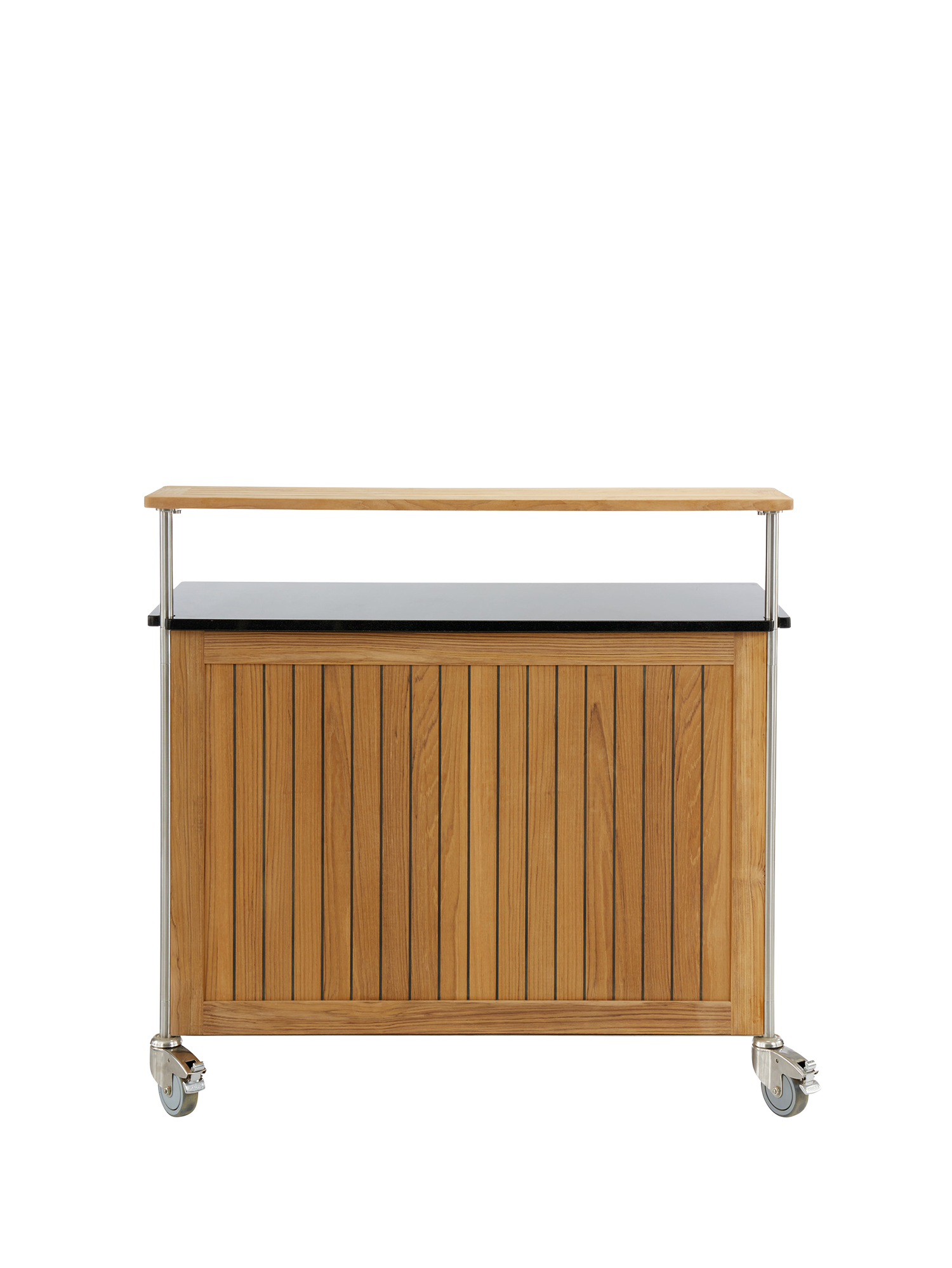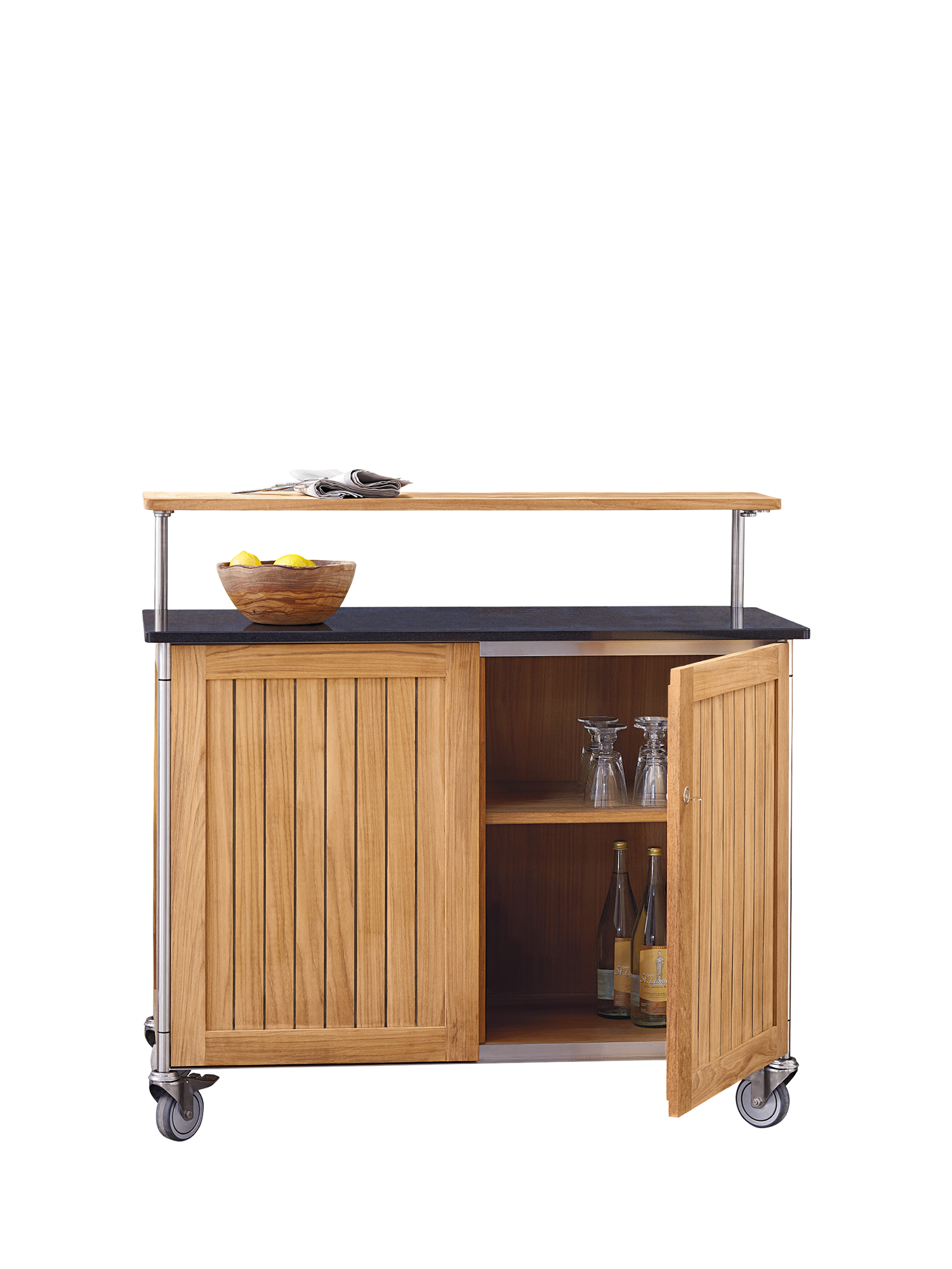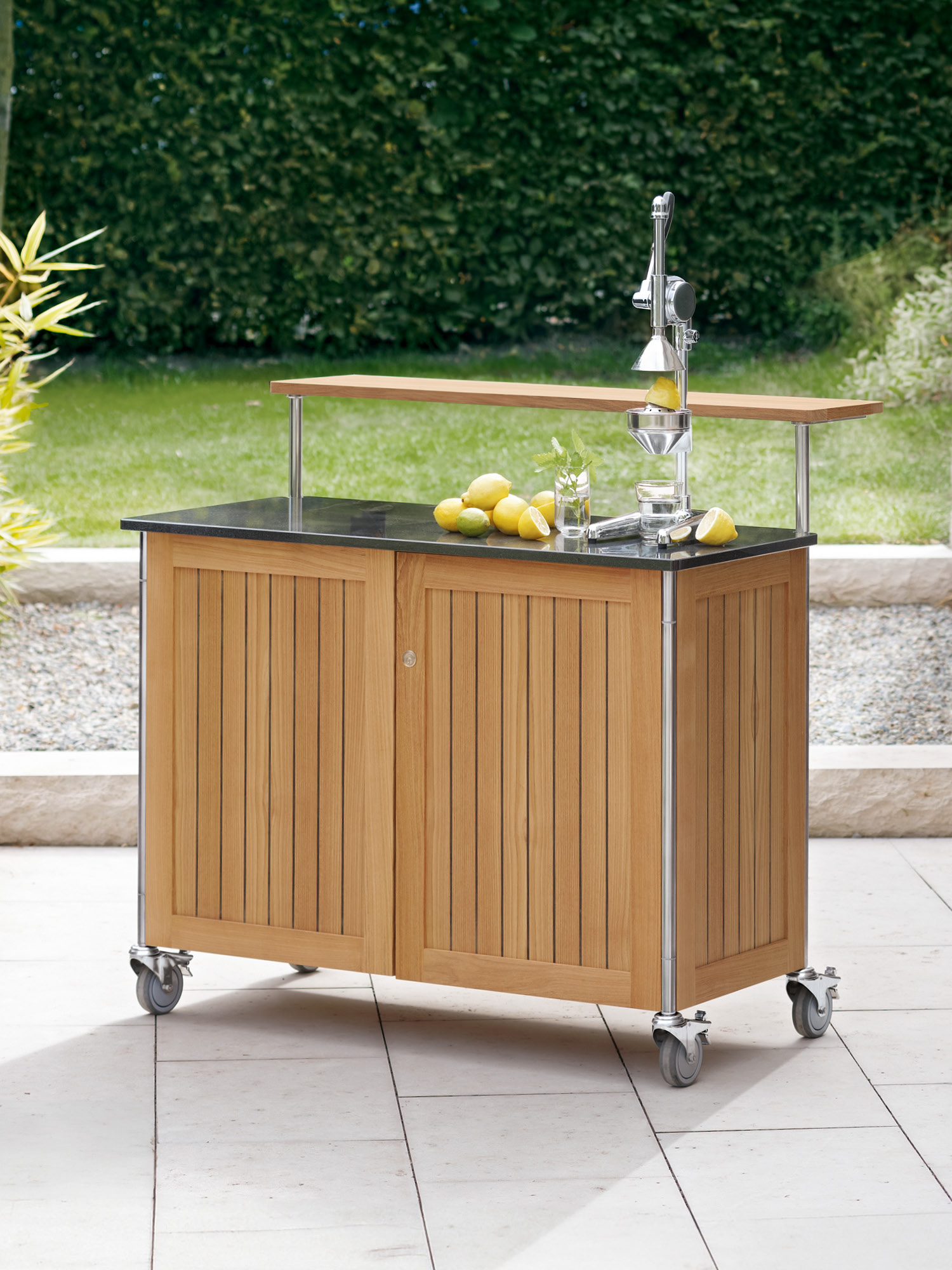The laminated wood of the trolley with teak veneer is weatherproof, its raised surface, projecting from the worktop of gleaming granite, turns it into a bar with counter. With the additional section switched around, the trolley can be set up flush with a wall to become a two-door chest with space on two levels. Behind the doors there is plenty of space for bottles, crockery and baskets. The trolley glides on rollers wherever it is needed. They can be individually fixed to secure a safe stand.