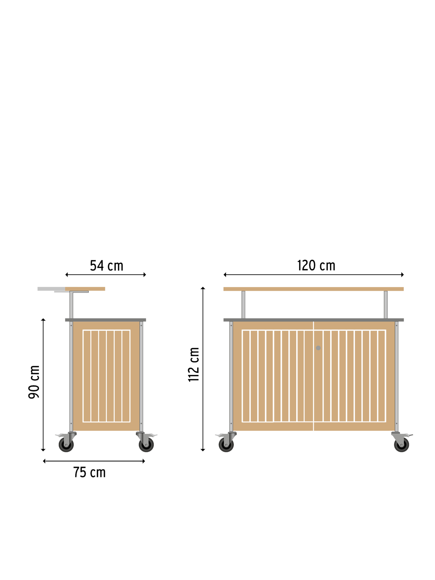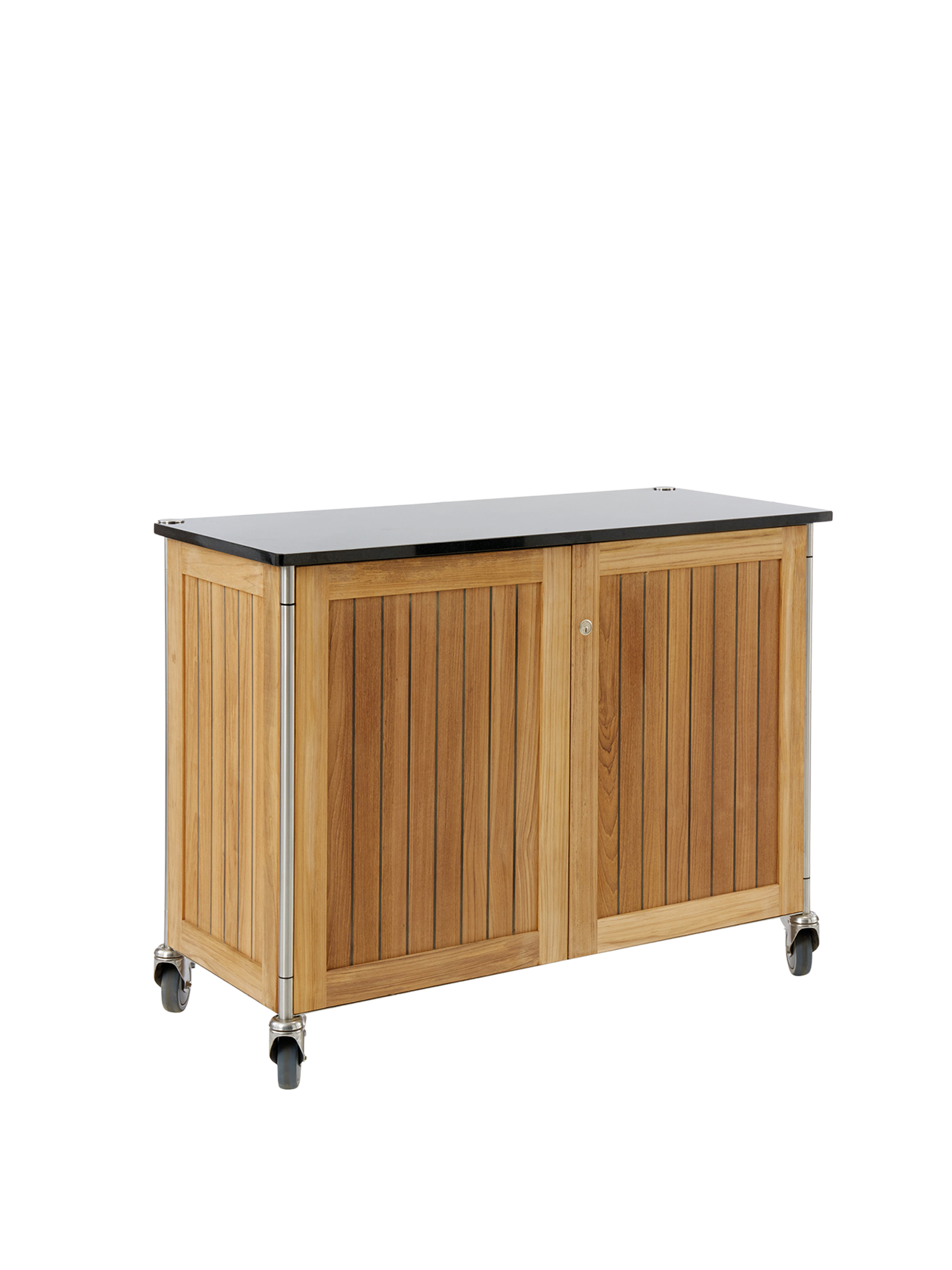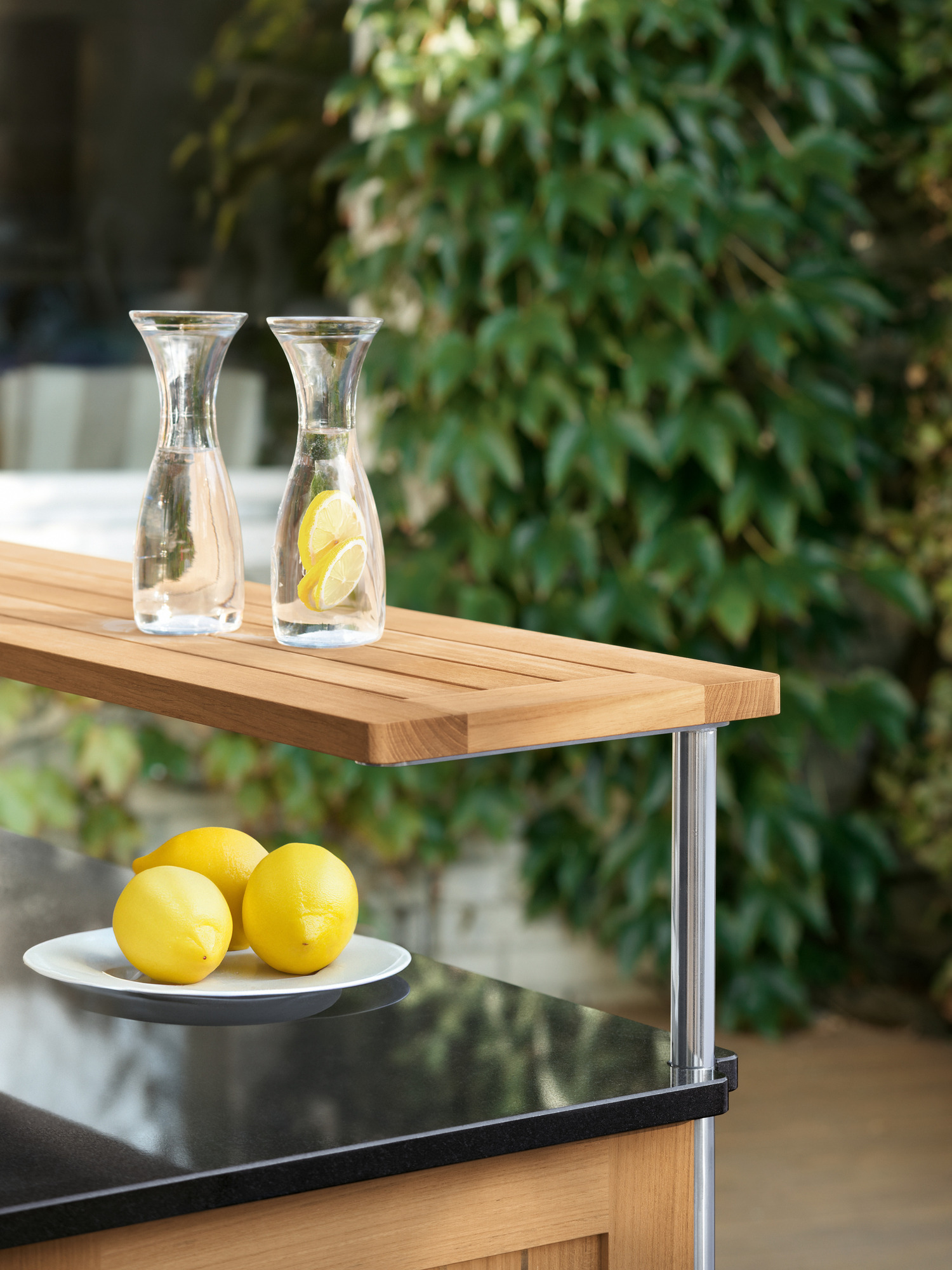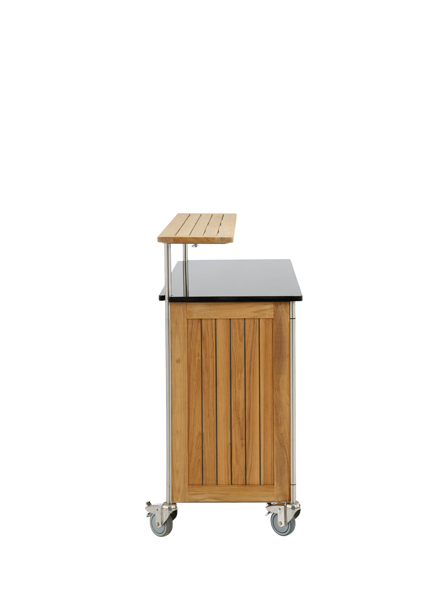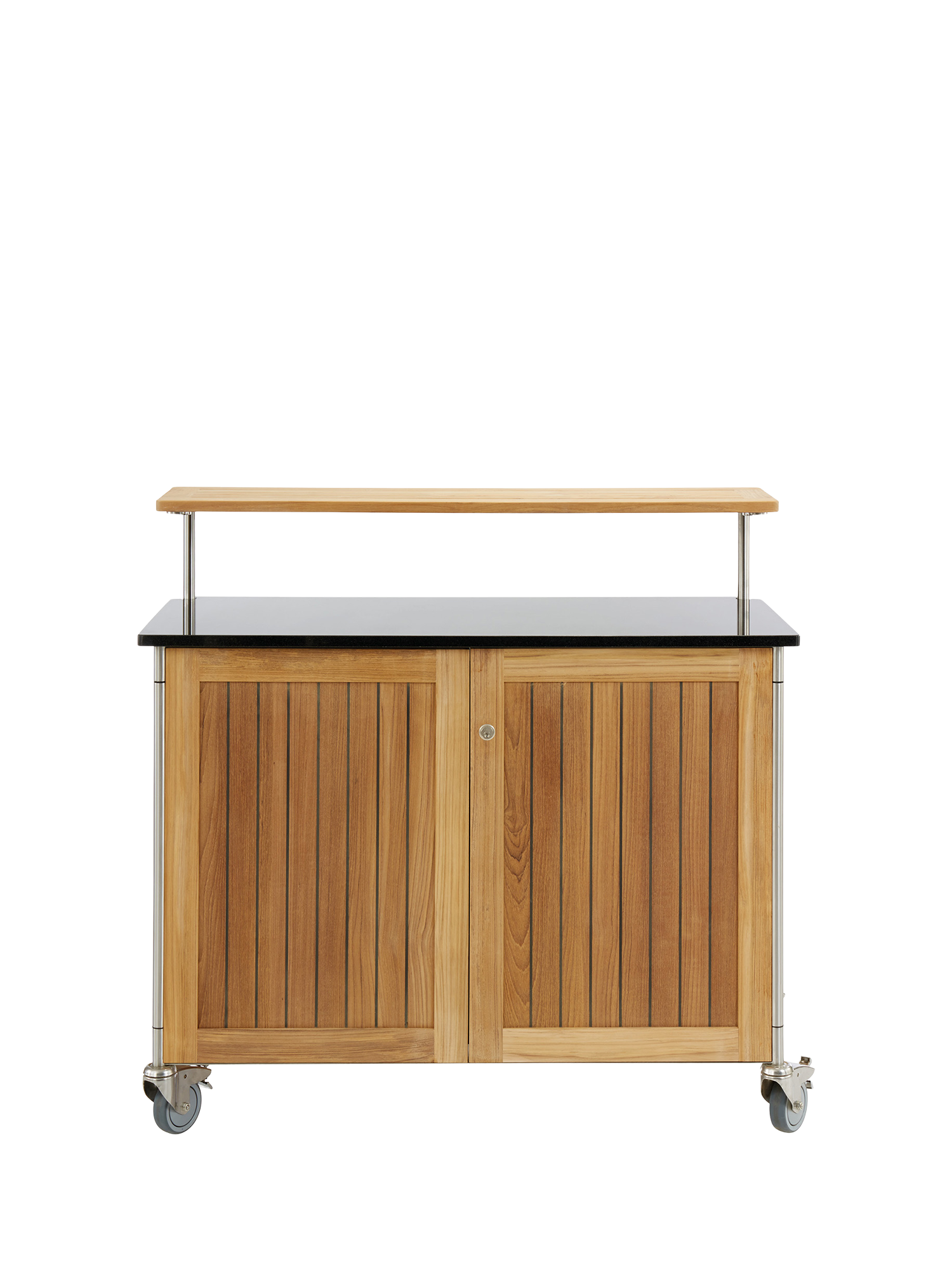 The laminated wood of the trolley with teak veneer is weatherproof, its raised surface, projecting from the worktop of gleaming granite, turns it into a bar with counter. With the additional section switched around, the trolley can be set up flush with a wall to become a two-door chest with space on two levels. Behind the doors there is plenty of space for bottles, crockery and baskets. The trolley glides on rollers wherever it is needed. They can be individually fixed to secure a safe stand.