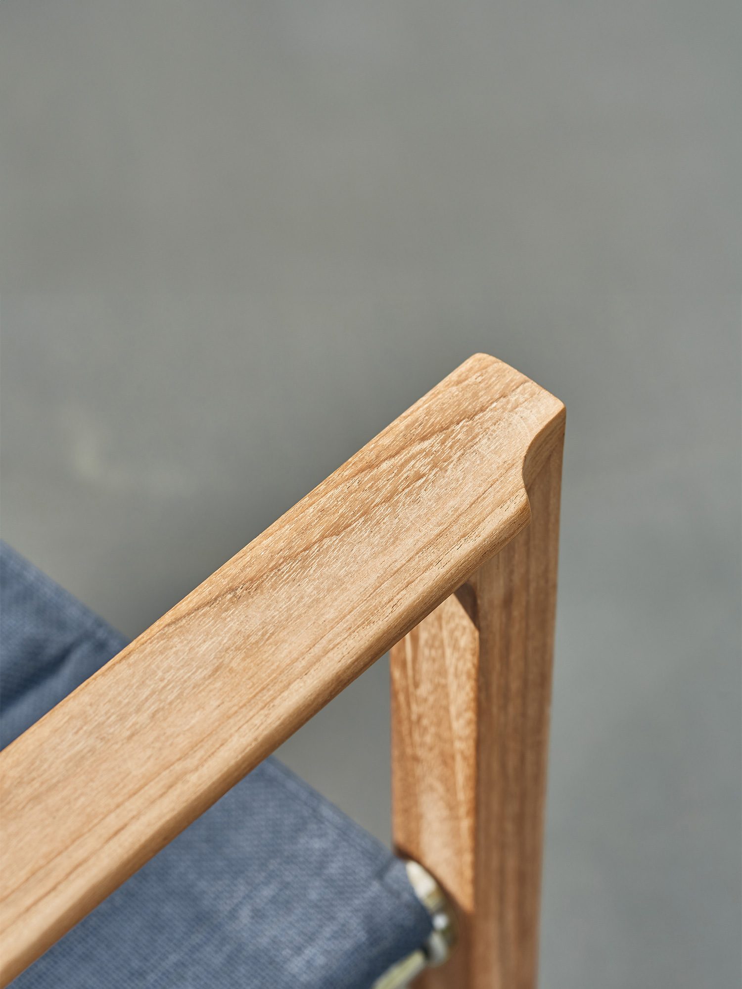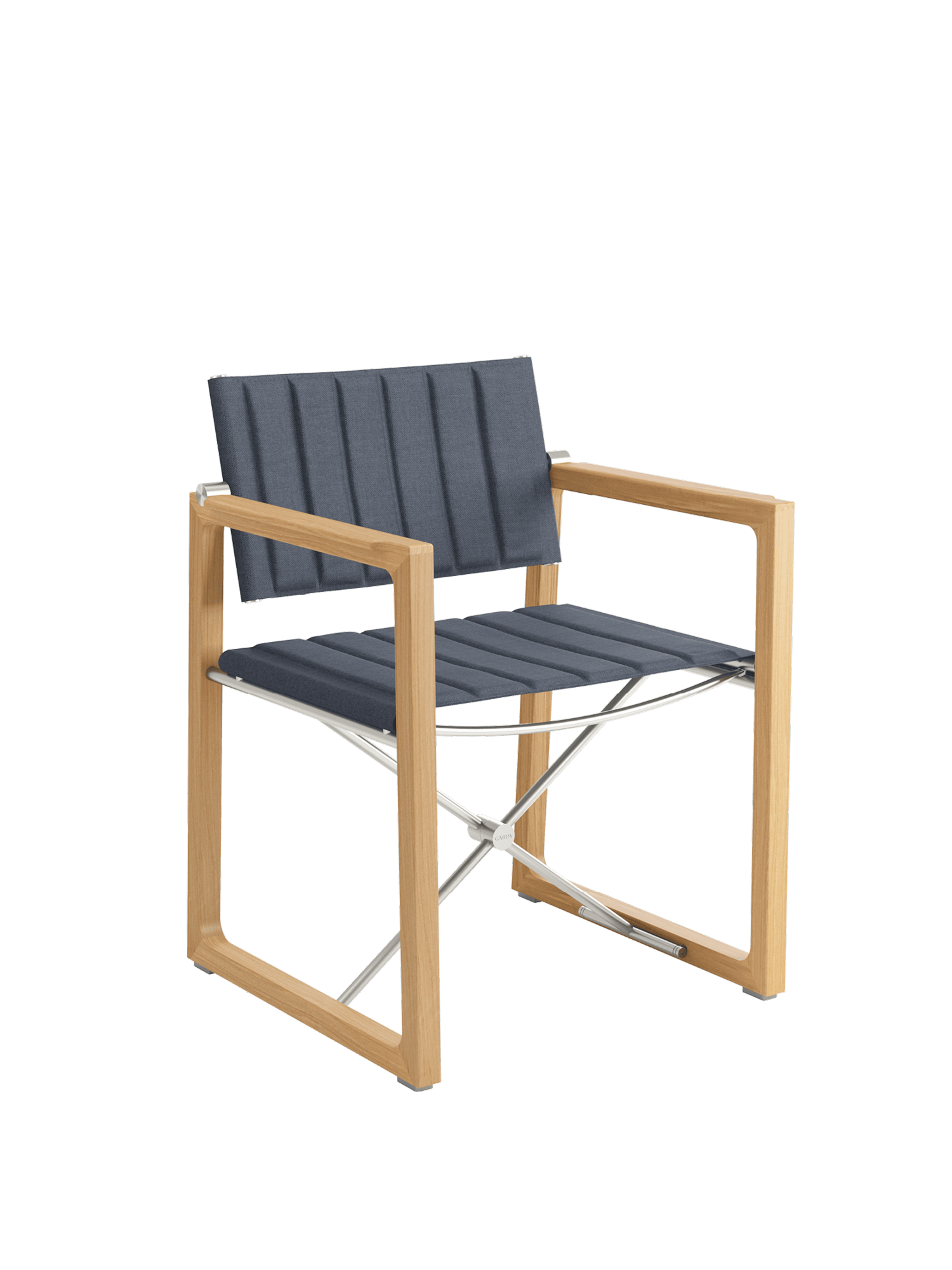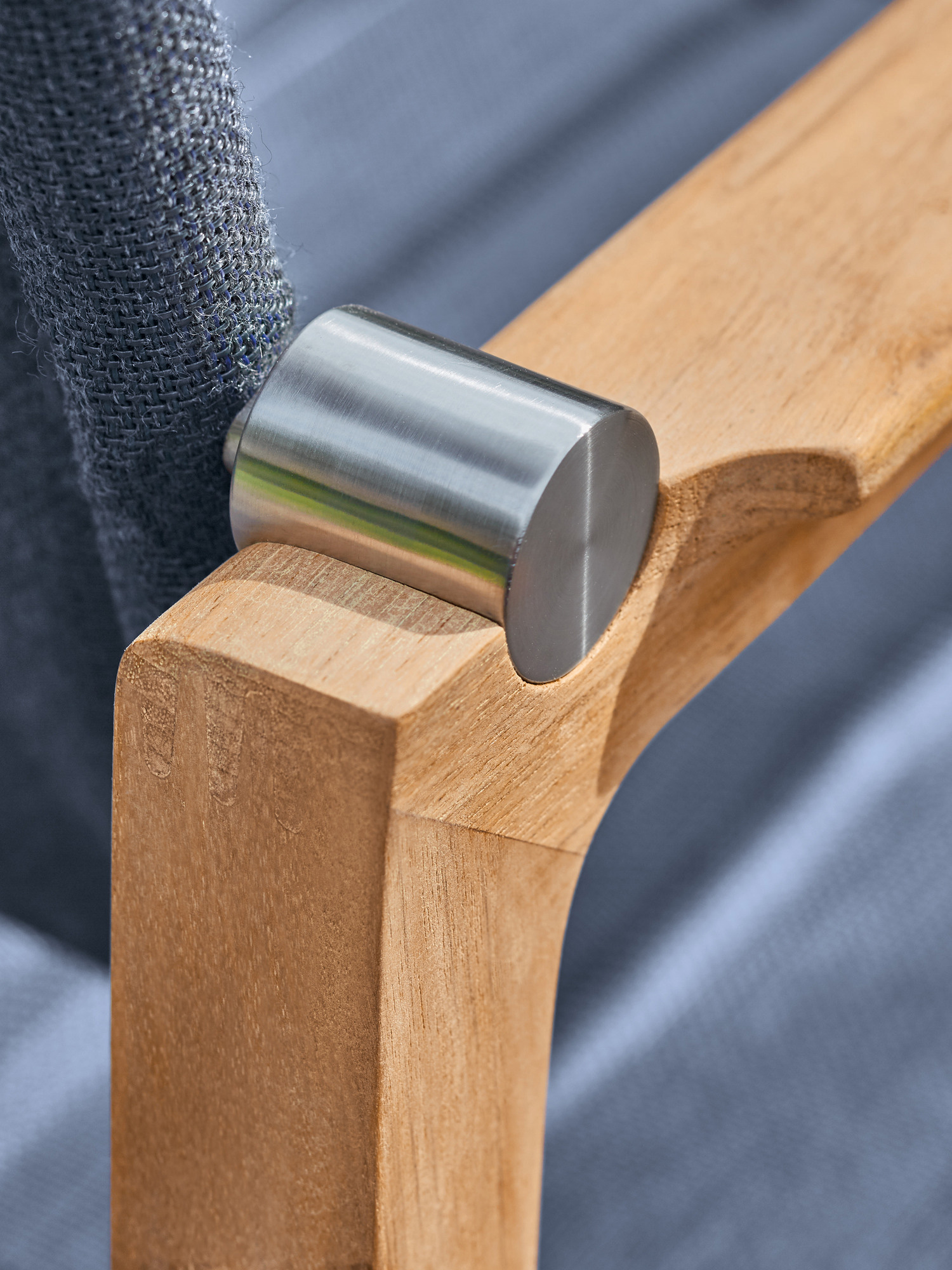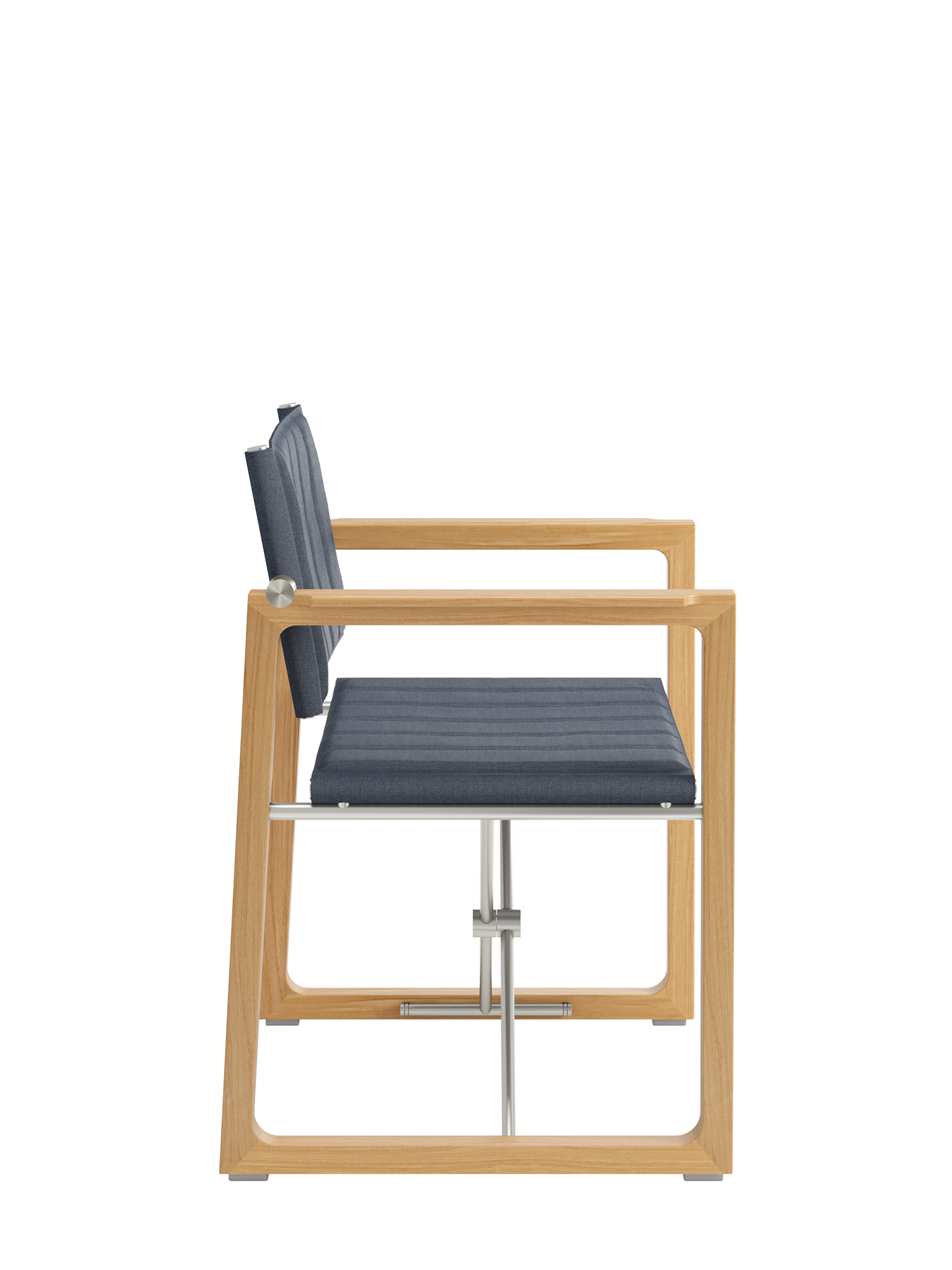 Modern armchairs create an easy-going atmosphere. Linear side elements made of teak frame the seat and back upholstery; a stainless-steel crosspiece connects the purist and extremely comfortable construction. The connectors that allow the backrest to be tilted to a comfortable position are also made of stainless steel.
