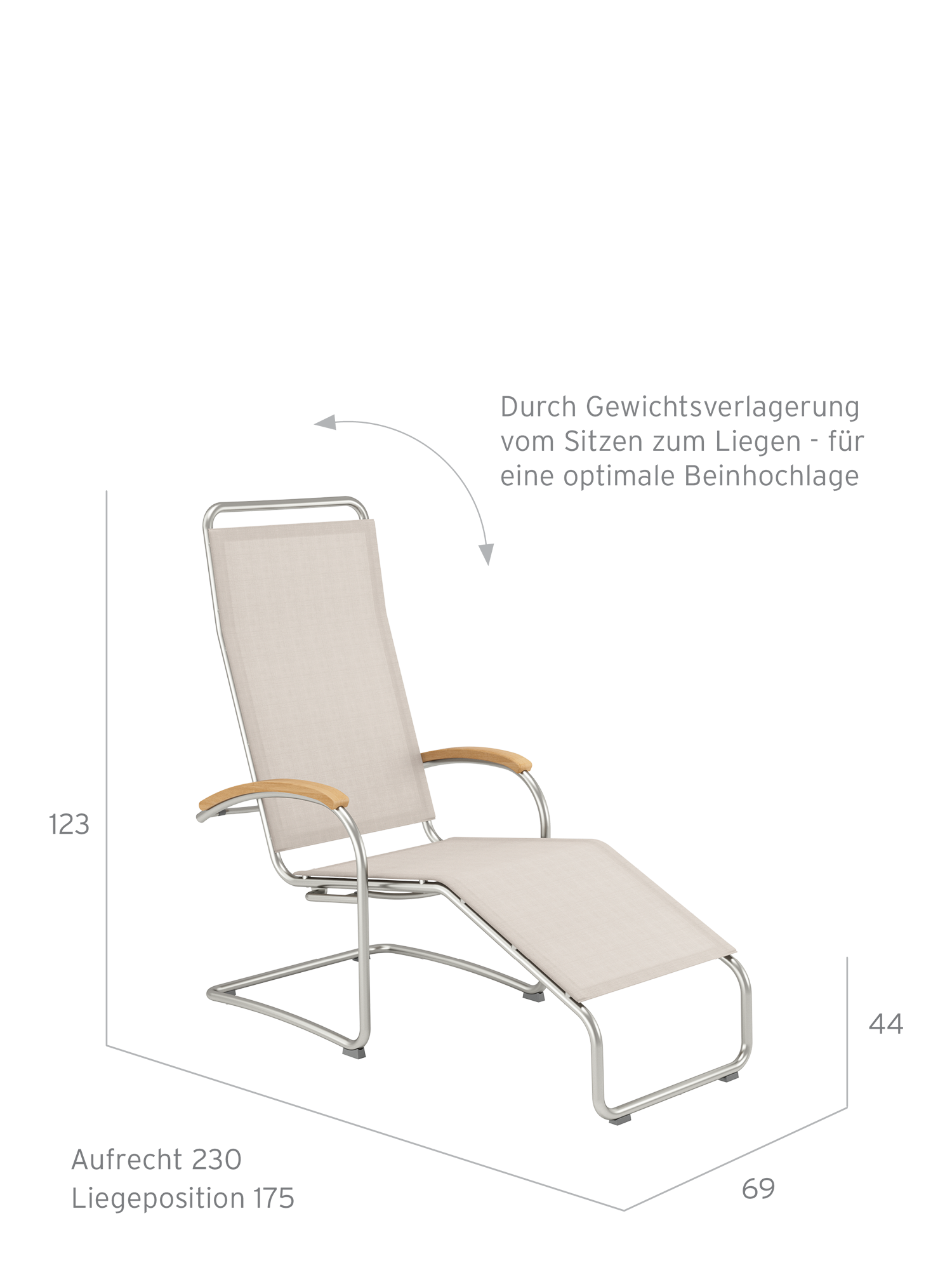 Sitting upright or comfortably leaning back: the gentle swaying movement of the stainless steel frame rests the back and has a relaxing effect. Simply by shifting your weight, you glide pleasantly from a sitting to a reclining position. Renewable gliders of synthetic material are fixed under the frame to protect sensitive flooring. They ensure added comfort: cushions in various colours increase the comfort of the furniture and set fine accents. Please select your desired design from the drop-down menu to the right of the product.