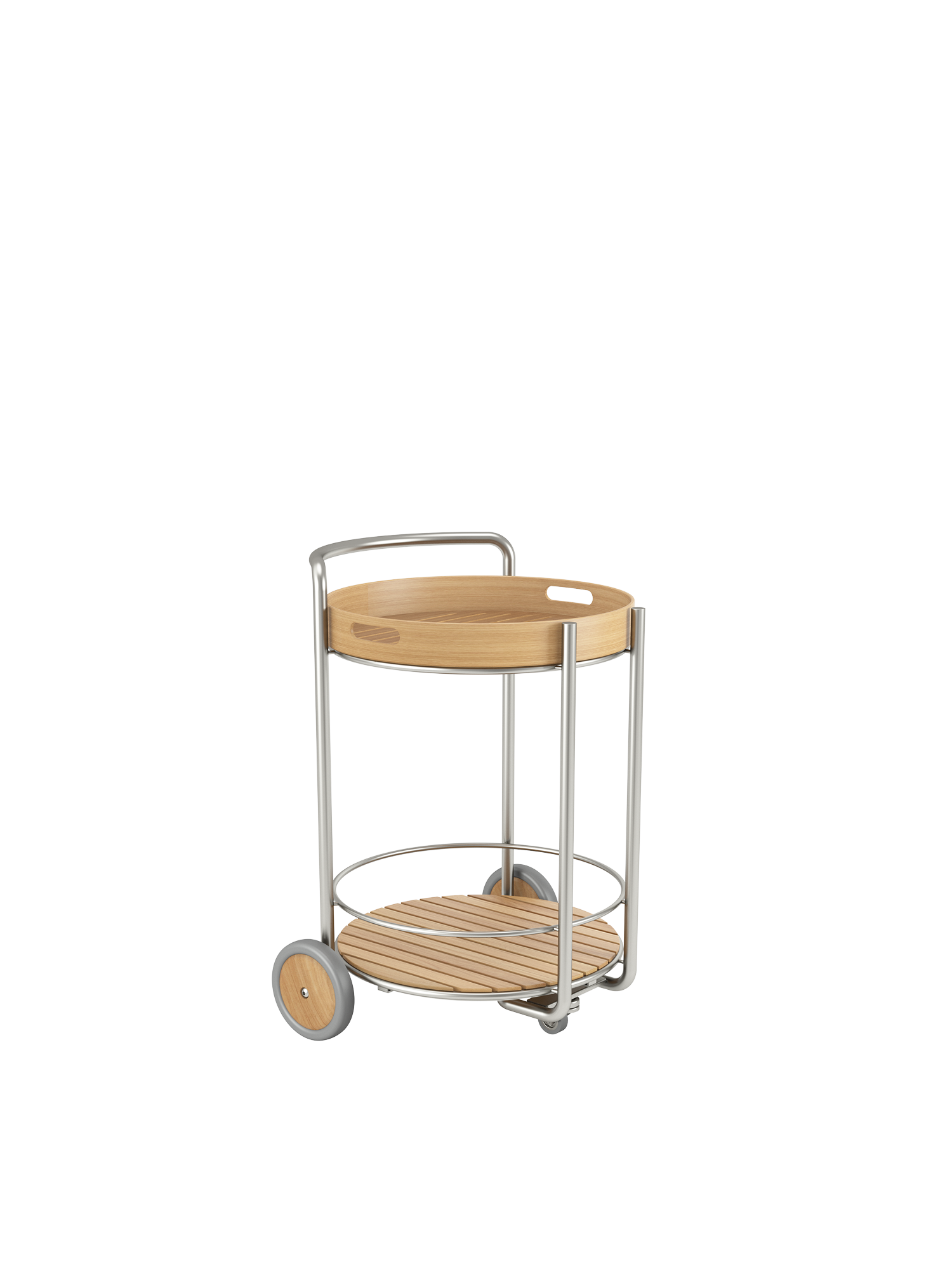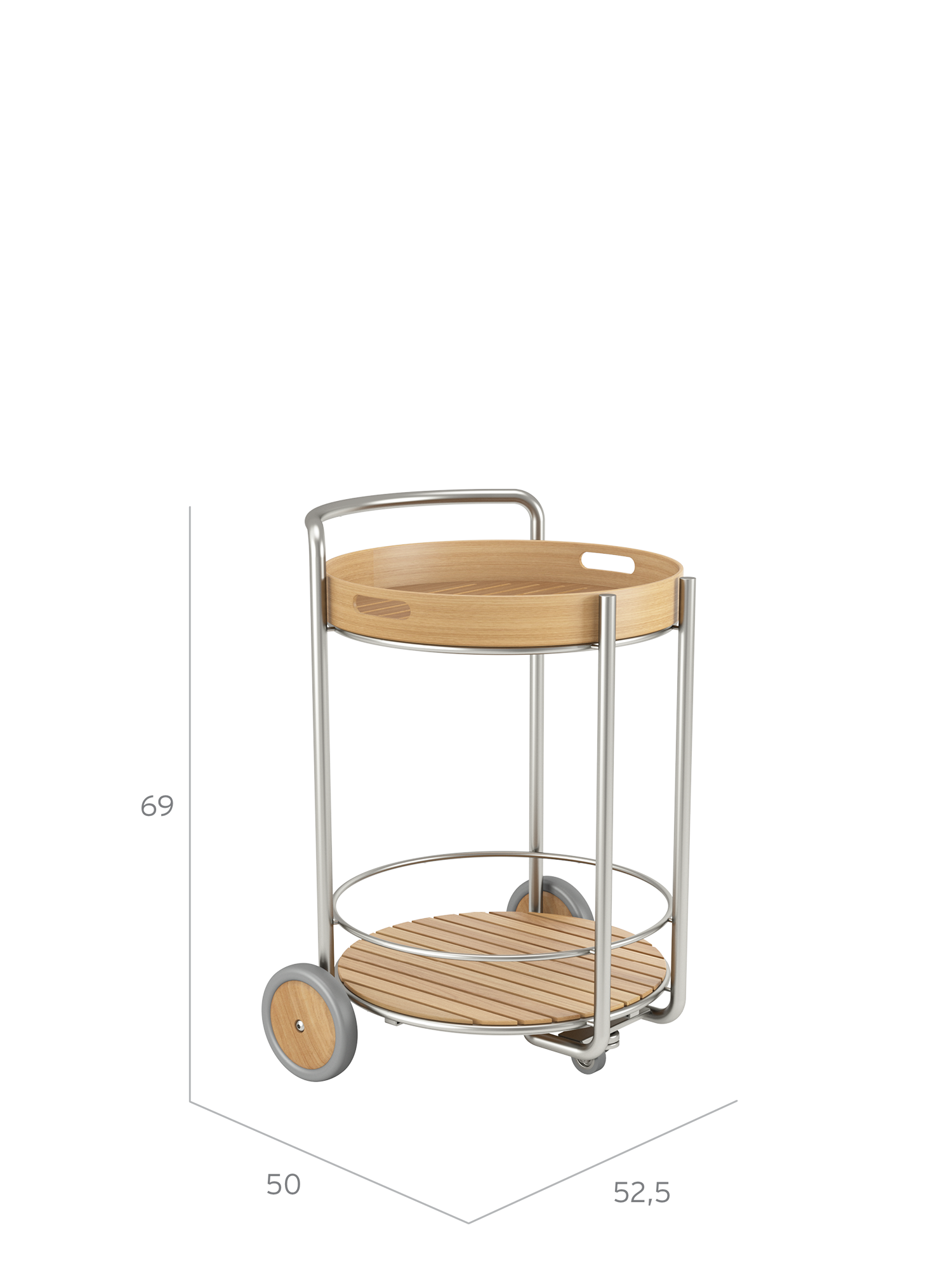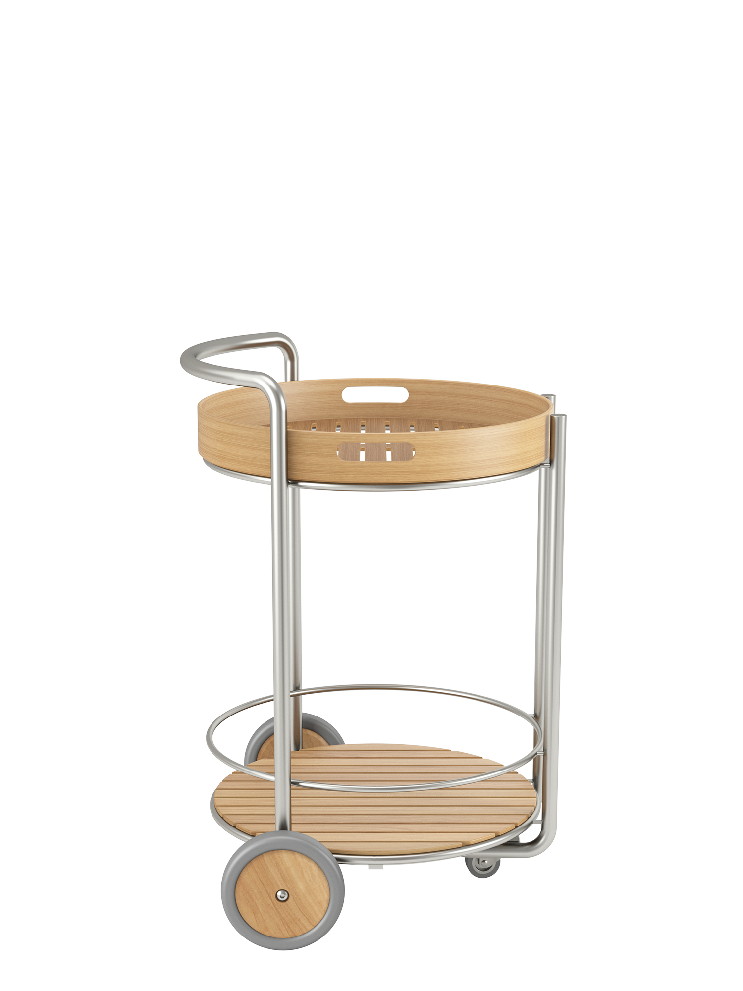 The Bauhaus inspired serving trolley with its classic teak and stainless-steel features is the latest addition to the Bolero series. The top tray is removable, the bottom rail keeps bottles and crockery securely in place. Thanks to two large teak wheels as well as a swivel castor the trolley is easy to transport. The round tray is also available separately (Ref. 2620).