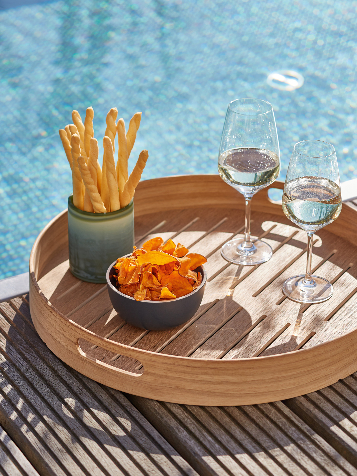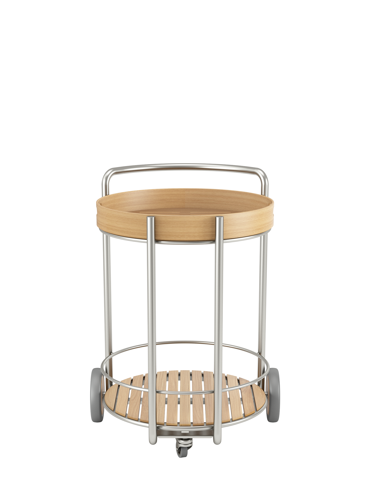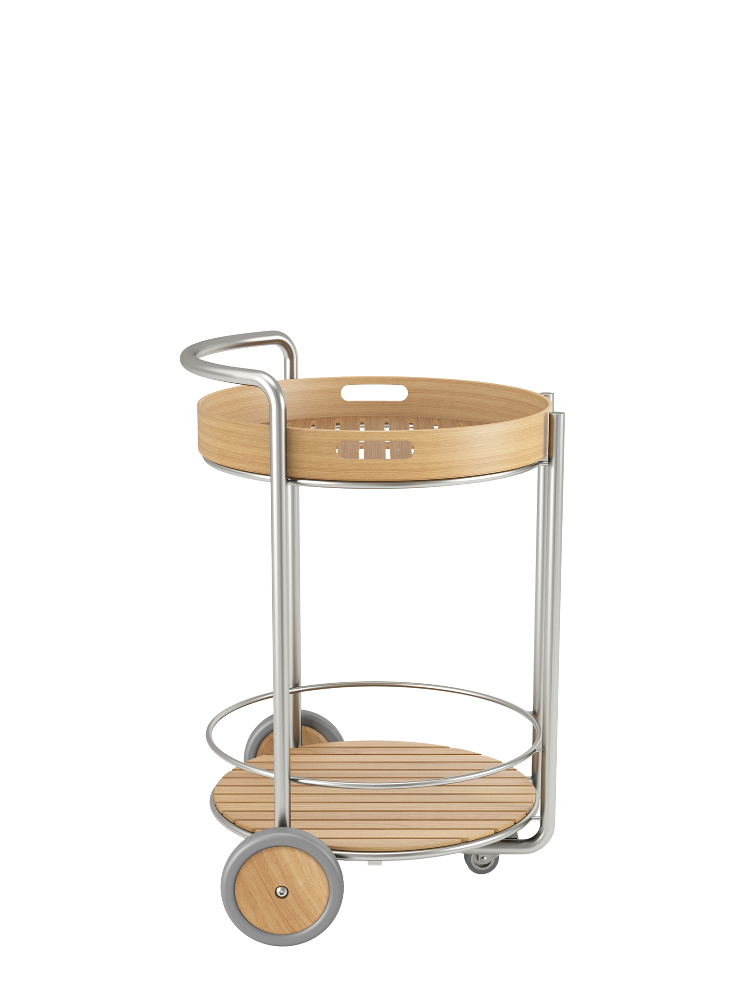 The Bauhaus inspired serving trolley with its classic teak and stainless-steel features is the latest addition to the Bolero series. The top tray is removable, the bottom rail keeps bottles and crockery securely in place. Thanks to two large teak wheels as well as a swivel castor the trolley is easy to transport. The round tray is also available separately (Ref. 2620).