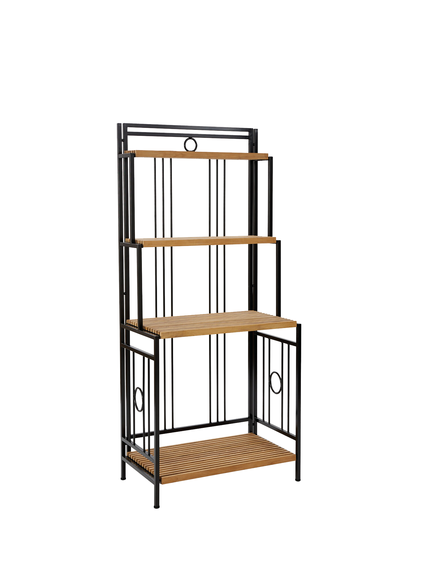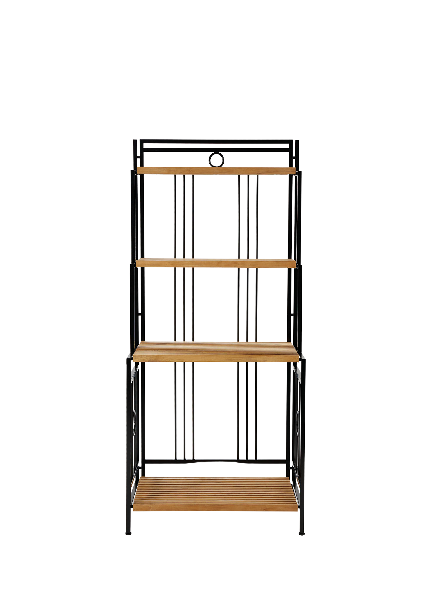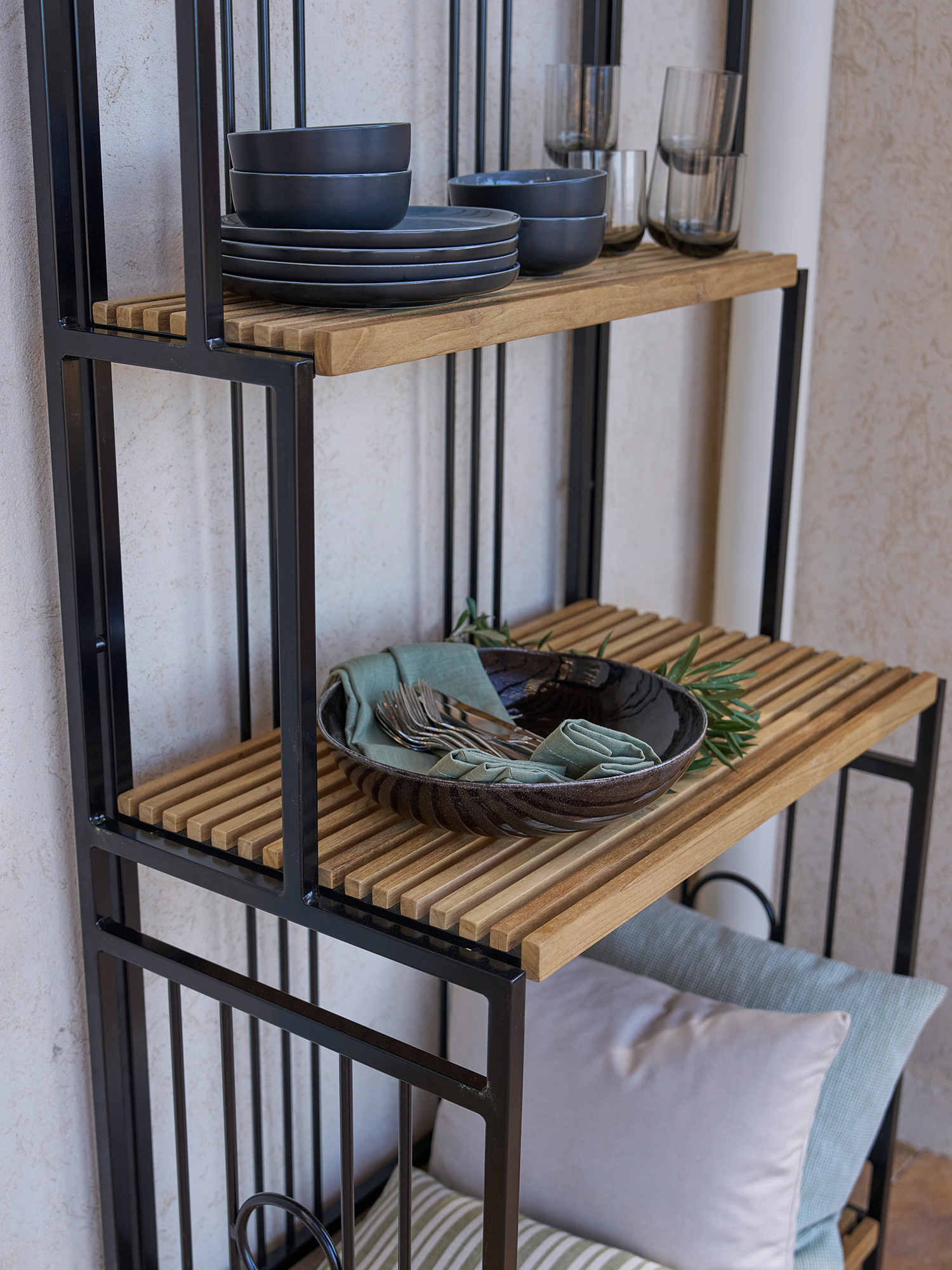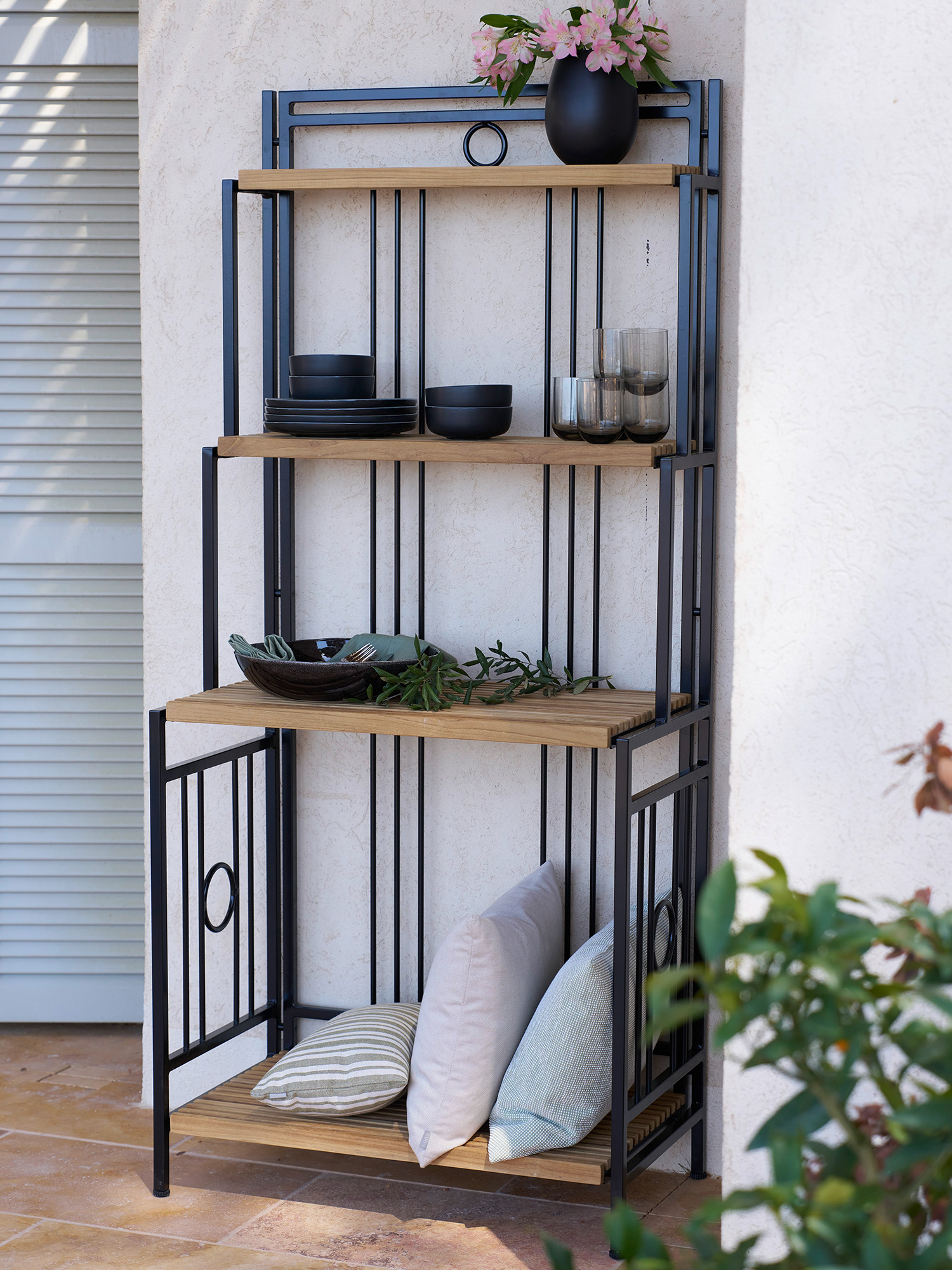 The robust shelf of teak and powder-coated aluminium makes a nostalgic-looking place for necessities and decorative things. Baskets and trays can be fitted on the 45 cm wide shelves, the two smaller ones are suitable for herbs and trailing plants. Four screw-feet take care of uneven surfaces.