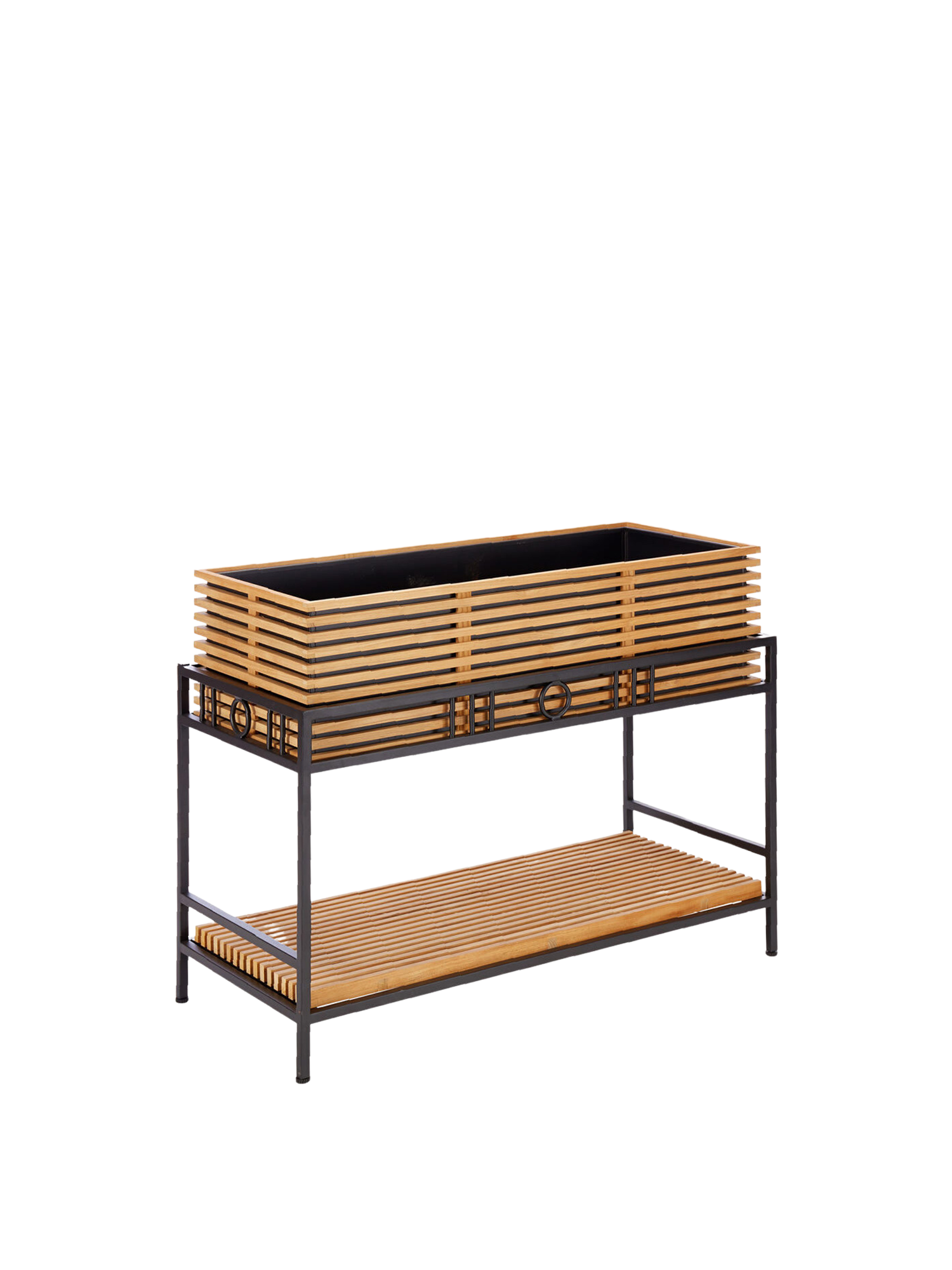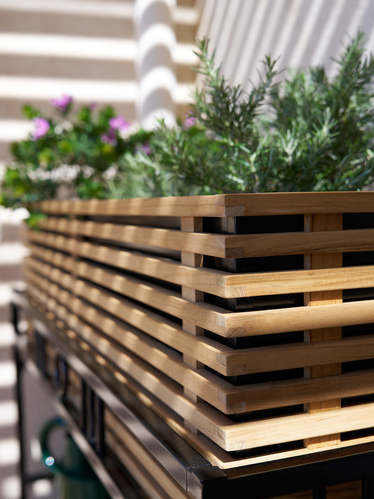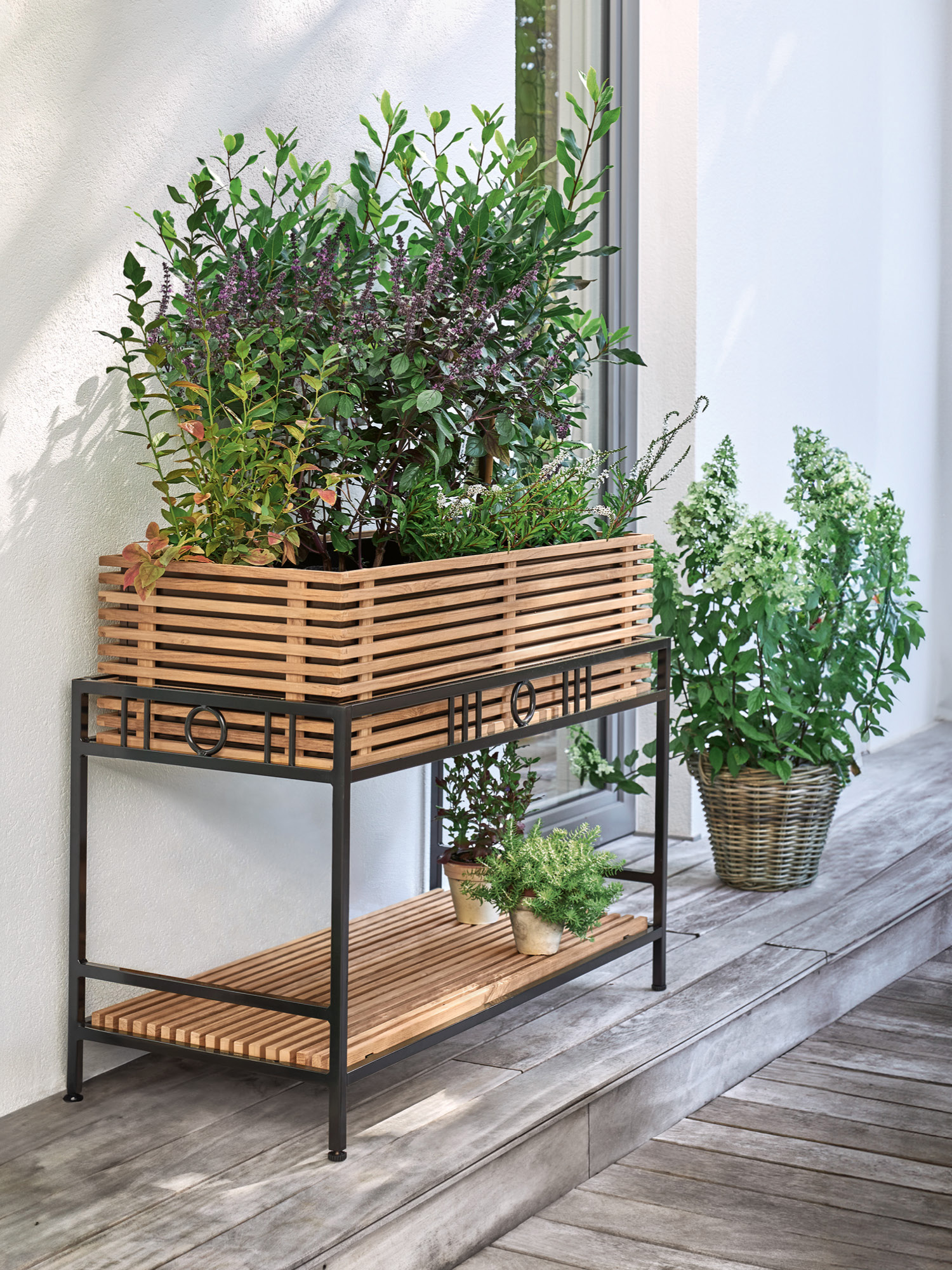 The planters that accompany the Brittany raised bed made from aluminium with a black powder coating offer the best growing conditions. Like the practical shelf one level below, the cover panel is made from massive teak slats. A hidden drainage system in the frame directs excess water to the ground.