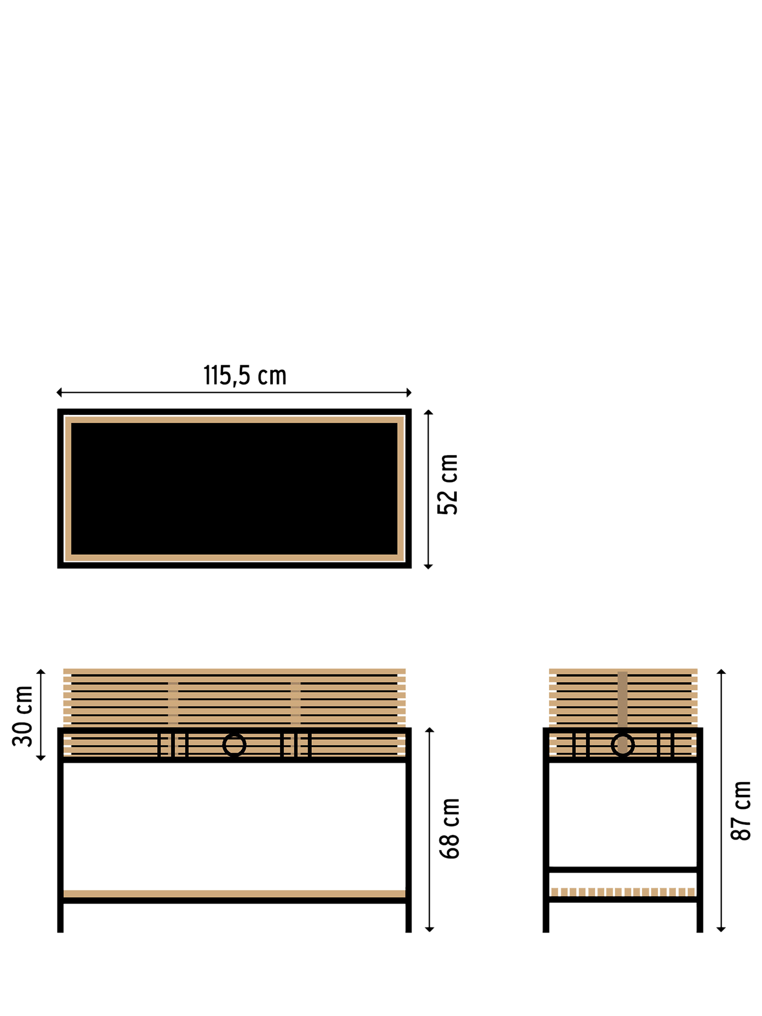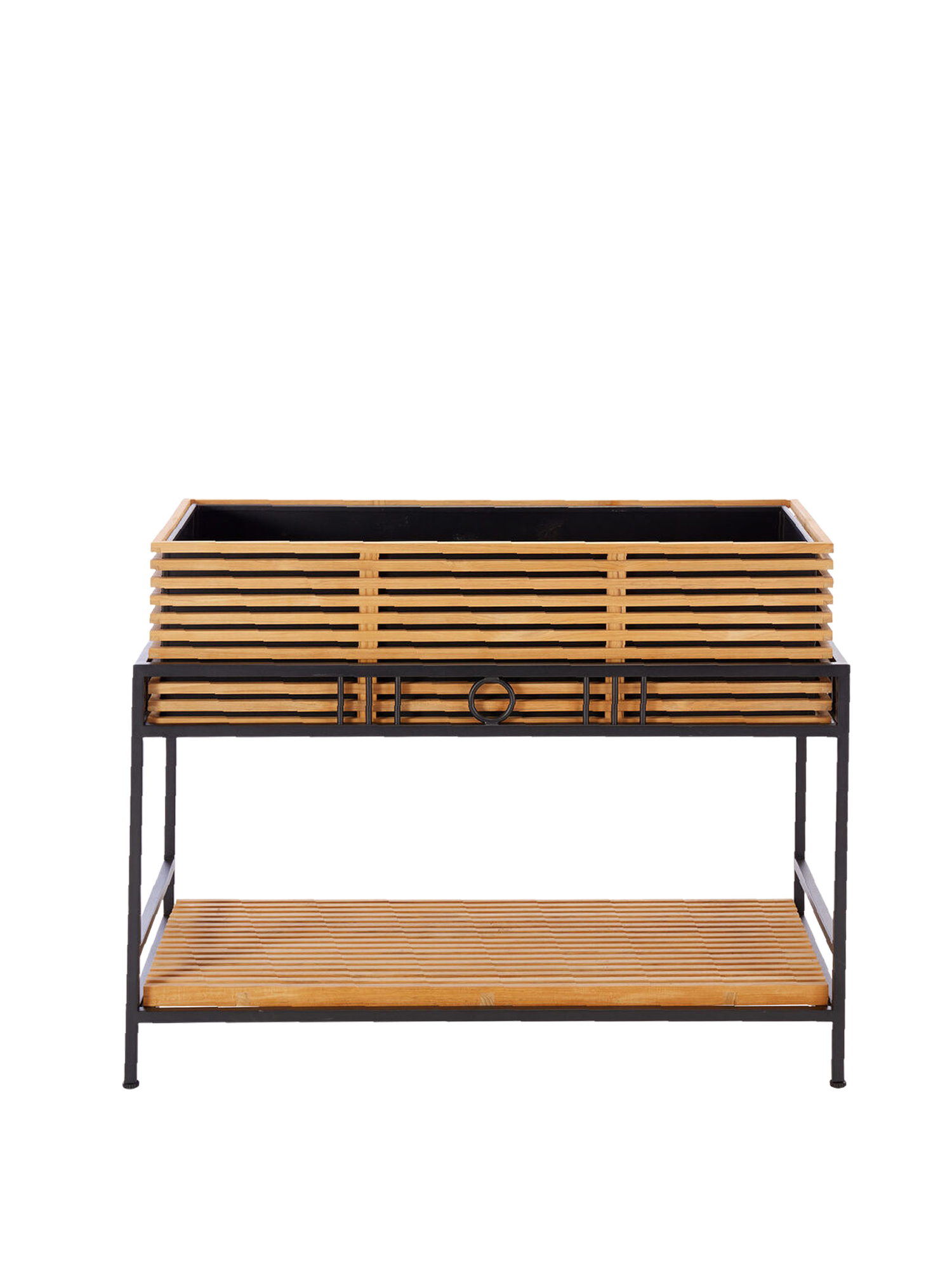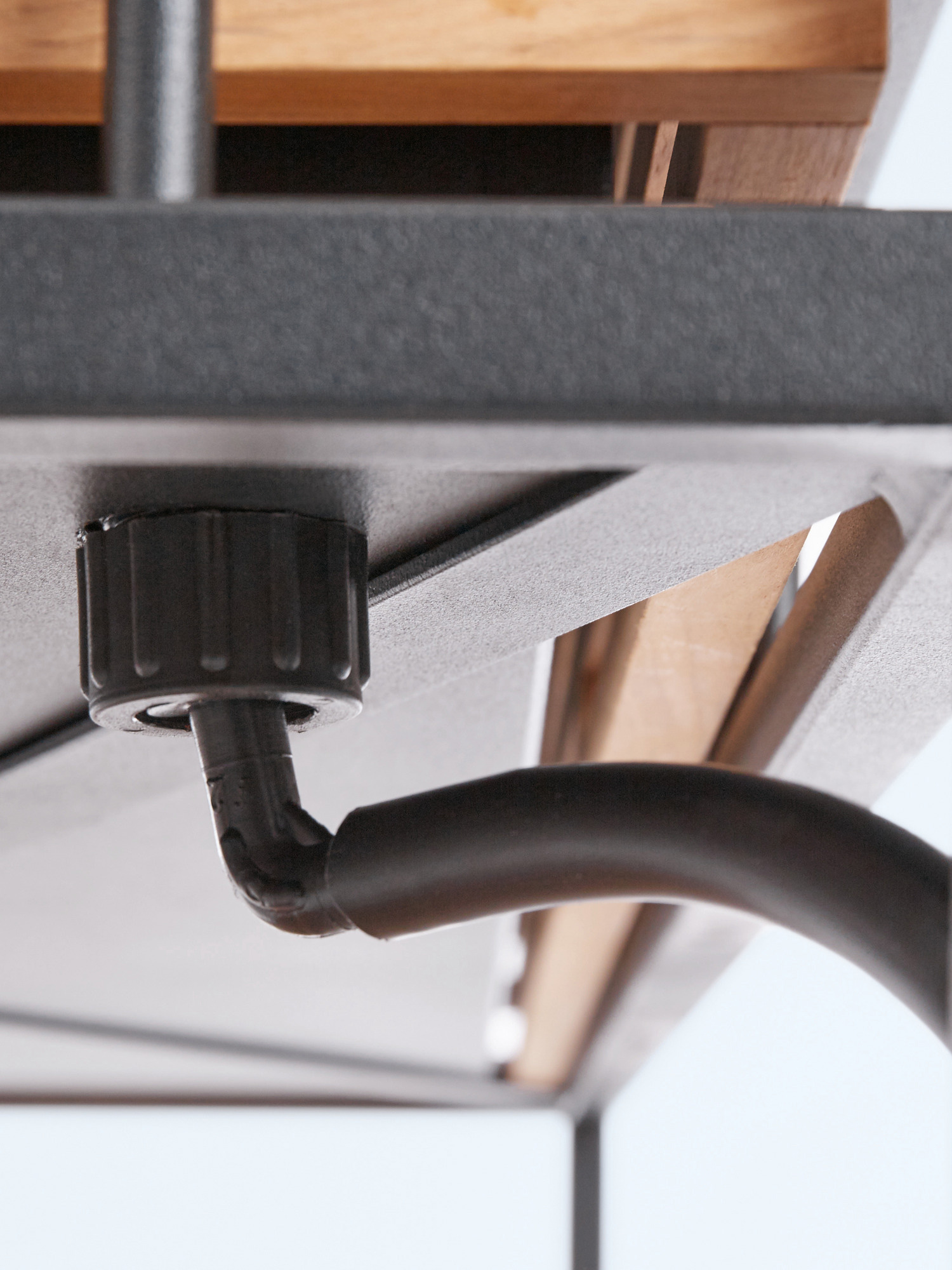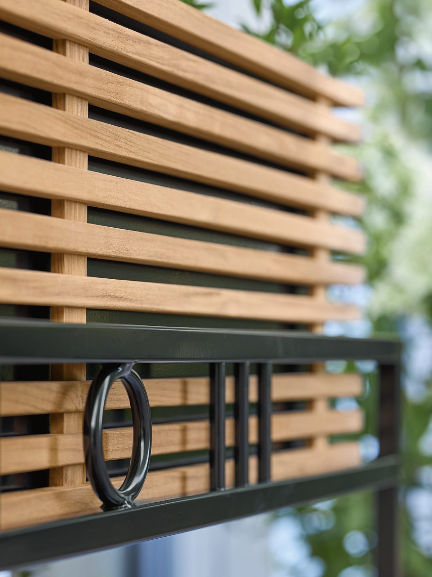 The planters that accompany the Brittany raised bed made from aluminium with a black powder coating offer the best growing conditions. Like the practical shelf one level below, the cover panel is made from massive teak slats. A hidden drainage system in the frame directs excess water to the ground.