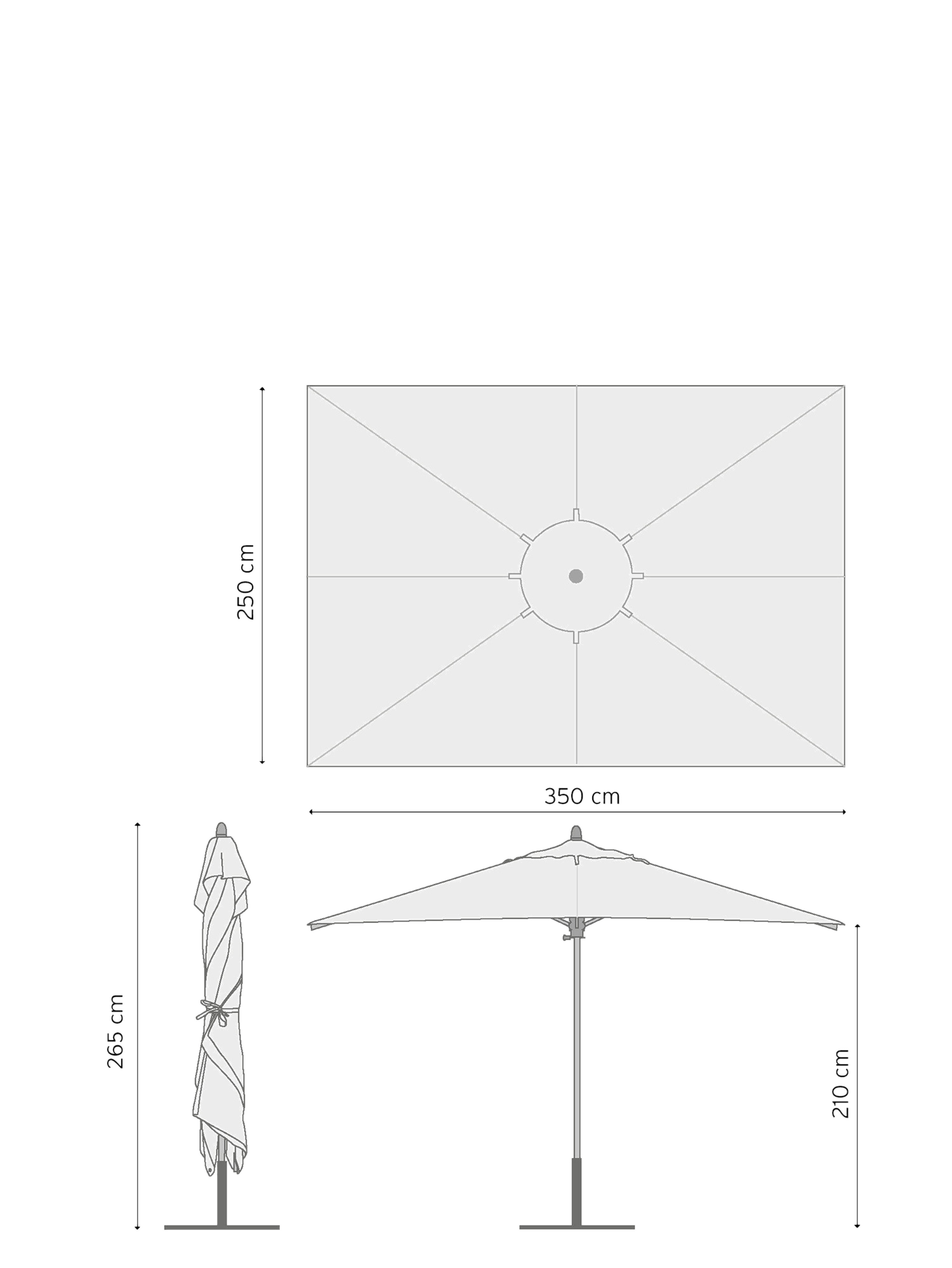 The canopies of our summer parasols are of lightly waterproofed polyacrylic. In the case of Calabria they are fastened to the ends of the ribs with elegant metal fittings. A wind-vent provides the canopy with additional stability.