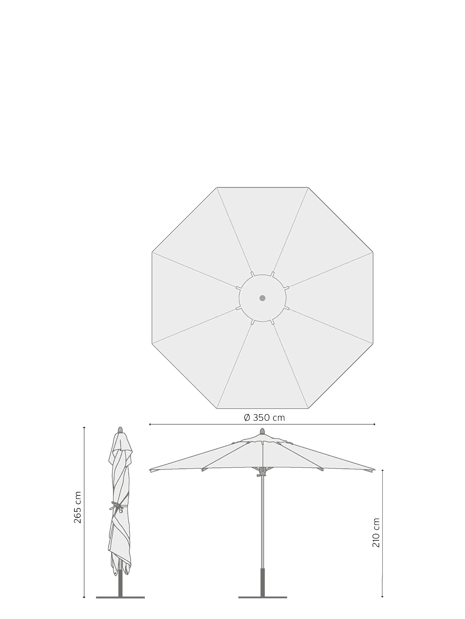 The canopies of our Calabria parasols are of lightly waterproofed polyacrylic. In the case of Calabria they are fastened to the ends of the ribs with elegant metal fittings. A wind-vent provides the canopy with additional stability.