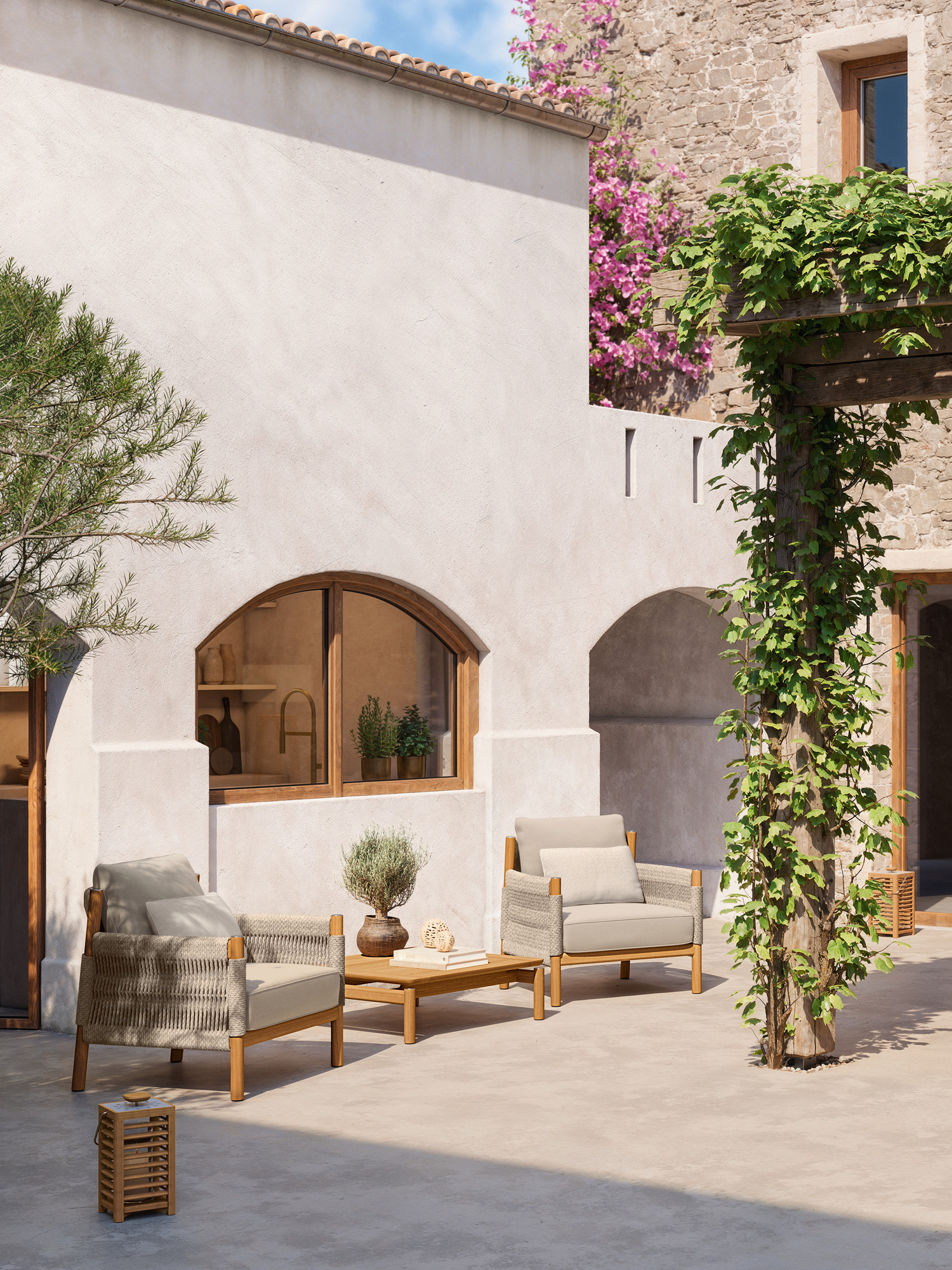 Two low tables in different formats offer space for useful things and decorative objects. One rectangular, with confident width, the other square and compact. They are made of high-quality plantation teak. A high, round side table complements the series. All tables can be found under "Related products" further down this page.