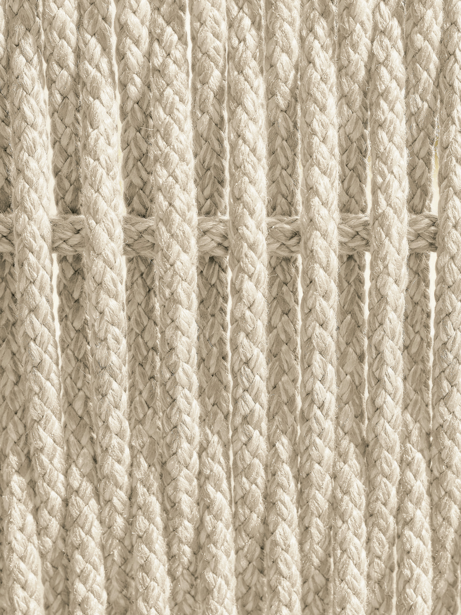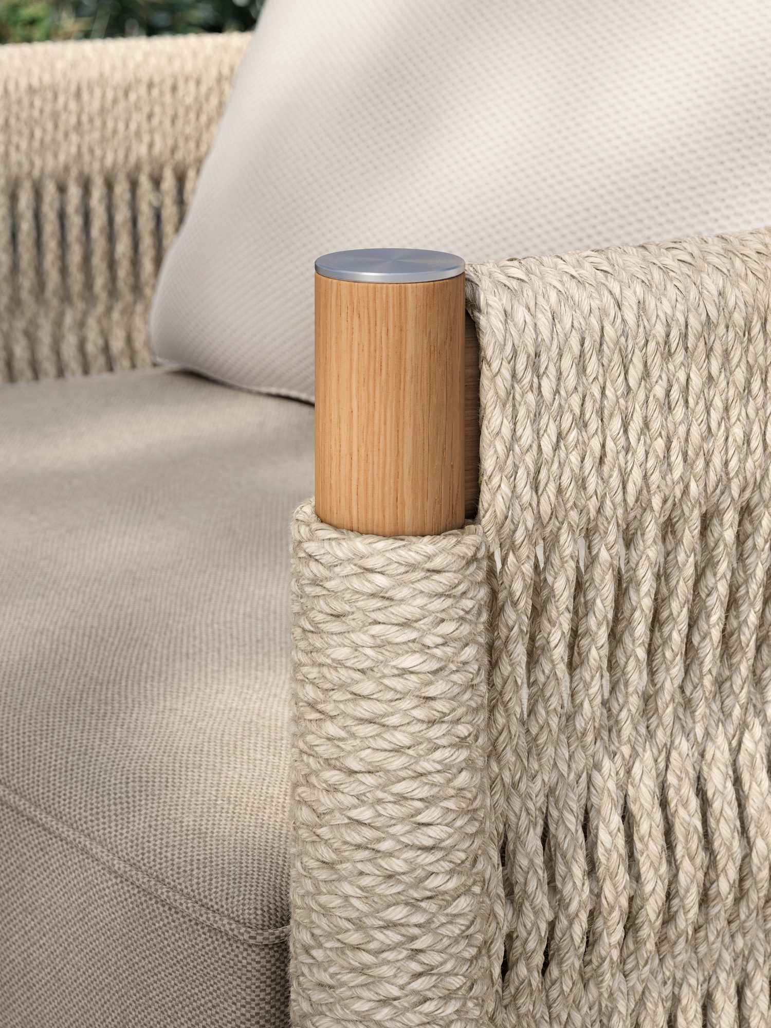 Finely turned teak wood incorporates classic aspects, stainless steel caps set subtle accents, Weatherproof cord, in graceful shades of beige and beautifully woven into a wonderfully supple and gorgeous covering, creates elegant splendour. The high-quality material is made of polypropylene with a polyester core.