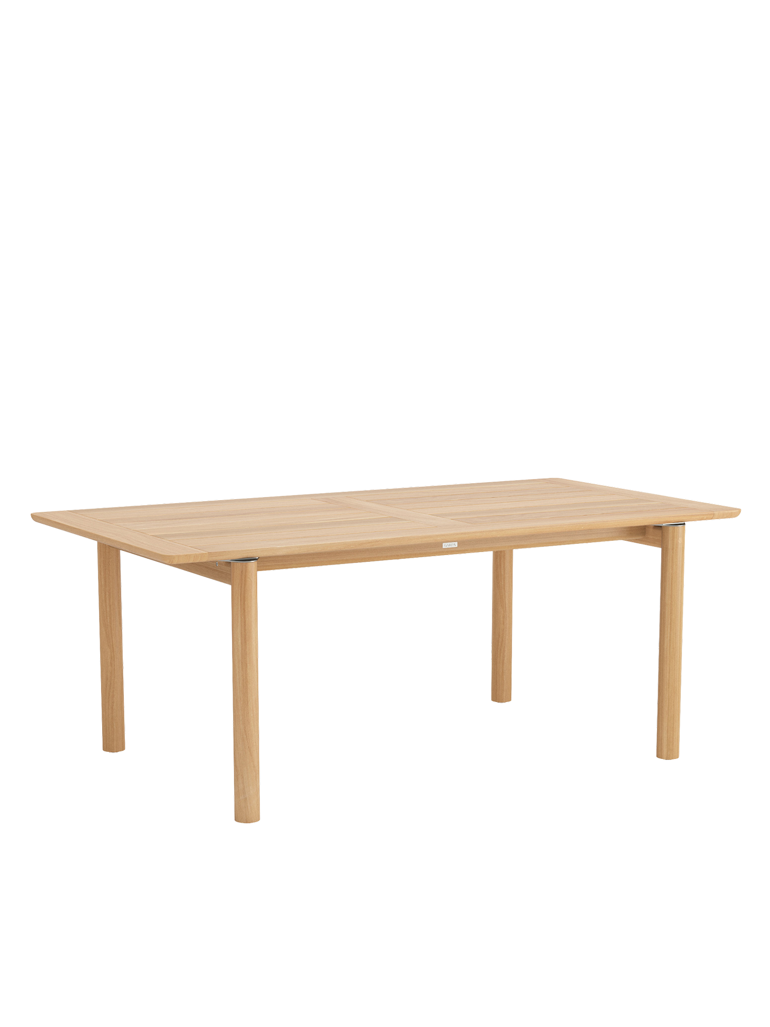 Finely turned legs with elegant stainless steel caps create the almost floating appearance of the solid table, which with its simple elegance, forms the handsome centrepiece of any dining party. The succinct design with wide teak slats and smoothly rounded contours, simultaneously conveys lightness and stability. Height adjusters on the legs level out any unevenness in flooring.