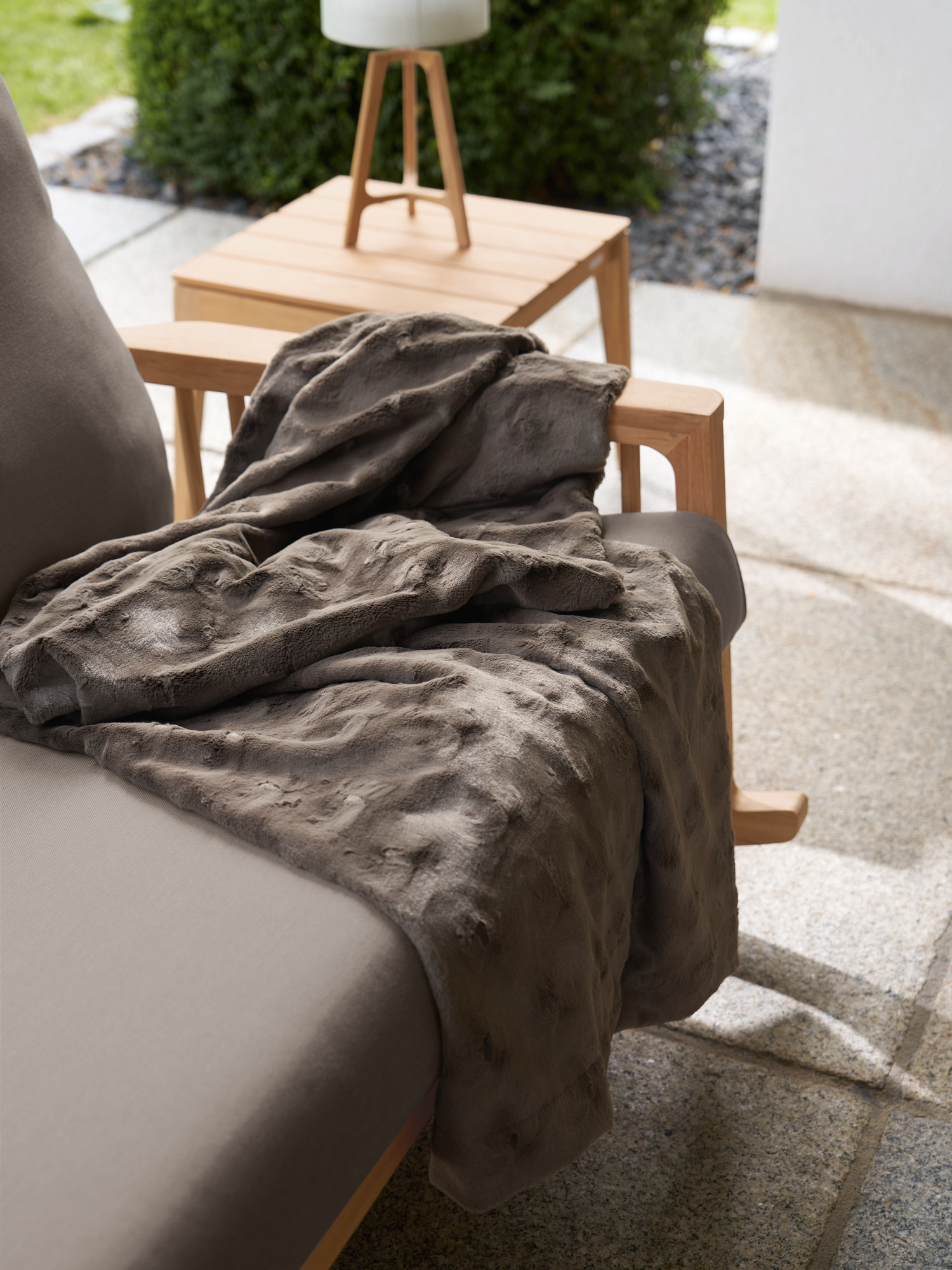 The soft, high-quality faux fur of the Chalet Plaids is produced by European manufacturers and is made with the utmost care from selected high-tech polyester fibres. All materials are easy to care for and are washable at 30°C. Please use a gentle down detergent. The Chalet plaids are not intended for continuous outdoor use.