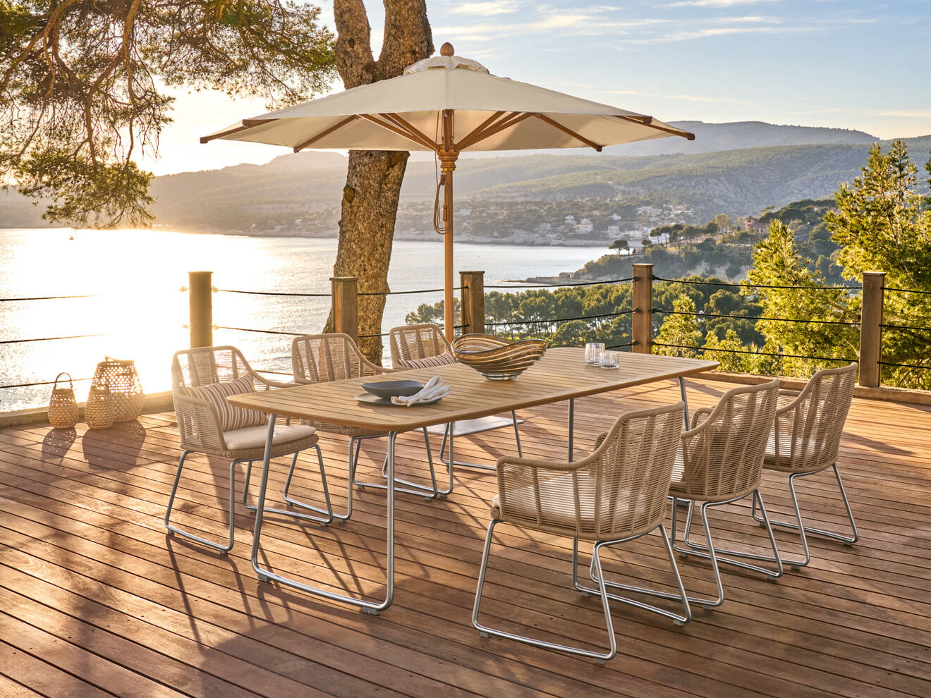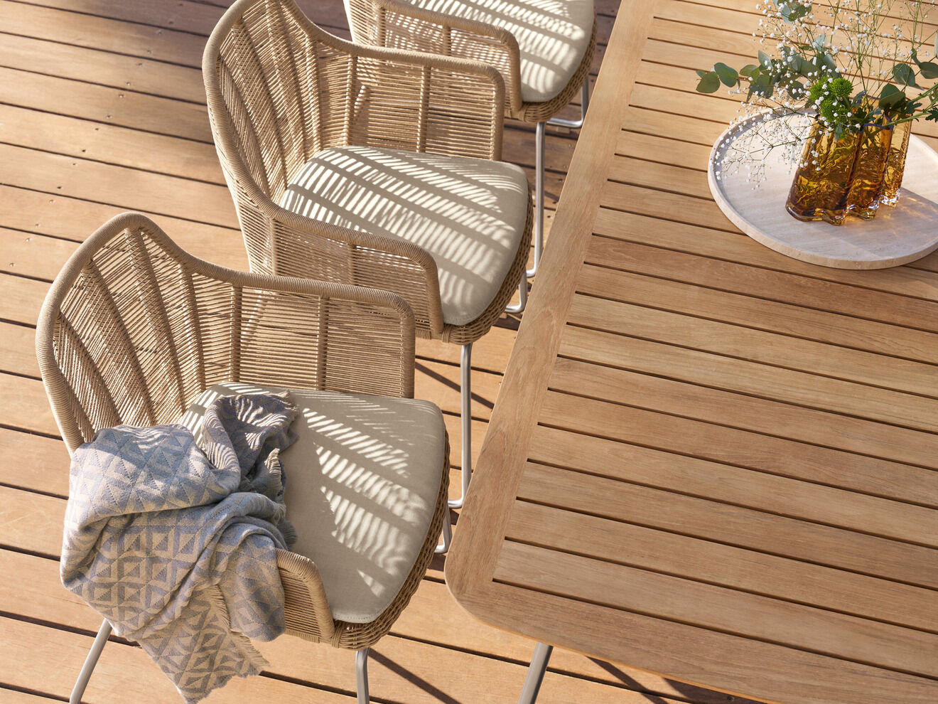 The elevated armrests trace gentle curves and offer plenty of space for extended dining. Their dimensions are precisely designed to allow the chairs to be easily slid under the table top after festivities. Light filters softly through the linear woven pattern, the vertical struts of the double-sided backrest follow the inclination of the body and promise immediate tangible comfort. Dining tables in two sizes have been specifically designed for Amari. The slim table tops made of weatherproof teak or synthetic resin are supported by stainless steel runners that have the same shape as those of the armchairs.