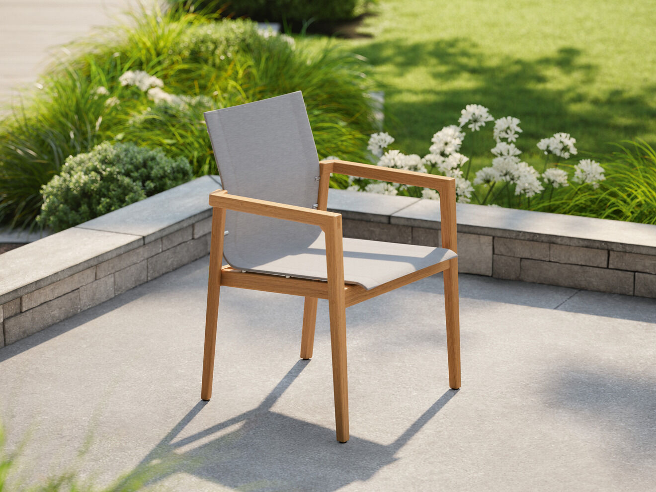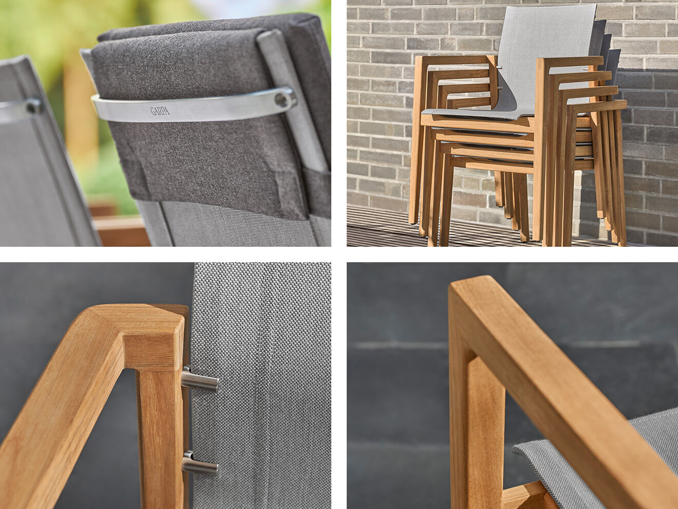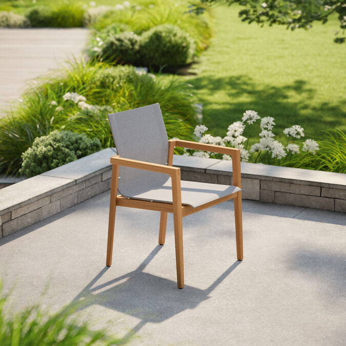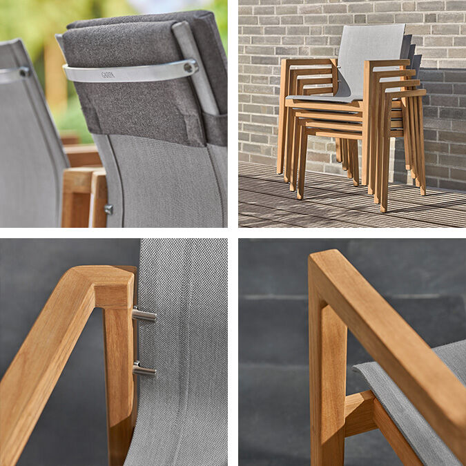 Open, straight lined armchairs bring carefree poise to urban settings, Mediterranean gardens or formal lawns. Whoever takes a seat will feel the warmth of teak wood and the welcome support of tangibly soft fabric. Edges and transitions are finely sanded and polished. The seats seem to float over the frames, held almost invisibly by a stainless steel mounting.