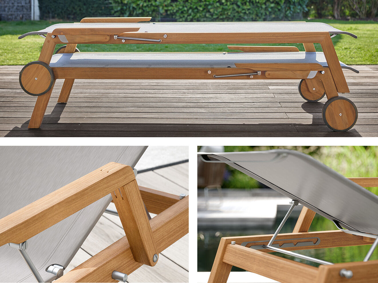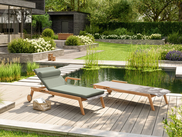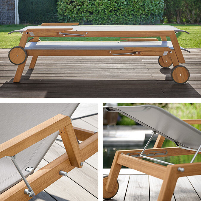The clean, smooth contours of the teak lounger support a stainless steel frame with polymer fabric covering. The comfortable armrests can be pushed back for easy access. The backrest has, like the chairs, the structural design element of a stainless steel bar, and is adjustable to six positions. The lounger rolls into place on wheels and is also stackable.