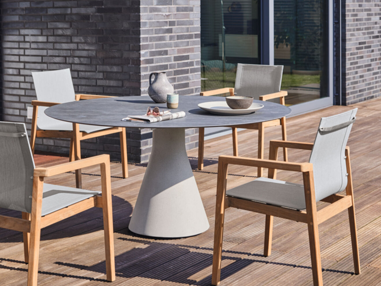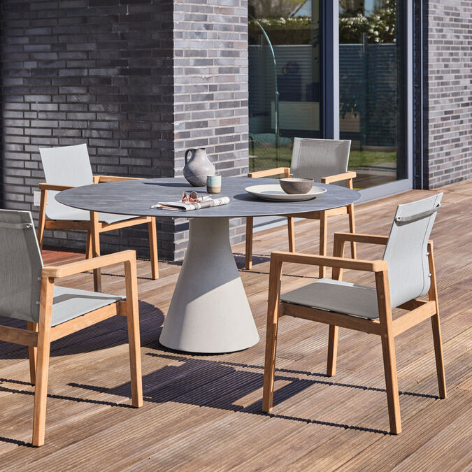 A shared feature of the Namur tables is the conically shaped central support, which provides agreeable legroom. The refined combination of materials consisting of lightweight concrete and ceramic top, not only sets up an arresting new interaction between teak and stainless steel, it also creates a harmonious link with many other collections.