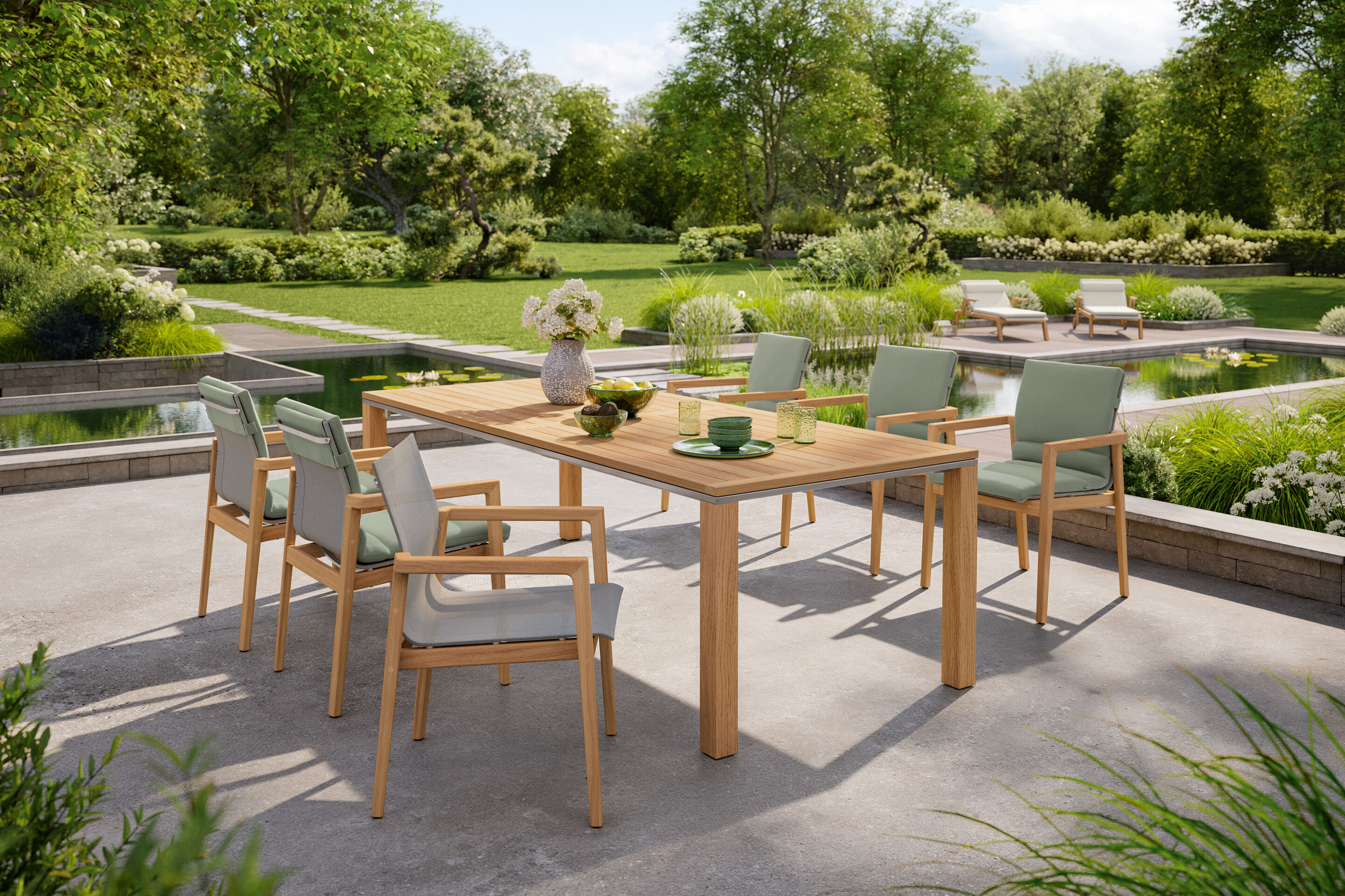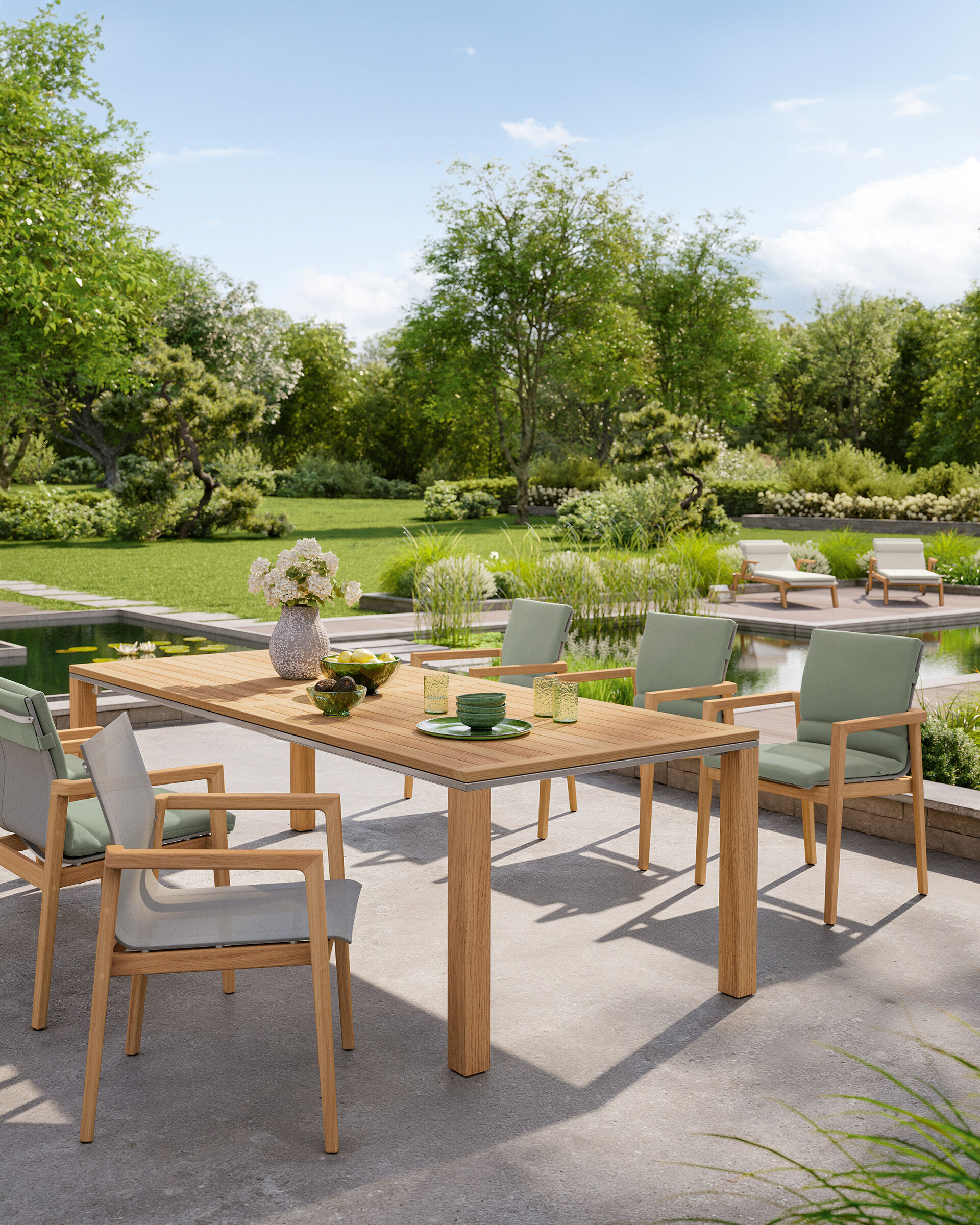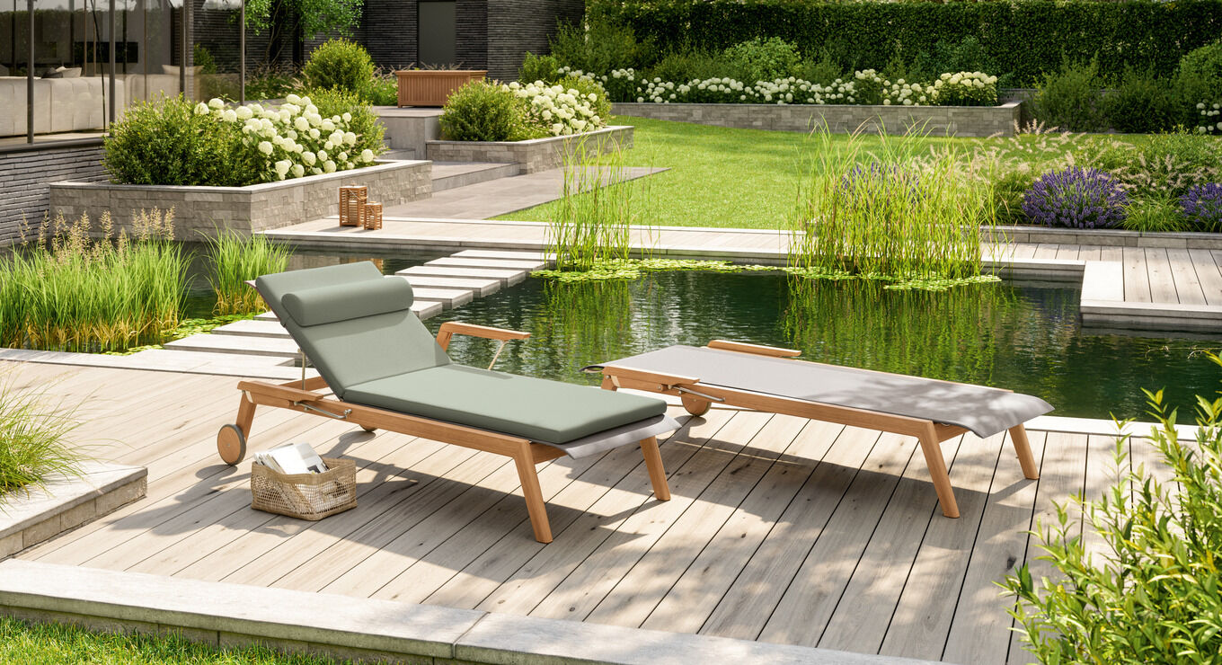 On the sun-drenched terrace, classic teak and modern fabrics combine their qualities: airy, lightweight armchairs create a vibrant sense of space.