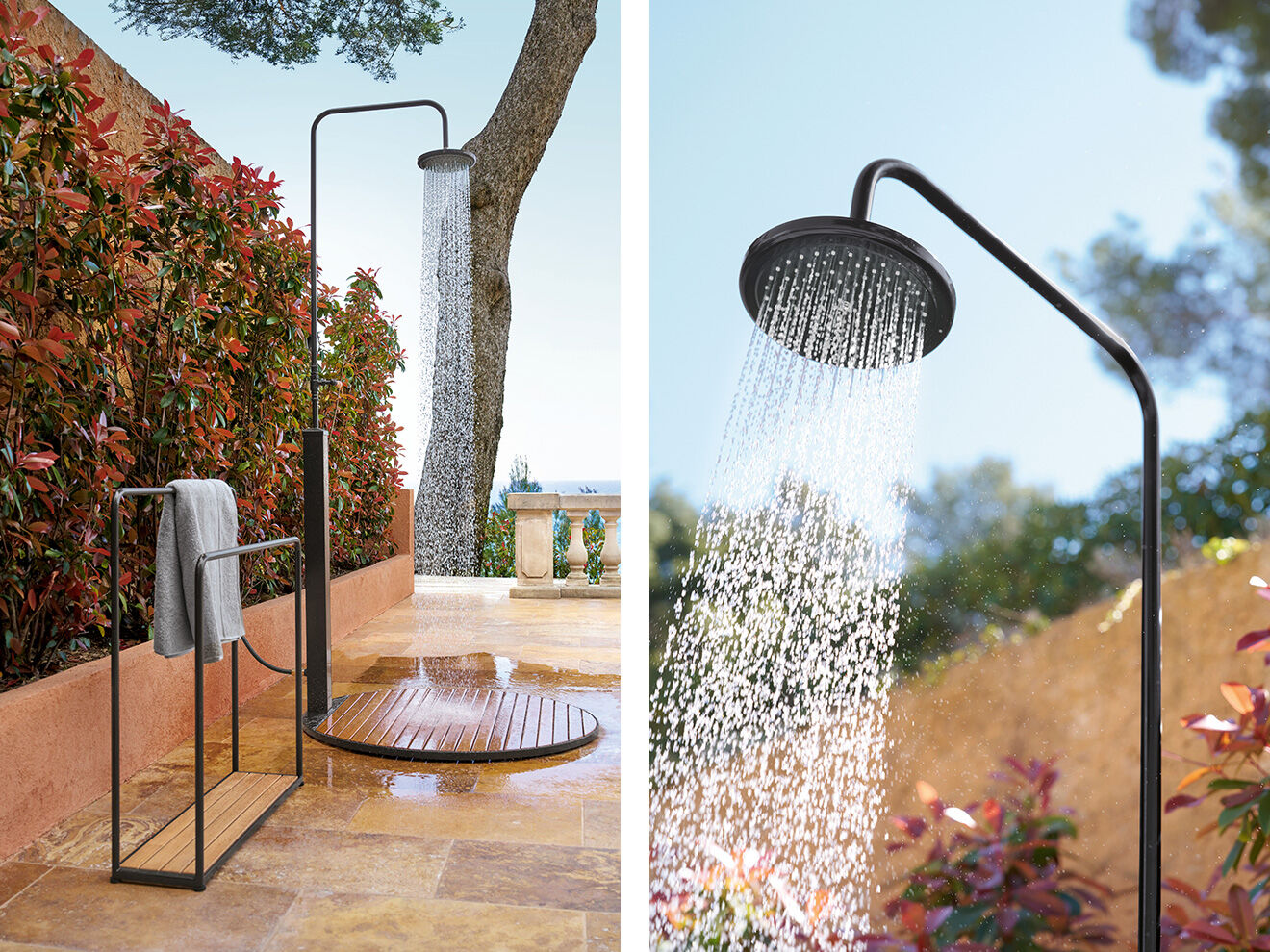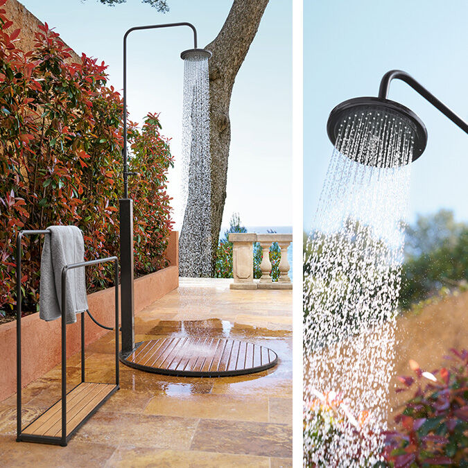 Delightful water feature: the elegant shower combines classic design with the latest technology. The circular base, made of teak and bound in a steel band, ensures secure footing, the water flow can be regulated with the teak-handled lever. For connecting, all that is required is a tap and a standard garden hose. The Fontenay towel rail, with a ground plate made of plantation teak, is the perfect addition to all variants.
