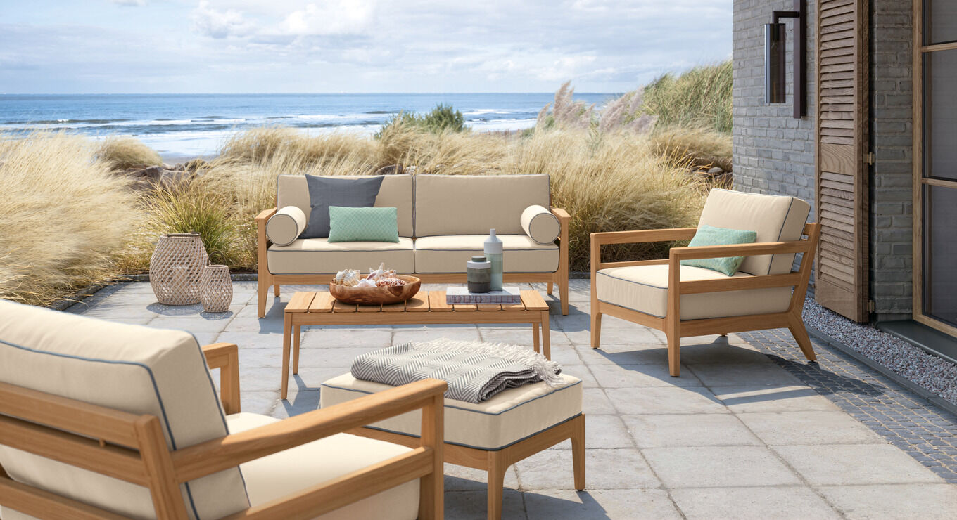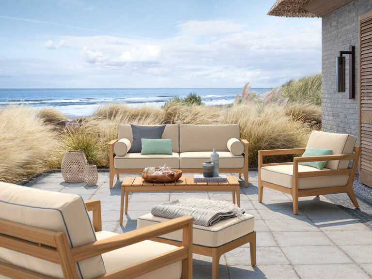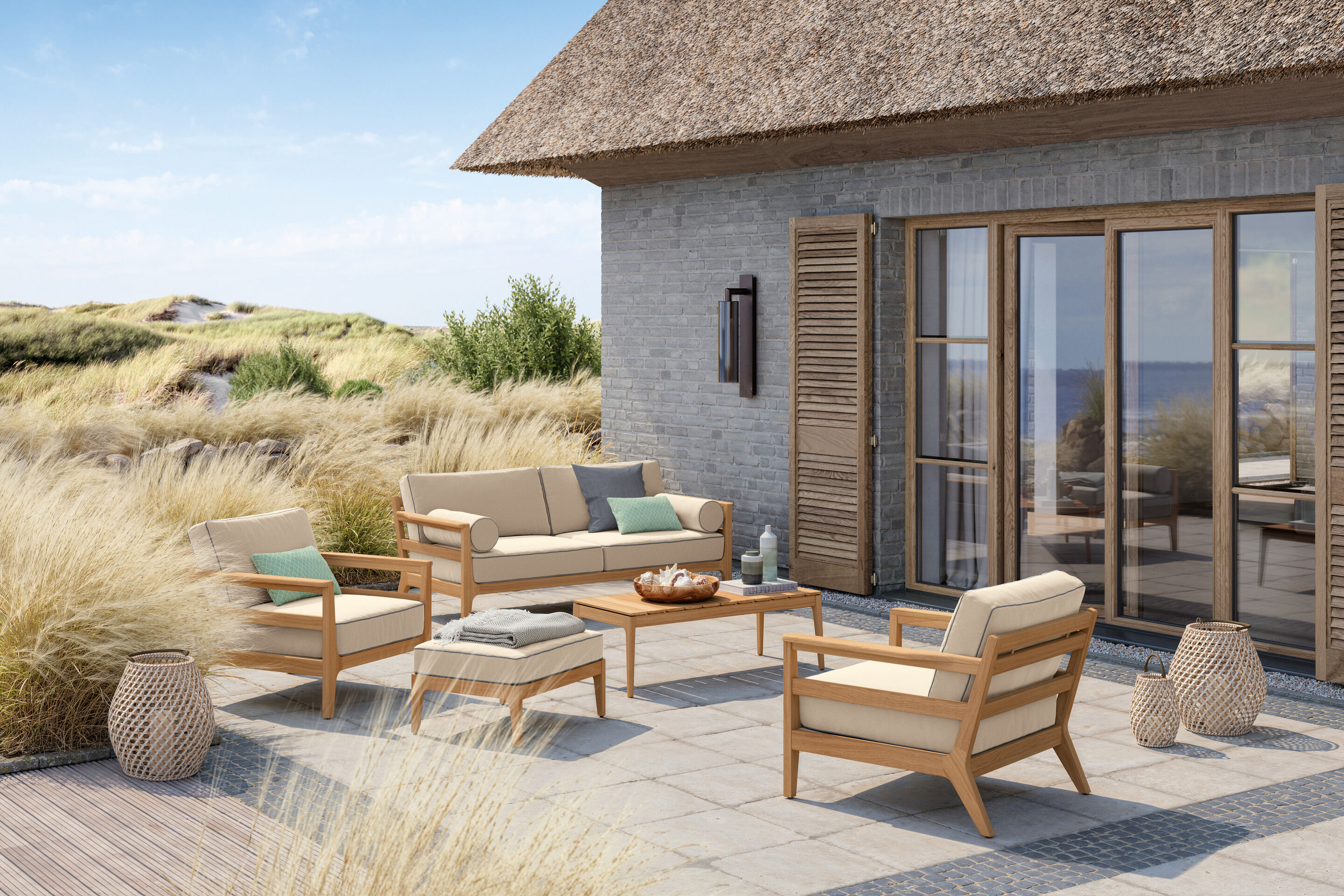 Drop anchor, enjoy the fresh air, and let your thoughts turn to a stroll by the shore or a sailing trip over sparkling waters: lavishly upholstered teak furniture in lounge format evokes maritime themes.
