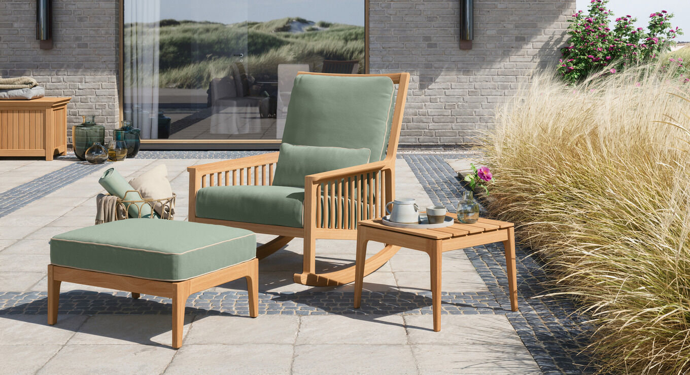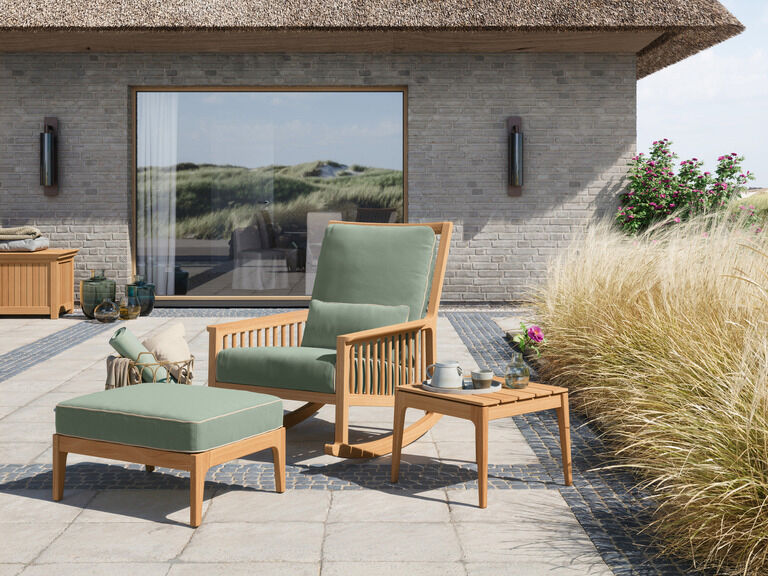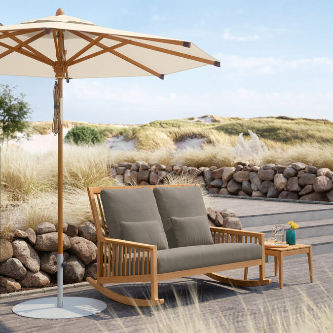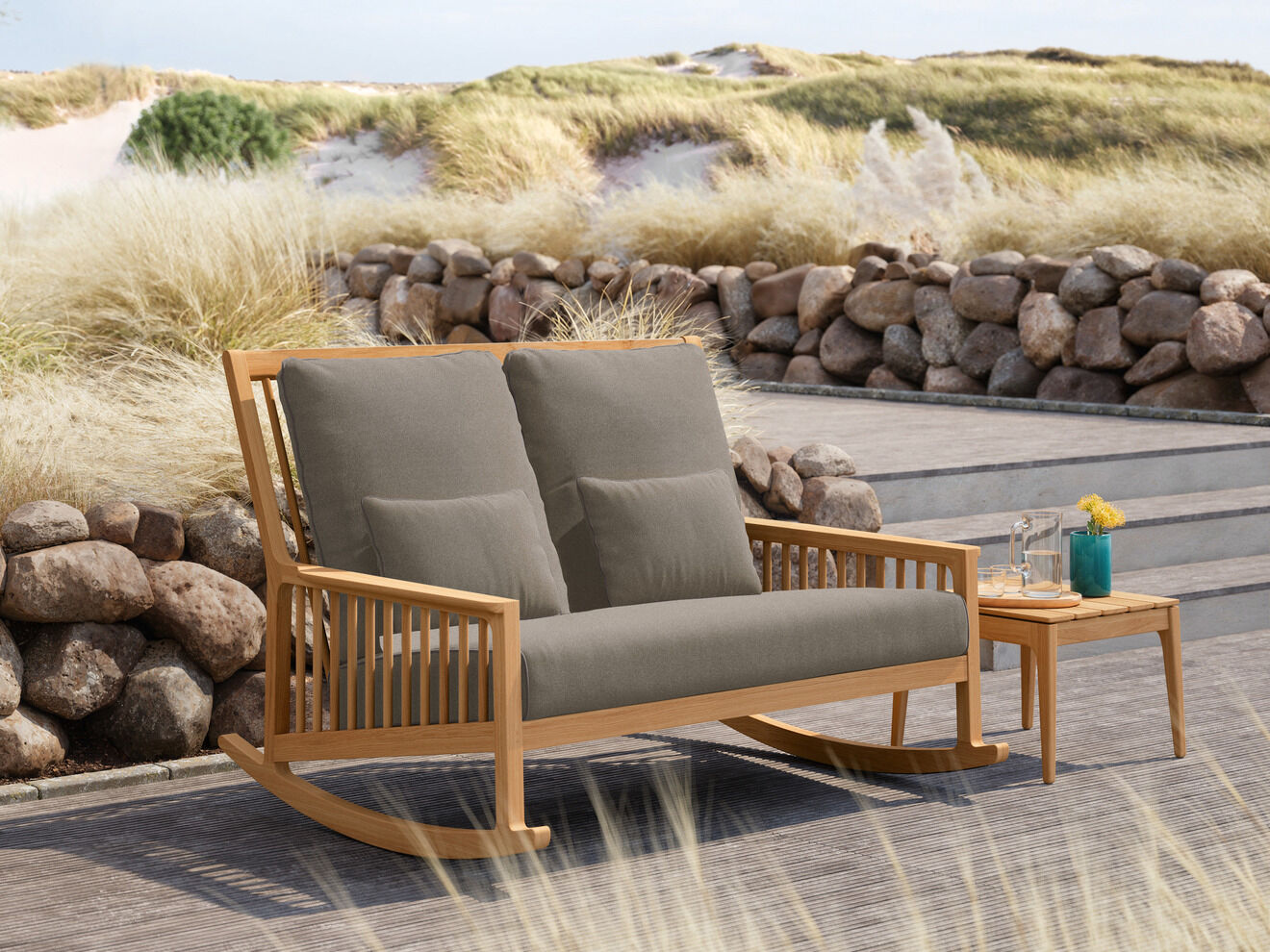 Lean back and enjoy a tranquil feeling of security: the teak furniture on runners extends a warm welcome to one and all. The rocking chair and two-seater are made for relaxing moments and the enjoyment of shared comfort, with a shoulder-high backrest and pleasantly deep seating. Classic teak provides the necessary ground contact, elegant design the desired weightlessness.