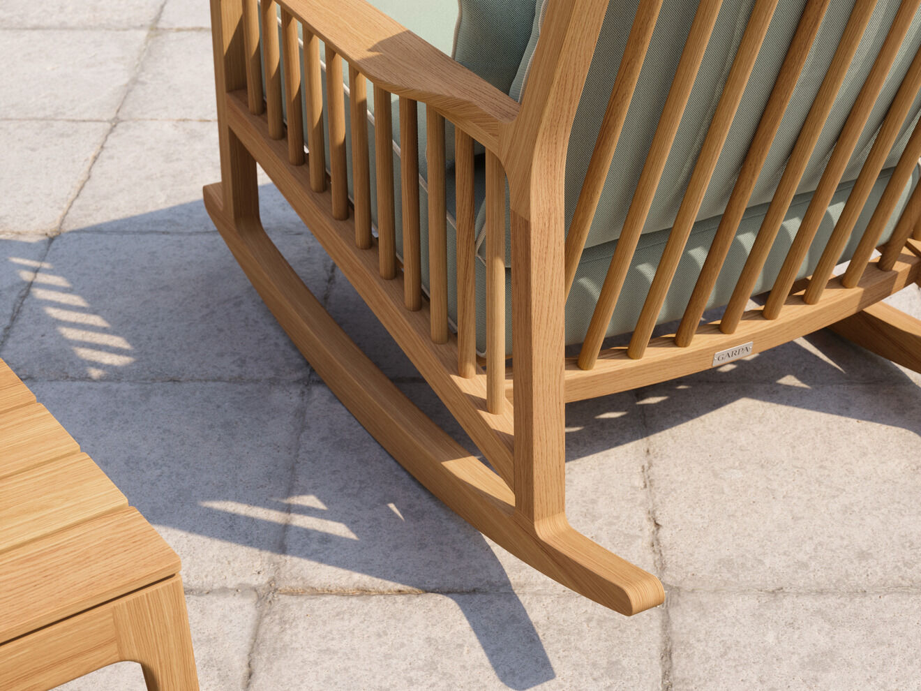 The furniture makes an eye-catching solitaire, and also harmonises effortlessly with other Garpa teak collections. Elaborate piping gives the rocking chairs a special charm, upholstery and cushions provide luxurious comfort. A narrow strip of synthetic material beneath the runners protects sensitive flooring.