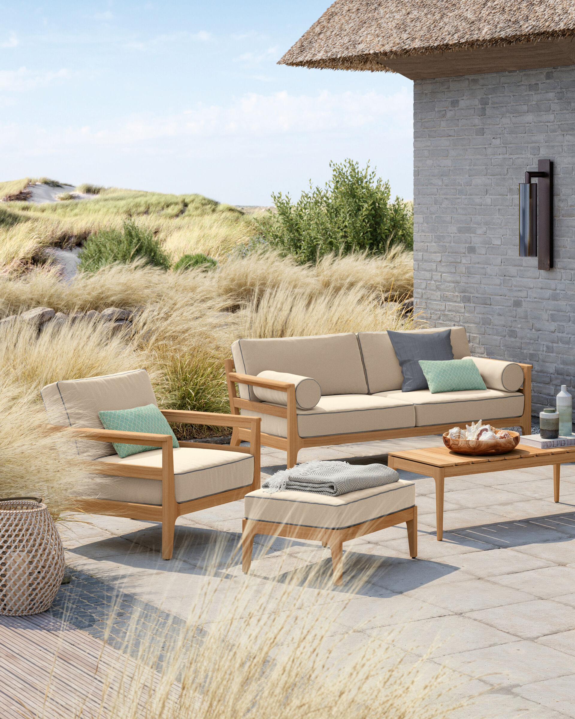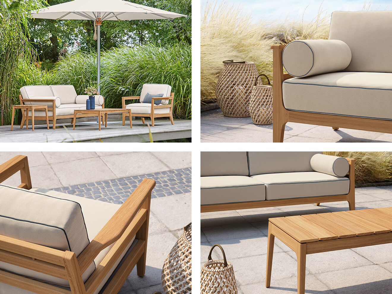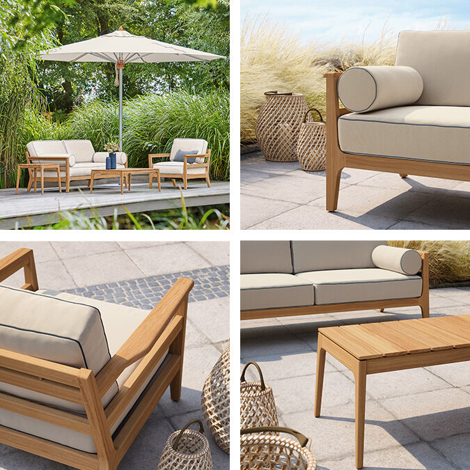 The frames of the lounge furniture are made of teak wood; the seats have a perfectly fitting fabric covering. The luxurious cushions and the padded bolsters that serve as armrests have piped seams of contrasting colour. A single armchair alone makes a cosy refuge. Side and coffee tables made of teak are a stylish addition.