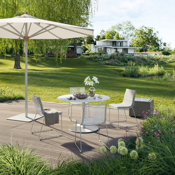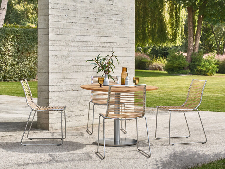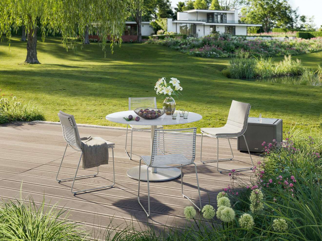 Tables in different sizes, brushed or with graphite-grey powder-coating, are ideal companions for Pan. Fixed or extending versions of the Portland tables create spacious ensembles, and Ronda single-pedestal tables offer agreeable legroom. Tops made of teak or grey synthetic resin enable diverse combinations – for Ronda, there is also the choice of white stone ceramic tops with elegant marble-like patterning.