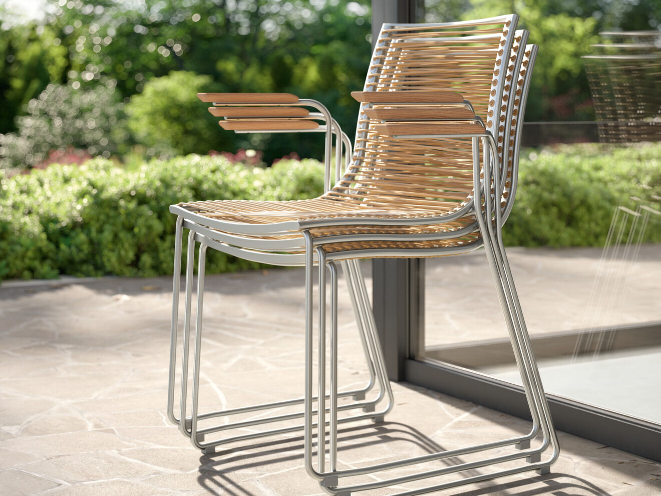 They combine lightness with stability and purism with comfort. For the covering, high-quality synthetic cords are threaded through decorative eyelets in the stainless steel frame. The flexible lacing, that appears almost three-dimensional, aligns perfectly with the contours of the body and retains its shape even under constant strain. Pan chairs are available in the colours White, Brown and Graphite, with and without armrests. They are all easy to stack.