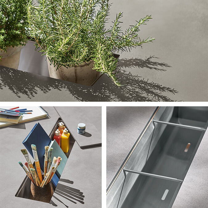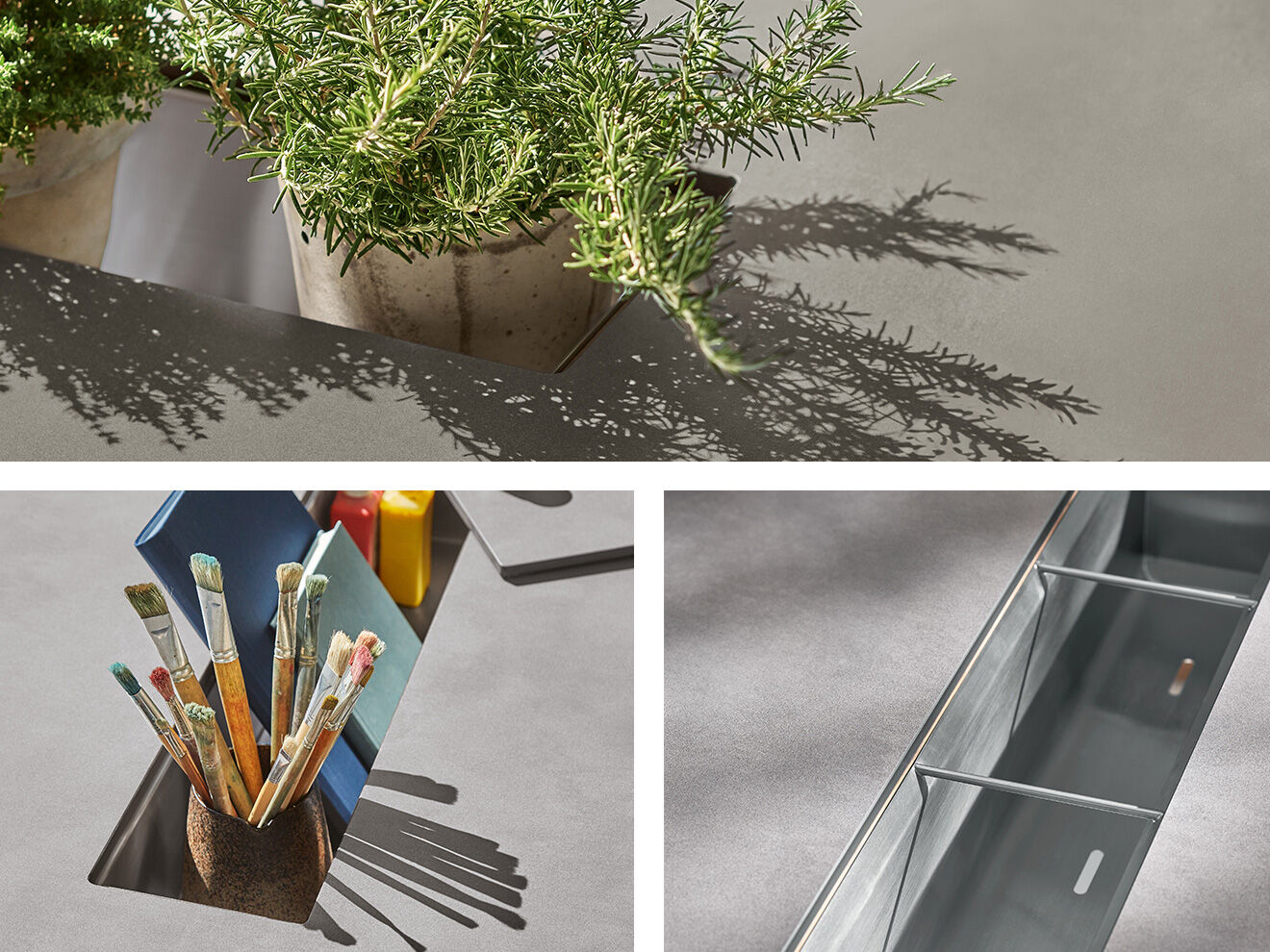 At the ample table there is room for painting, crafting, and playing. The lightly structured and natural-looking grey surfaces made of synthetic resin, are up for anything. Before lunch, all the morning’s paraphernalia vanishes in a flash into the integrated, stainless steel compartment, which is fitted with a lid.