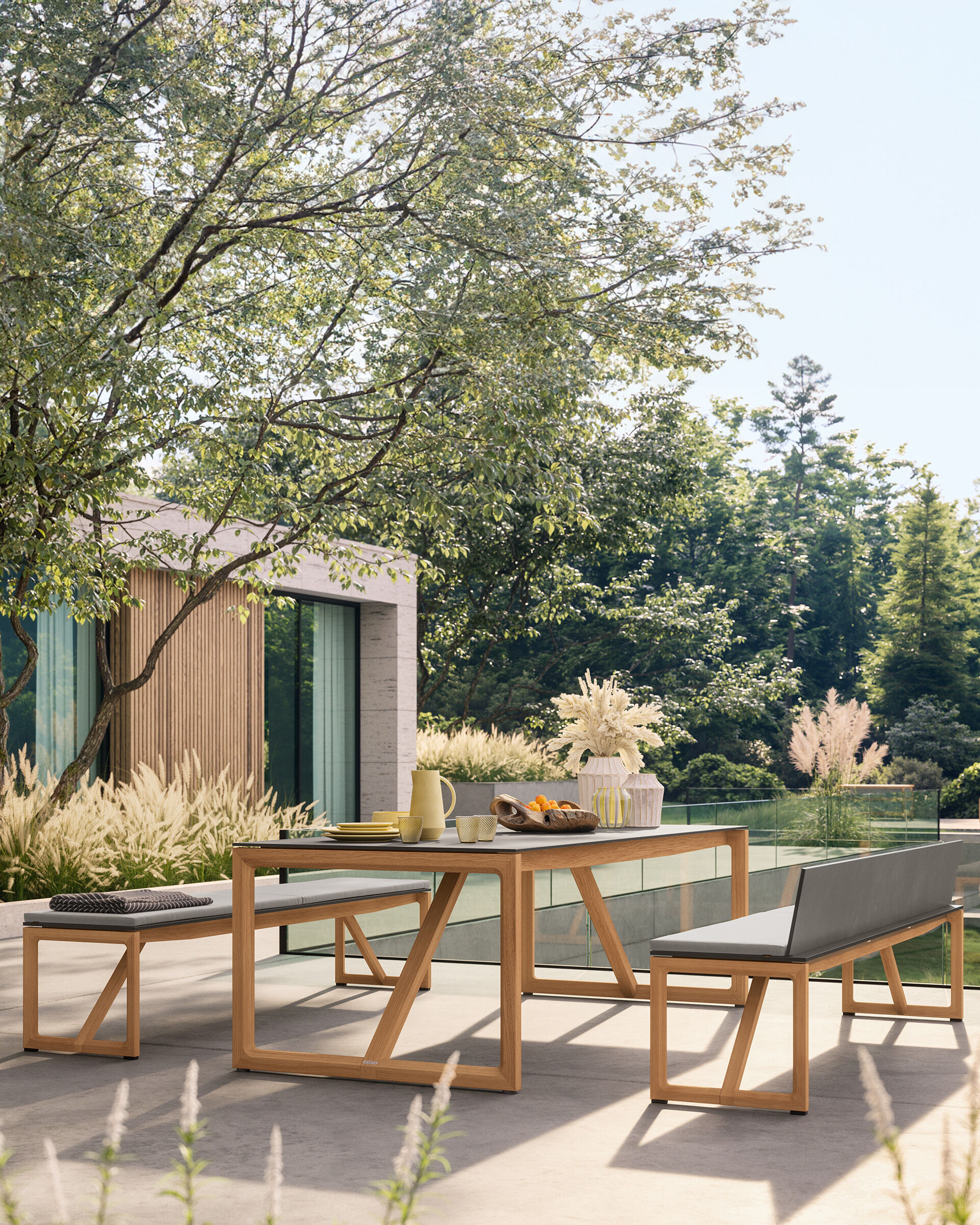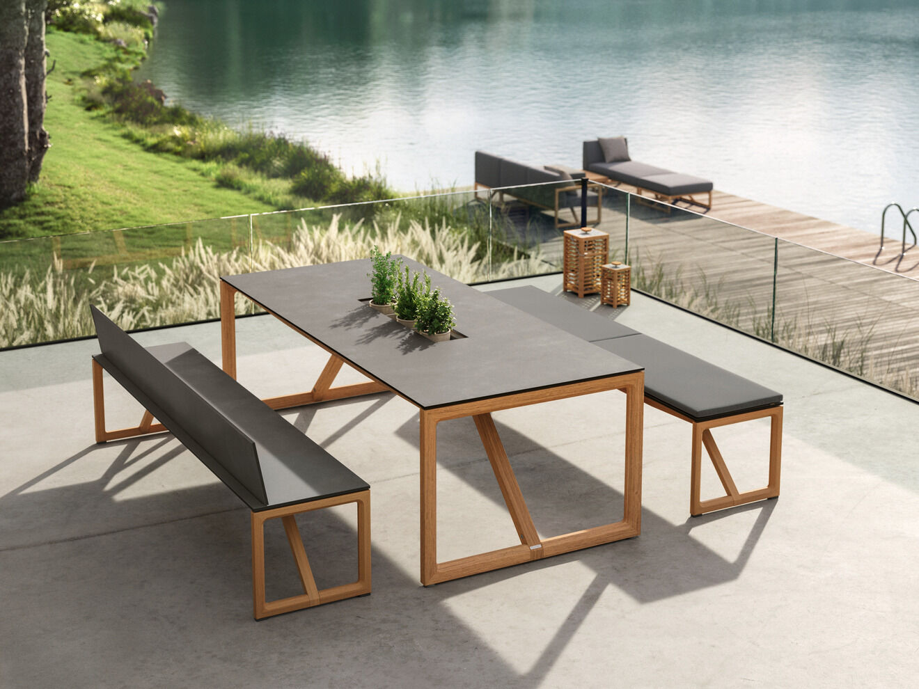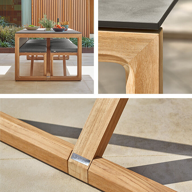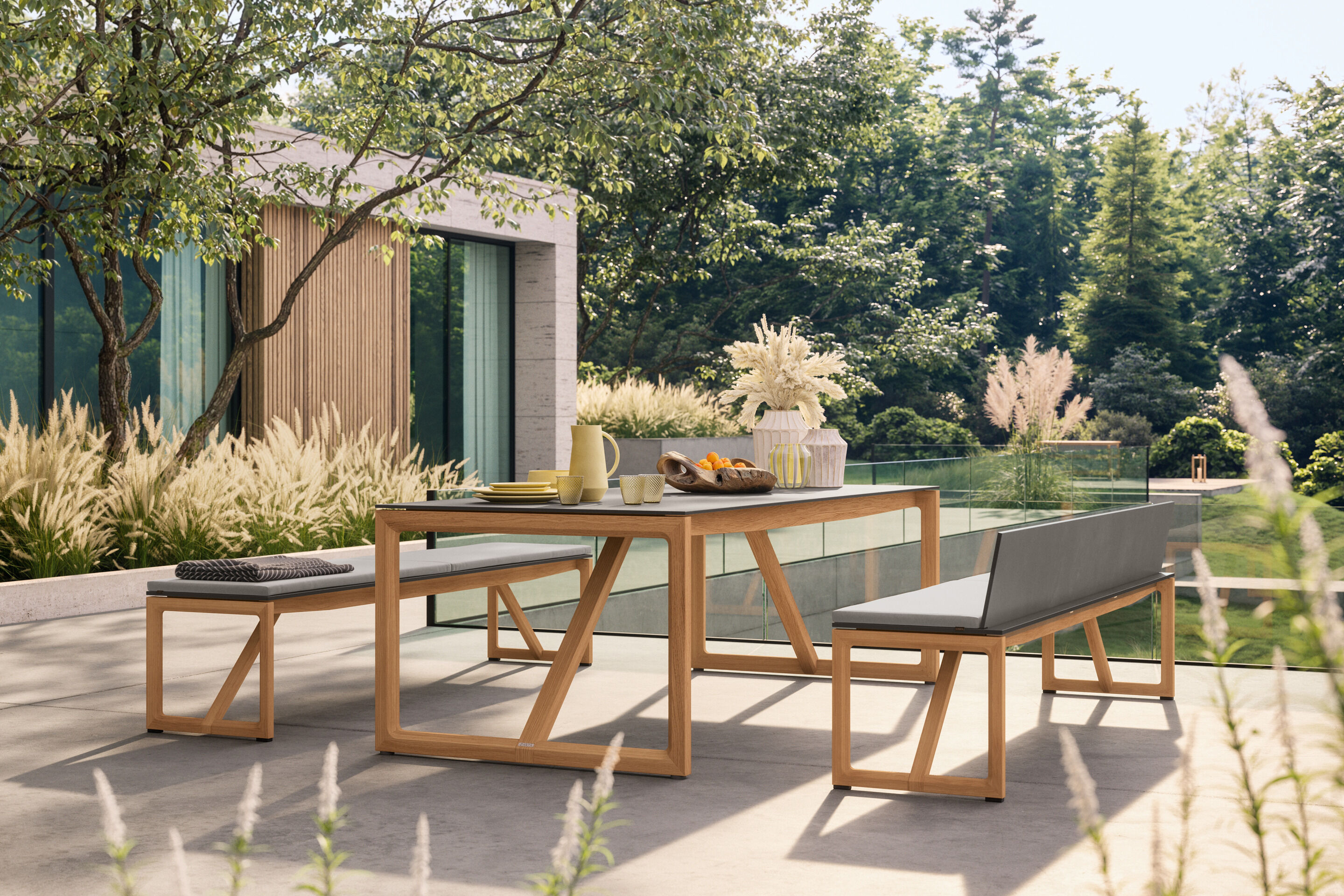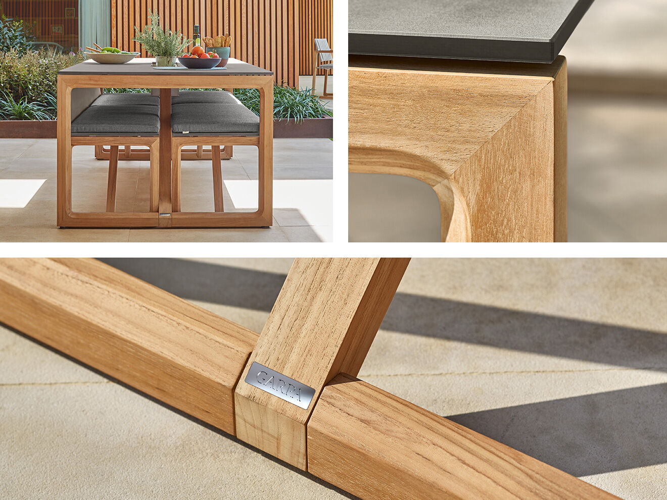 The benches, with and without backrests, match the table with their combination of sturdy teak frames and synthetic resin tops. After convivial evenings or in the case of pouring rain, the benches disappear completely under the table and together, they create a compact block.