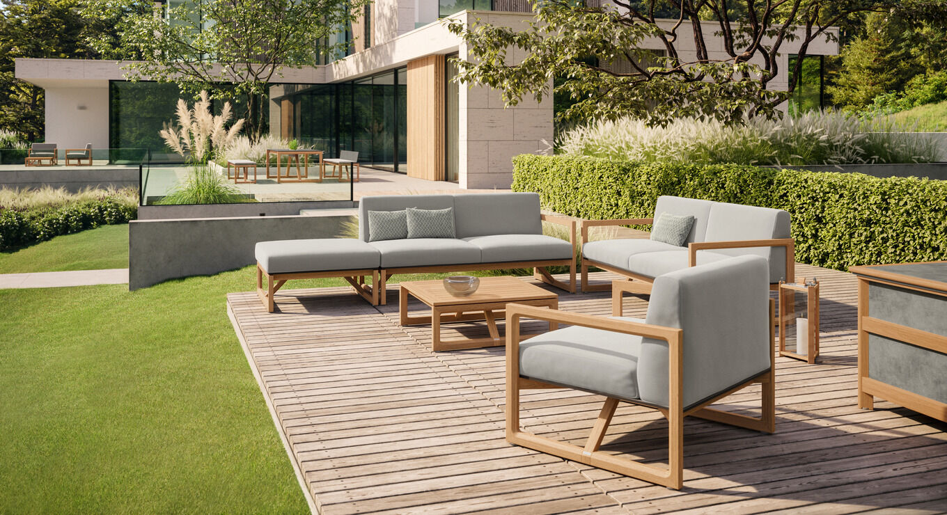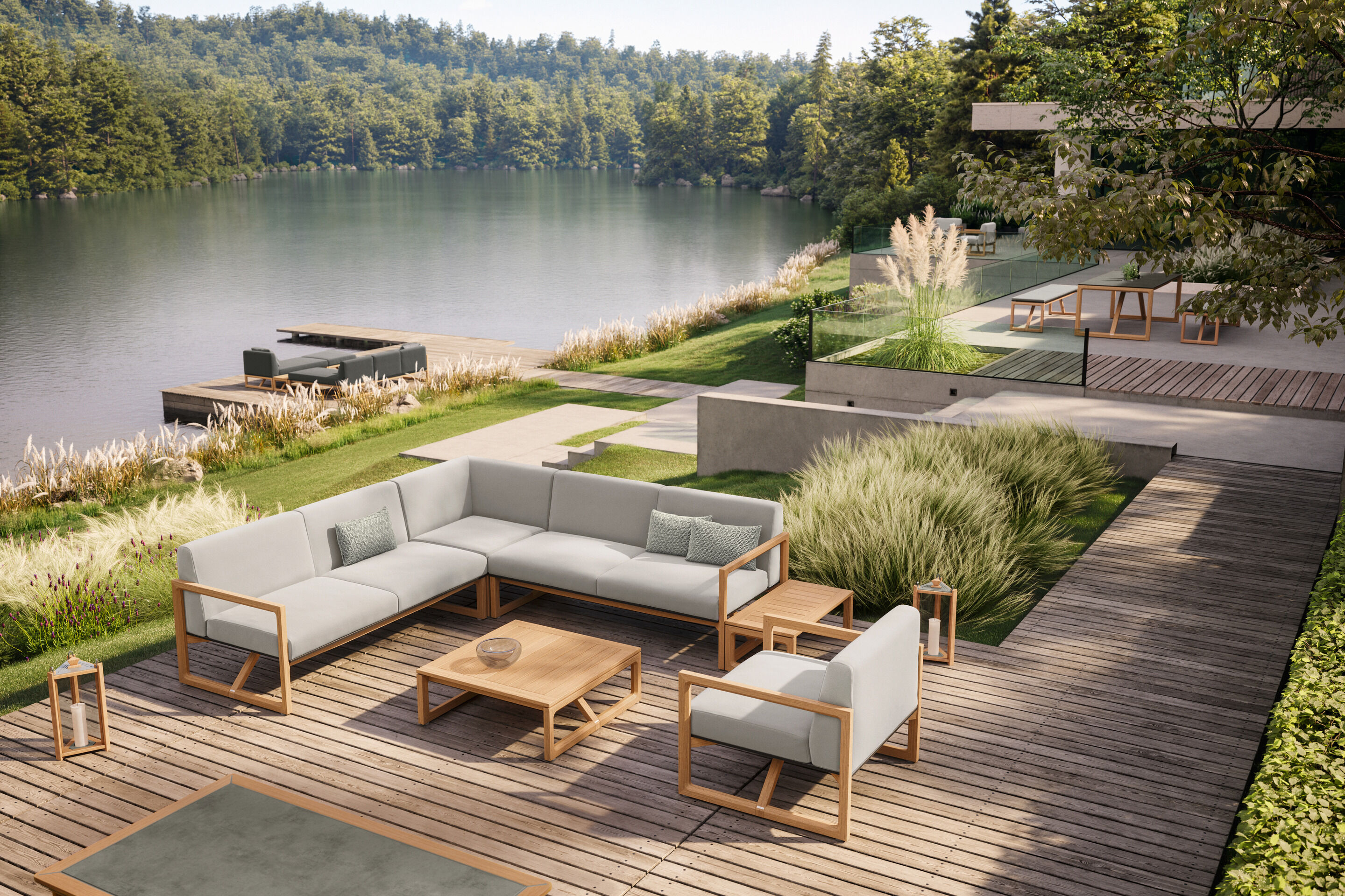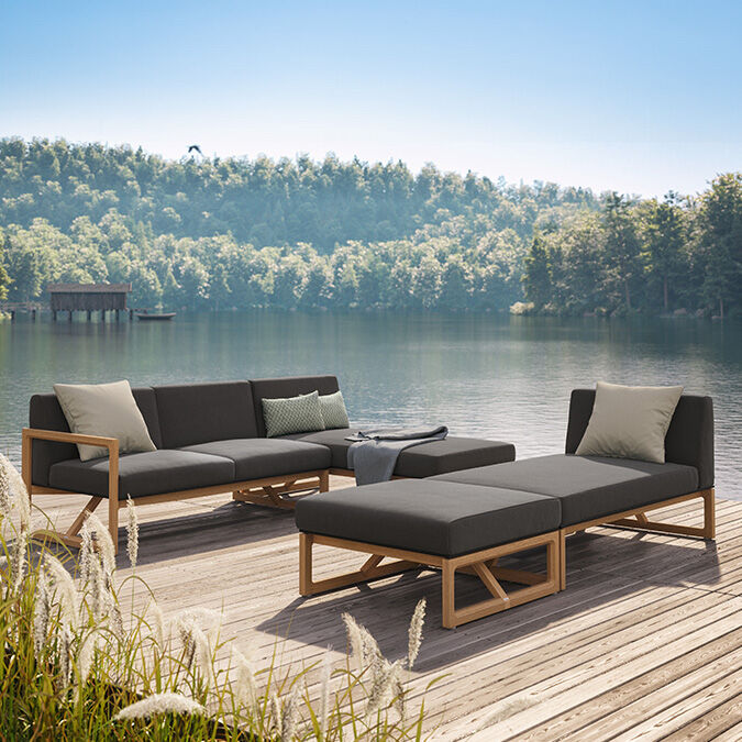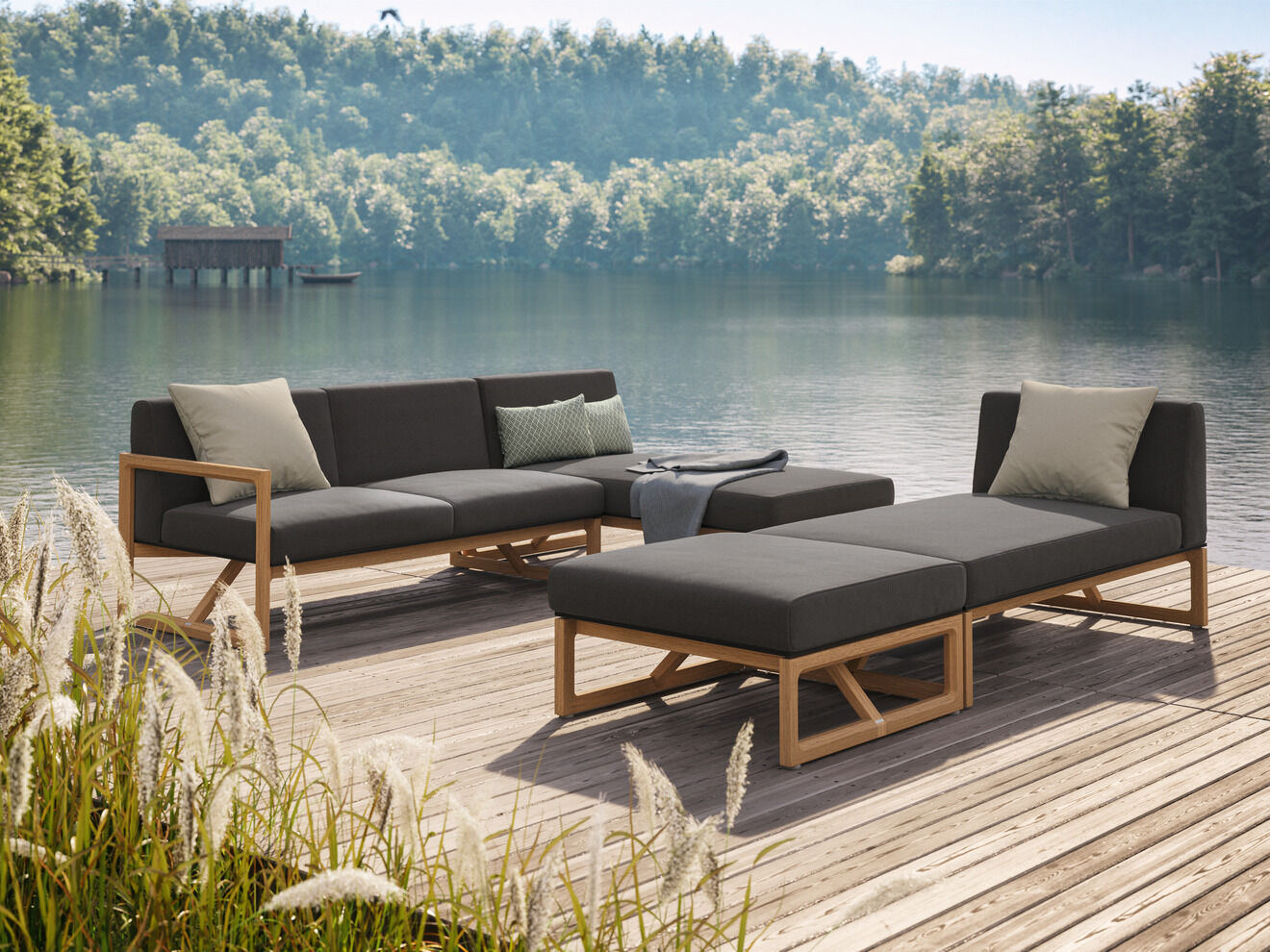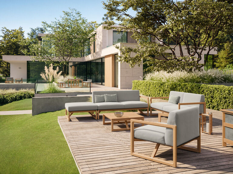 Pleasantly upholstered furniture can be grouped around a low coffee table exactly as desired. A side table completes the welcoming scenario. The salient feature uniting the comfortable lounge furniture is the self-assured design – fulfilling classic requirements for relaxation in a contemporary way. Frames made of high-quality plantation teak are fitted with upholstery made of 100% polyacrylic for optimum stability. Family-oriented minimalists will appreciate this.