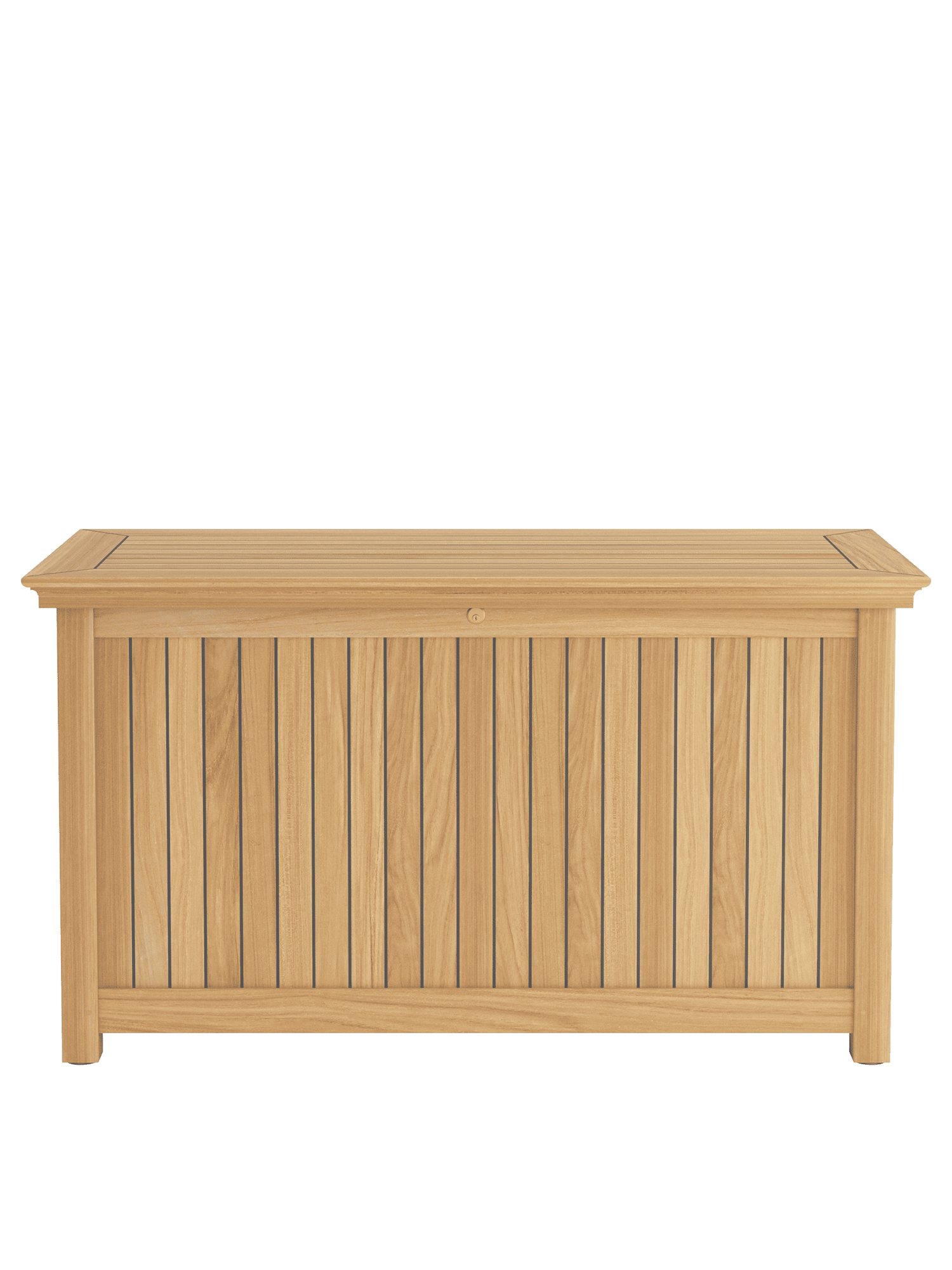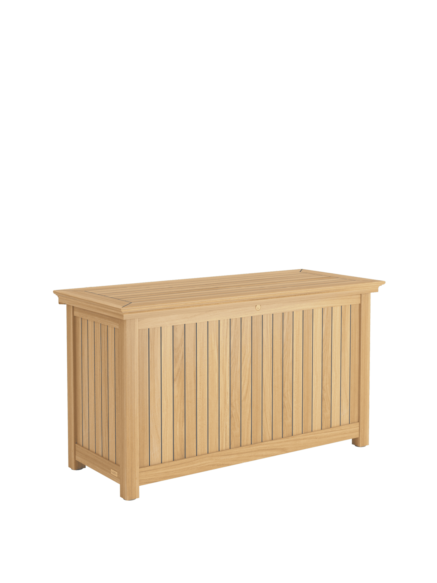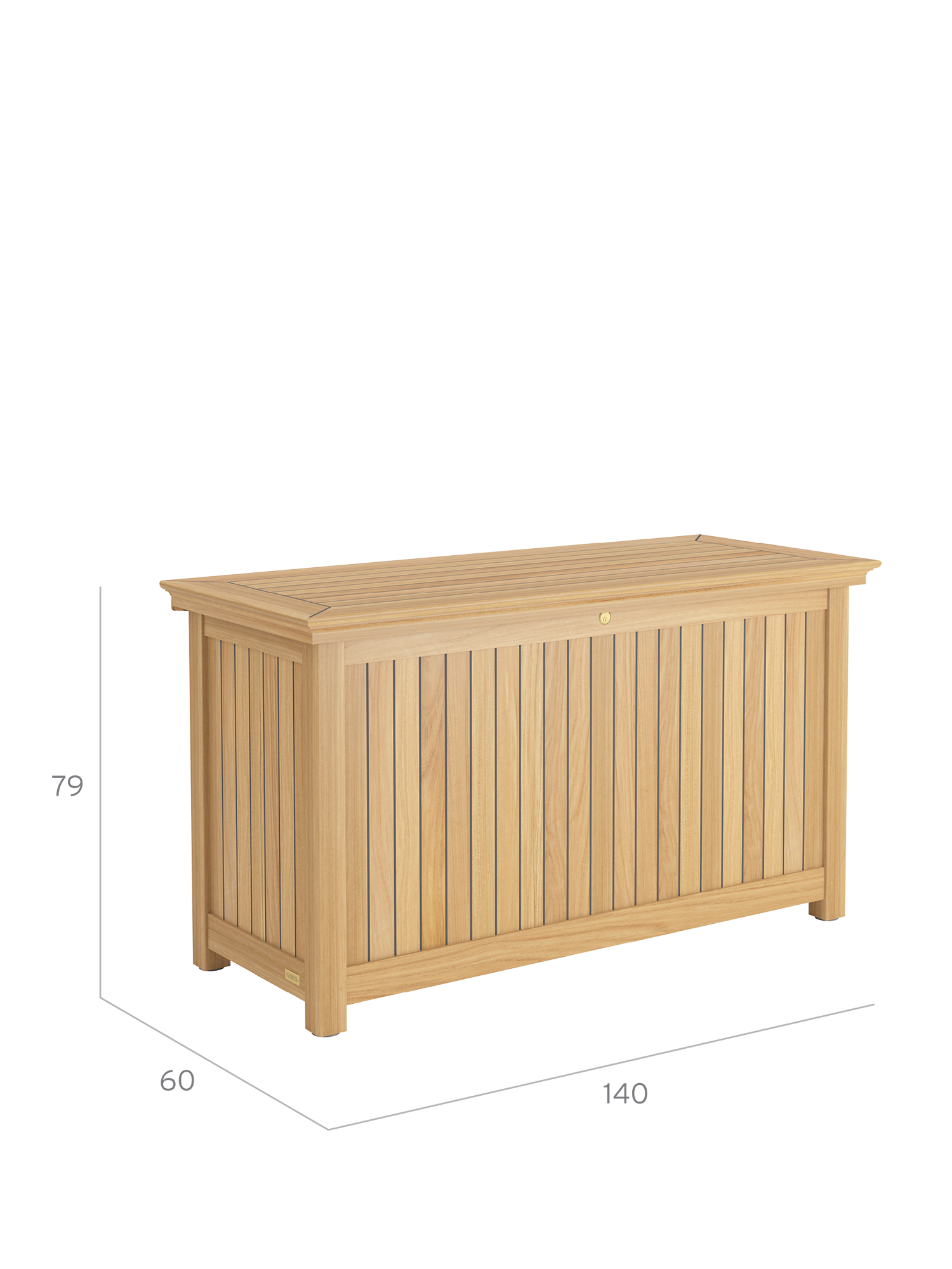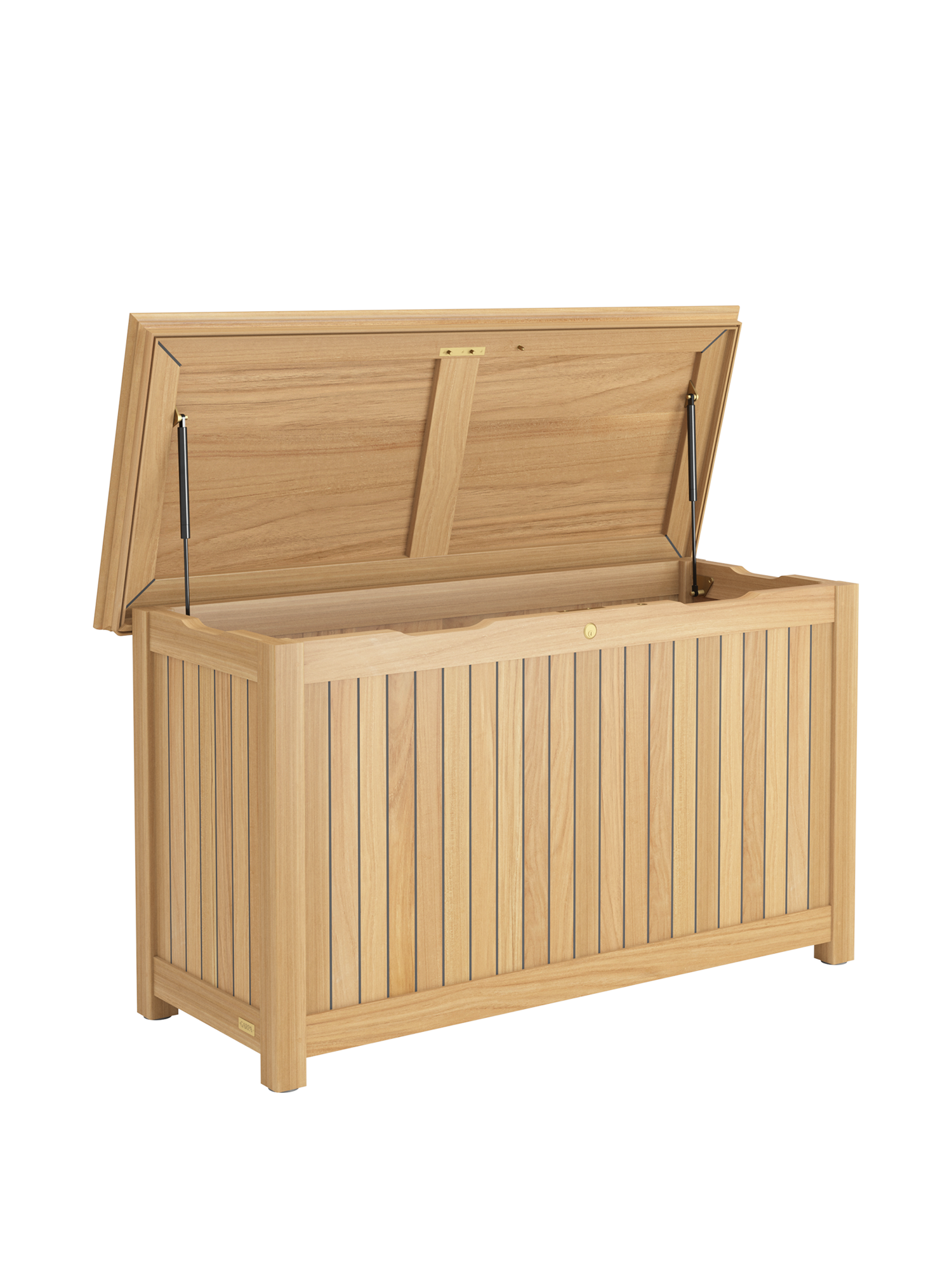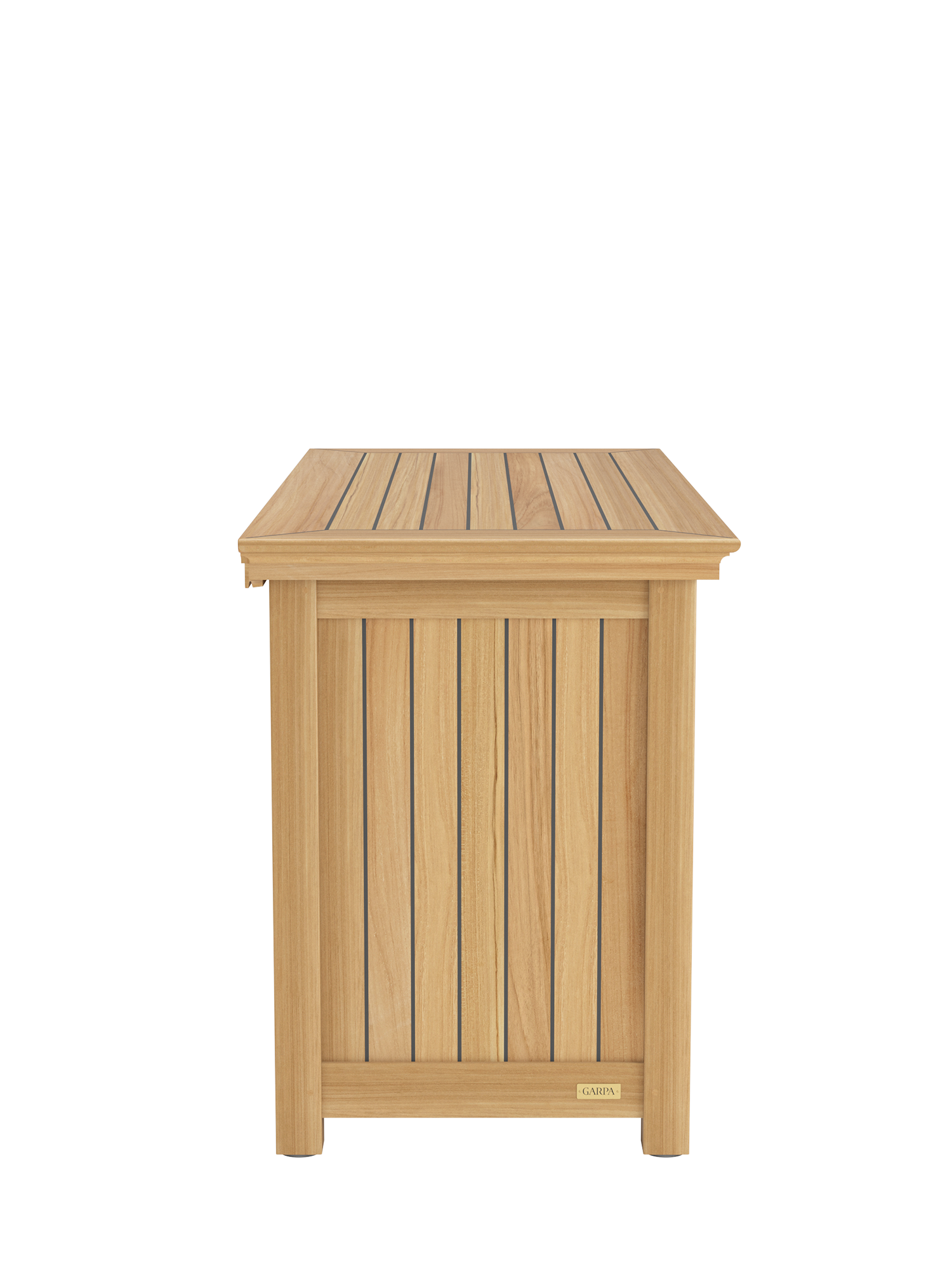 Garpa's cushion chests are perfection in form and function. All construction elements are of solid teak. The sides and lid are of weatherproof, laminated wood with a 2.5 mm teak veneer and sealed like the deck of a yacht. The lock and hinges are of high-quality brass.
