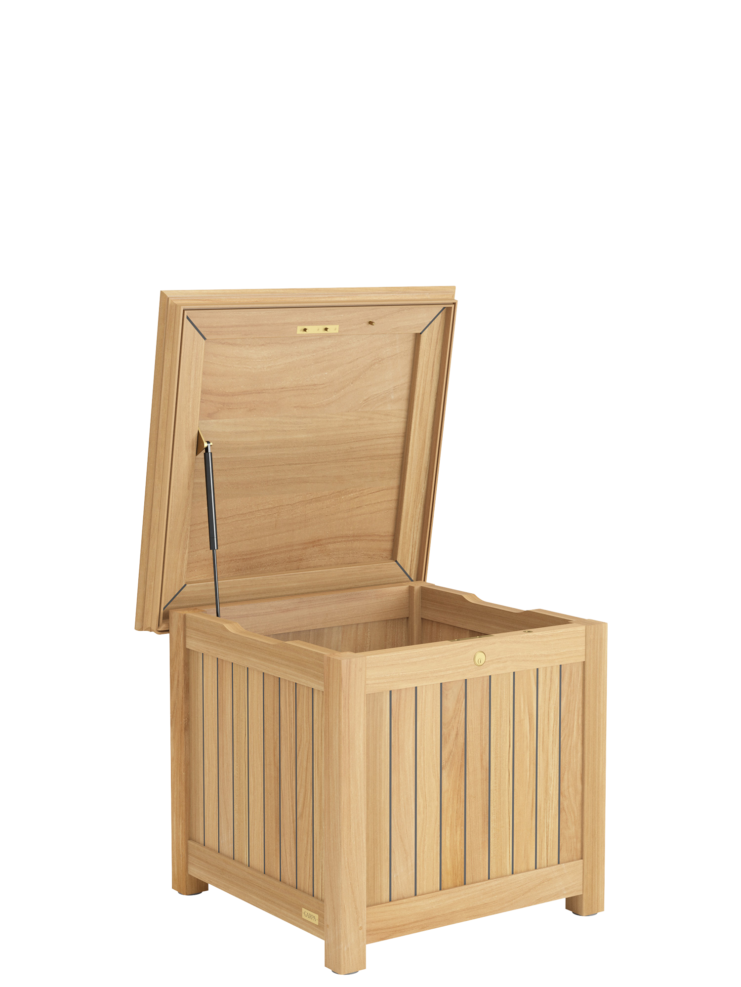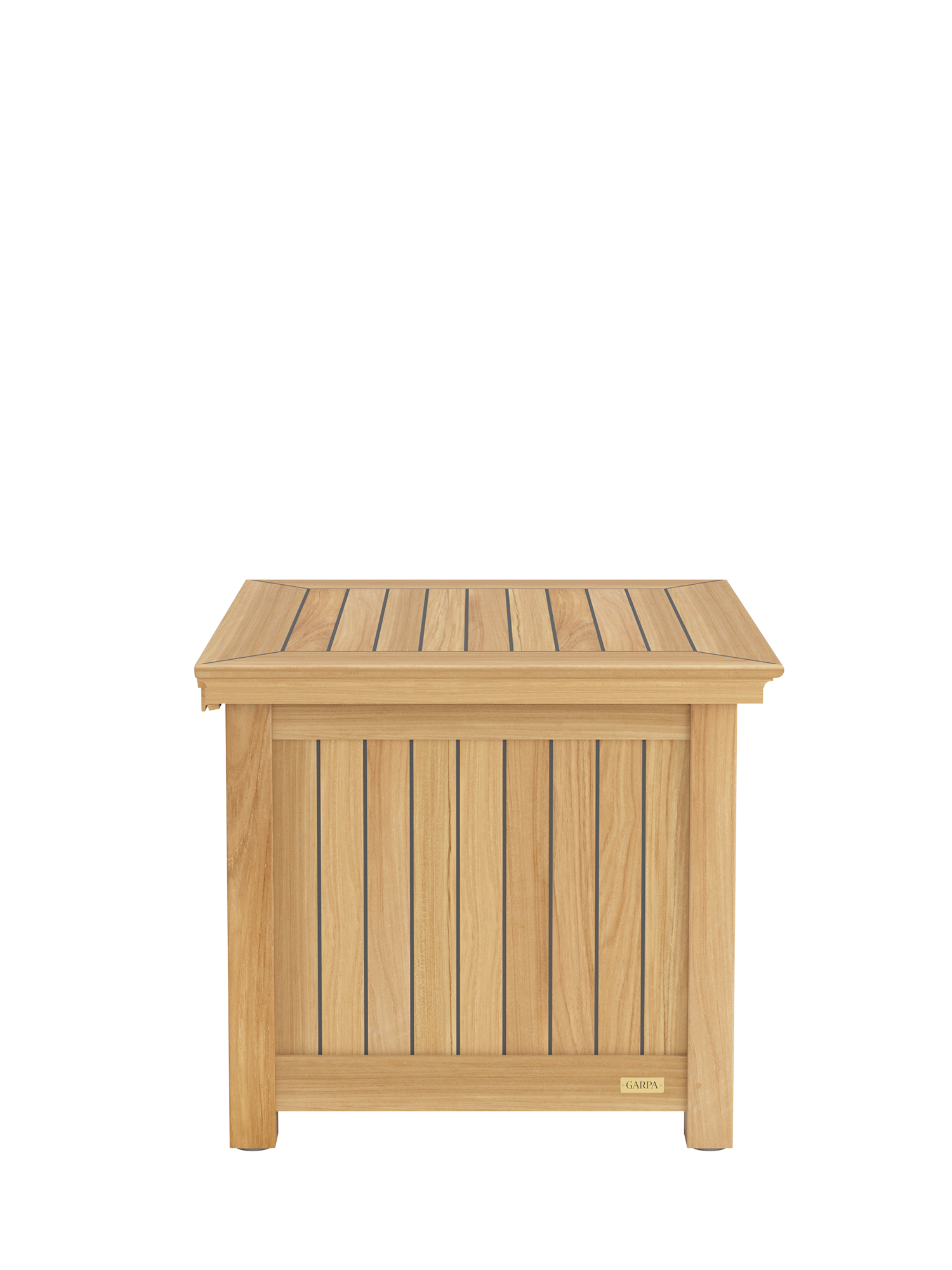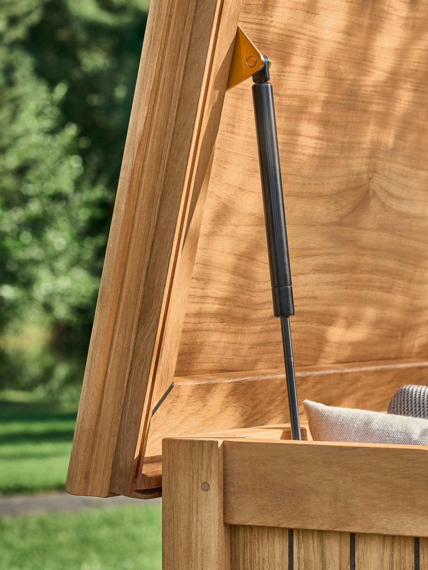 Garpa's cushion chests are perfection in form and function. All construction elements are of solid teak. The sides and lid are of weatherproof, laminated wood with a 2.5 mm teak veneer and sealed like the deck of a yacht. The lock and hinges are of high-quality brass.