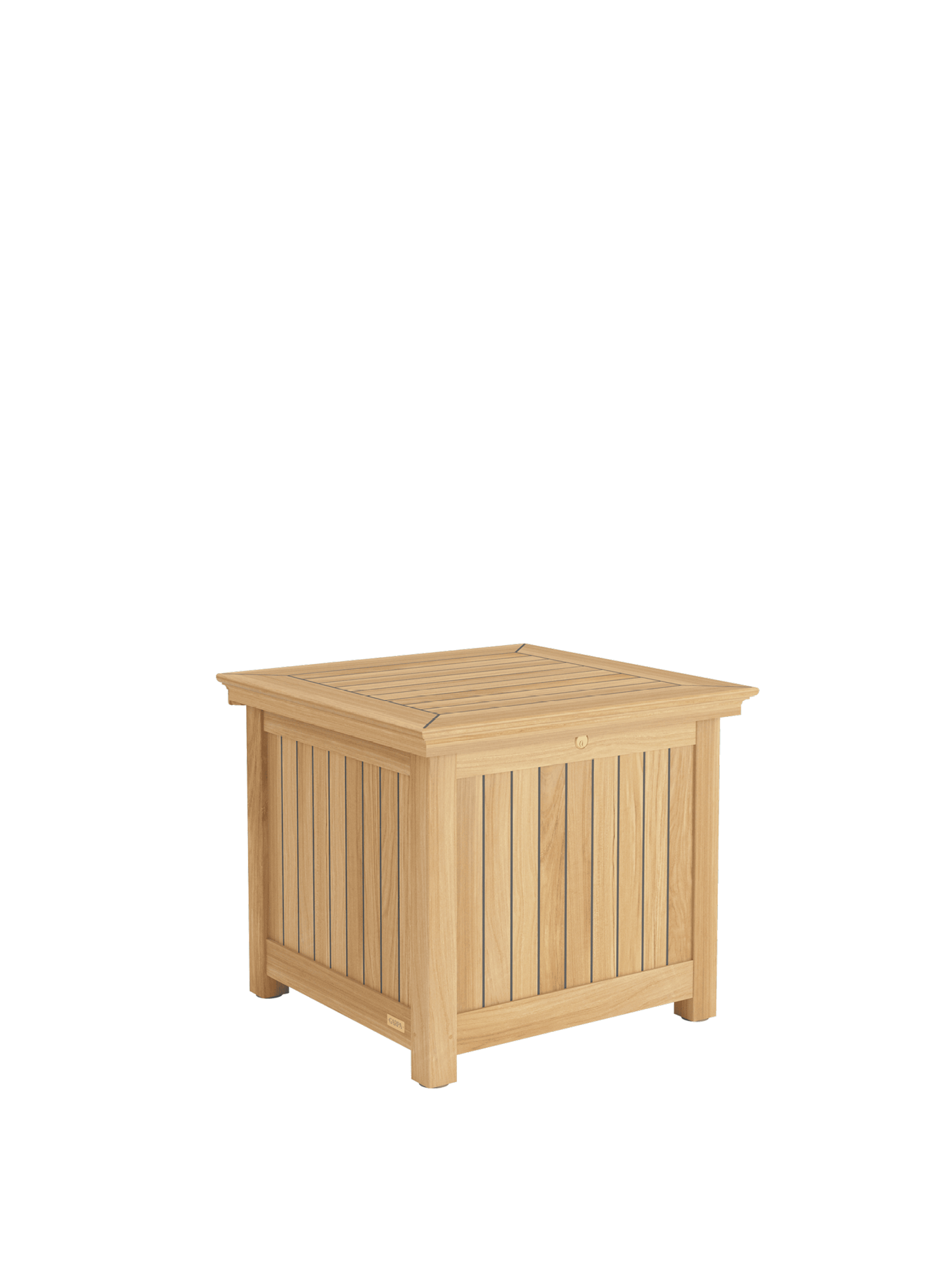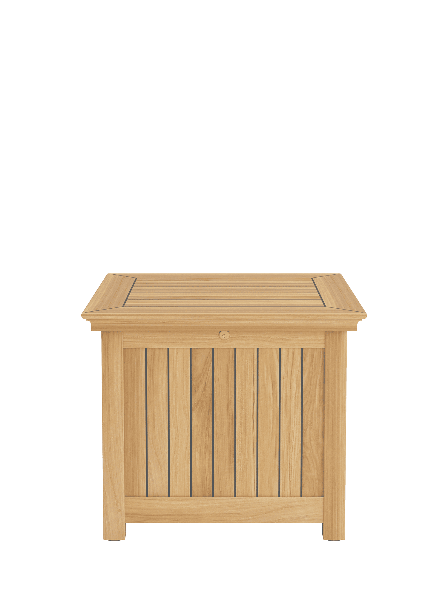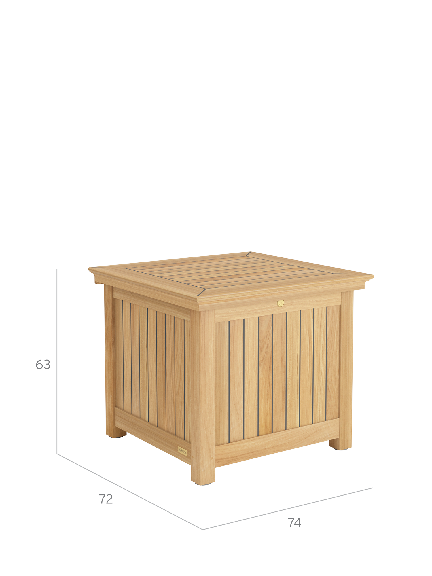 Garpa's cushion chests are perfection in form and function. All construction elements are of solid teak. The sides and lid are of weatherproof, laminated wood with a 2.5 mm teak veneer and sealed like the deck of a yacht. The lock and hinges are of high-quality brass.