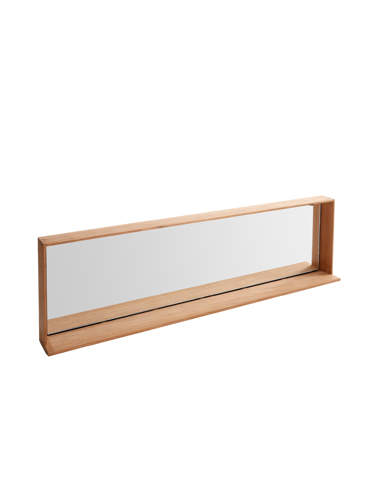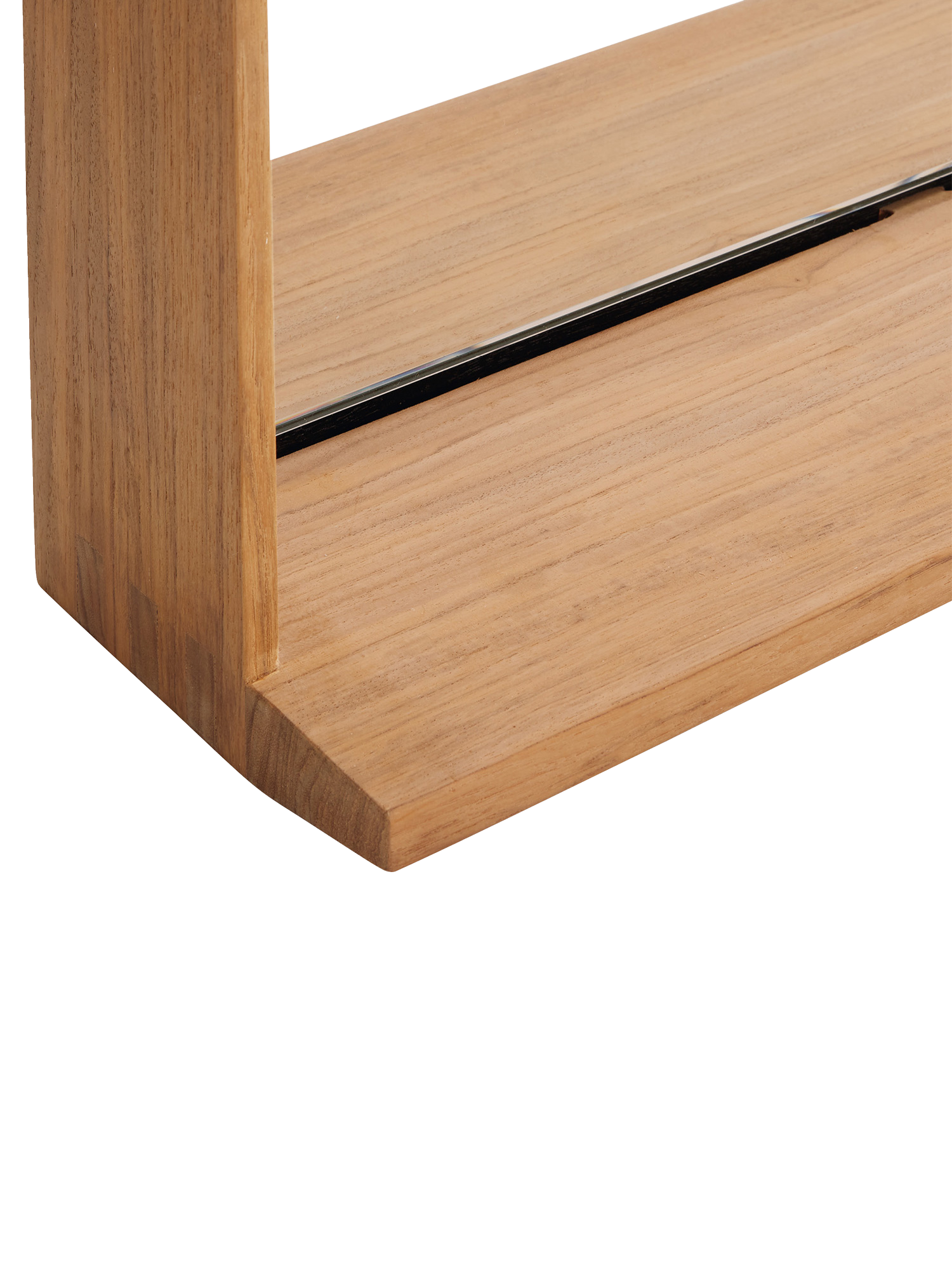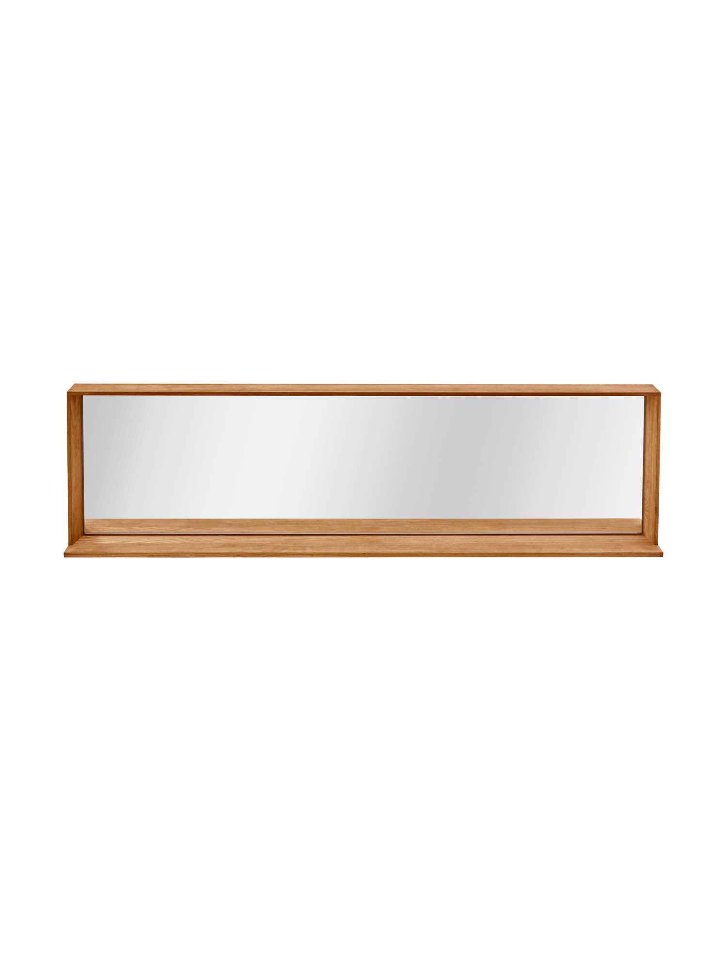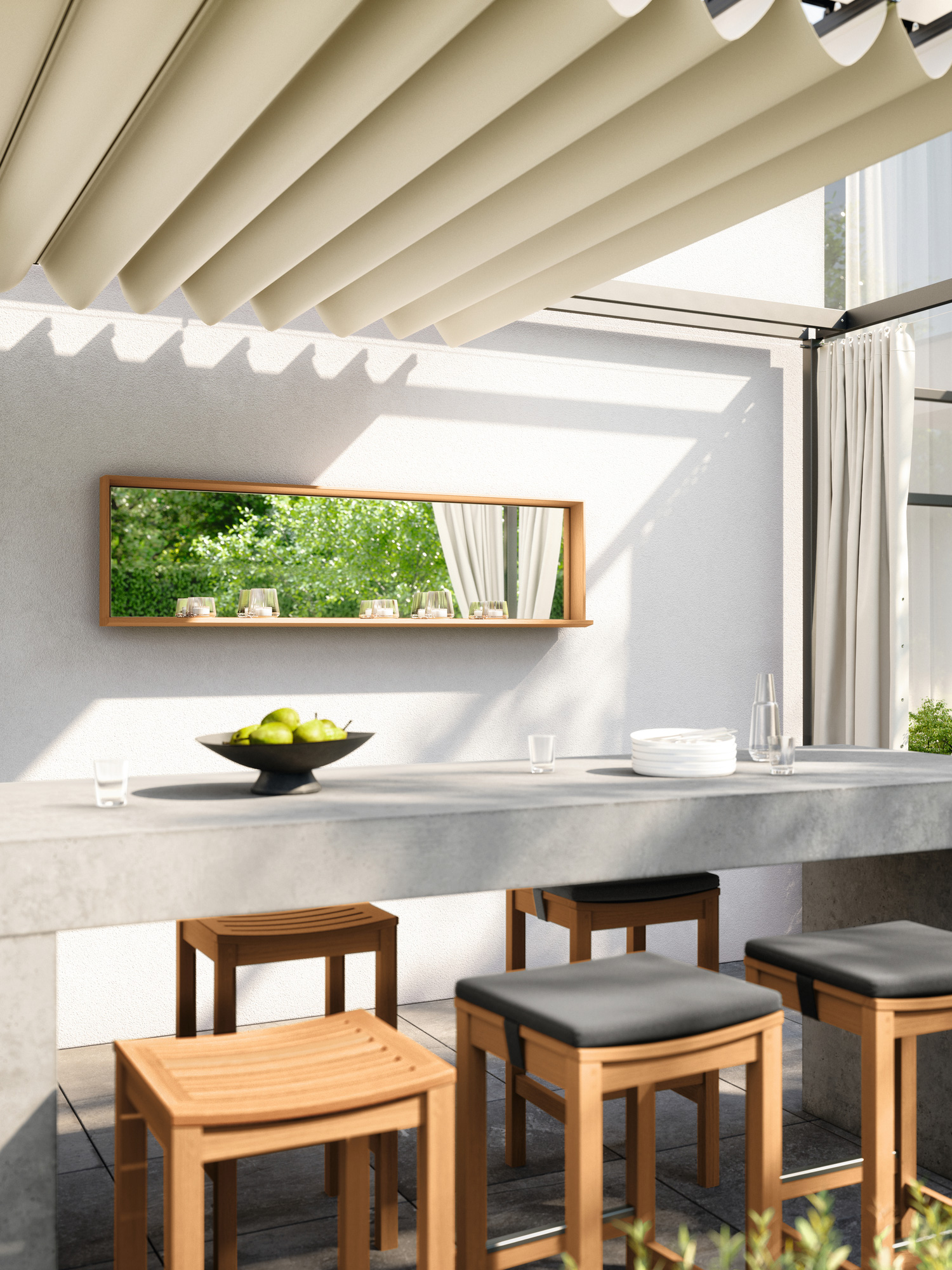 High and narrow, high and wide, narrow and horizontal: the large Fascino mirrors in various sizes and formats and can be hung up indoors or outdoors as desired. Vases and accessories can be decorated particularly impressive on their elegant shelves. The high-quality, weatherproof teak frames are equipped with drip edges. Nevertheless, a dry, protected place on the house wall or under the eaves is recommended for the use.