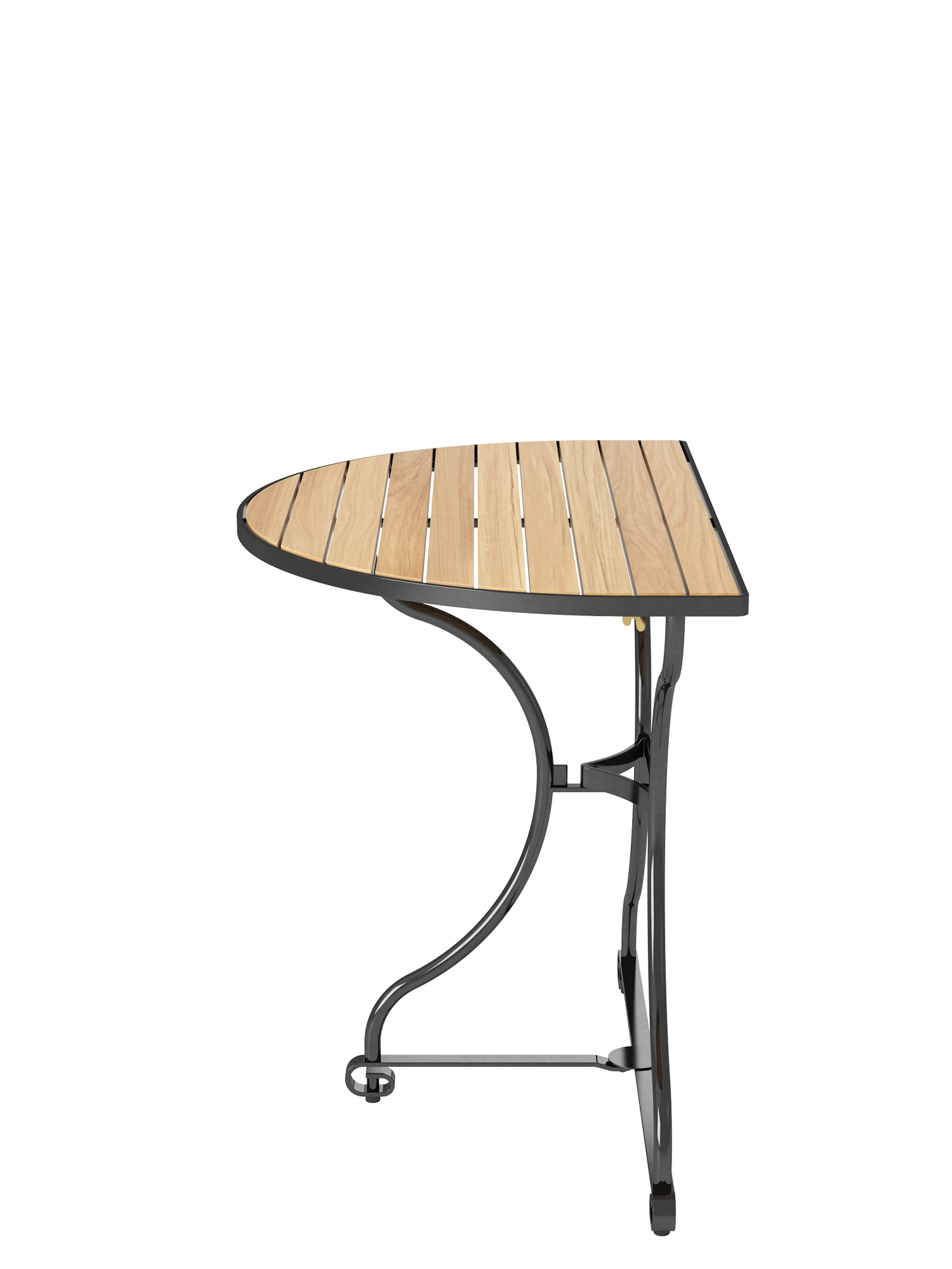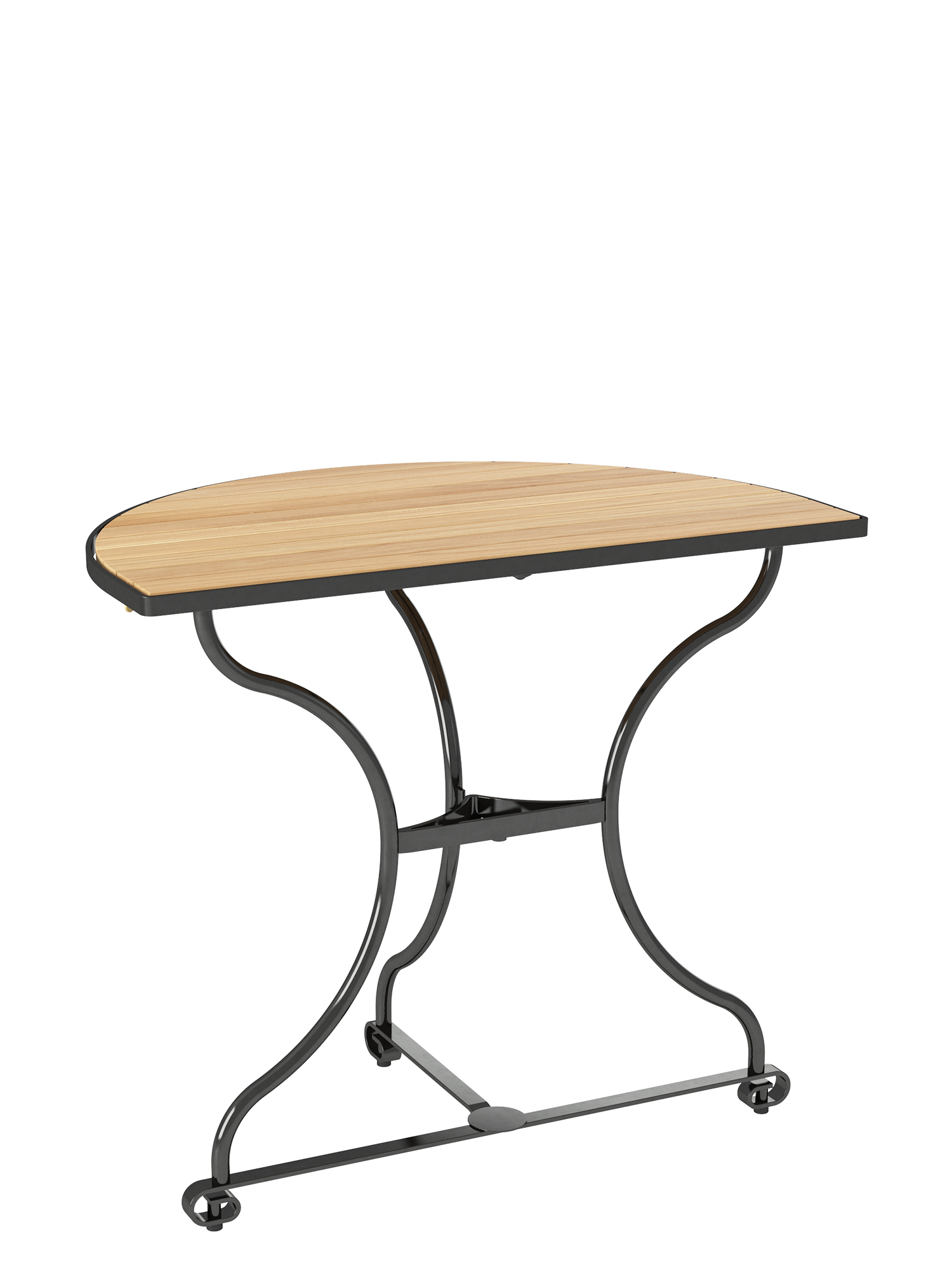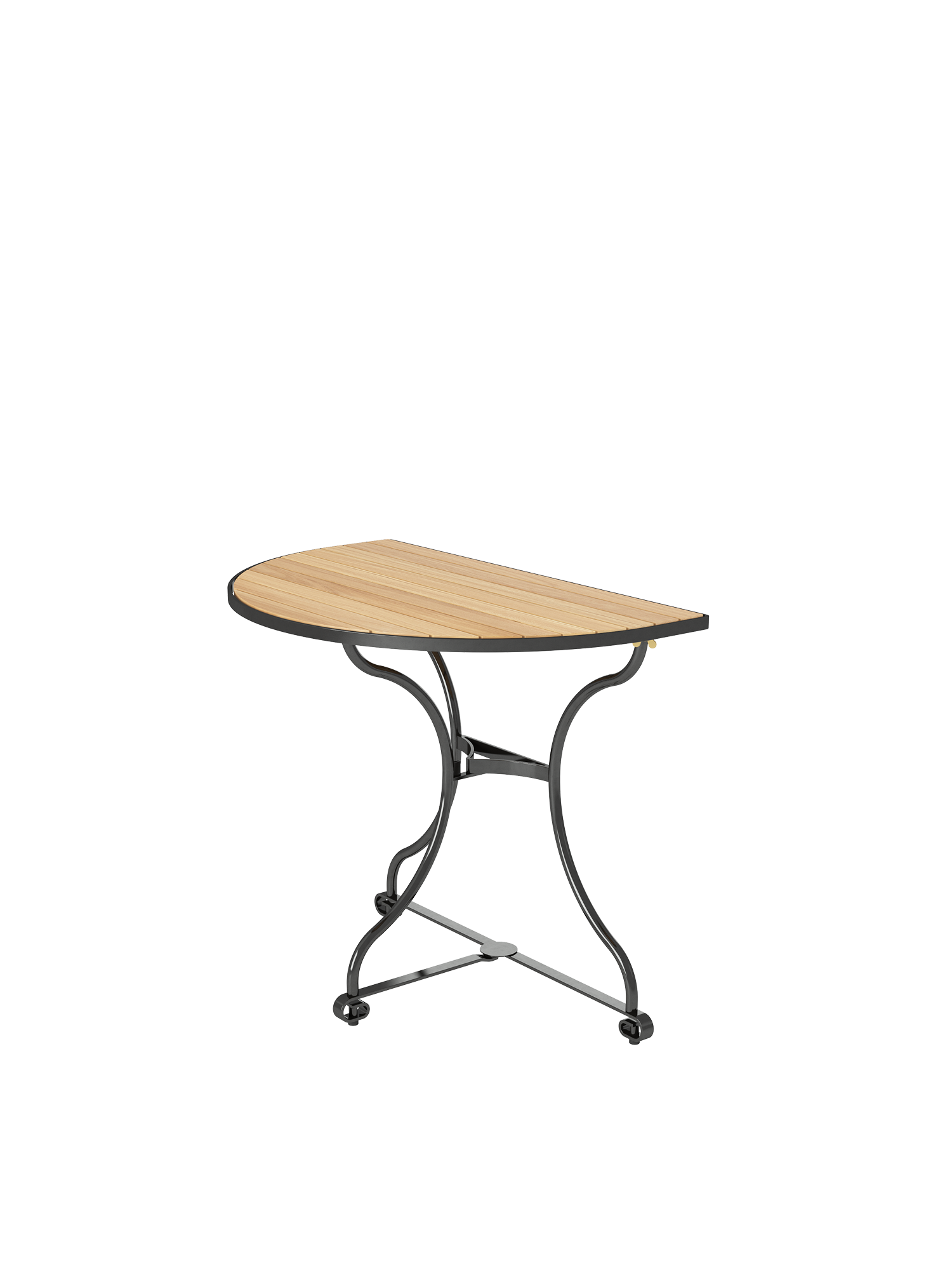 The folding semi-circular table has a frame of galvanised, powder-coated steel, the tabletop is made of teak slats bound in a steel hoop. Floor gliders of hard-wearing synthetic material protect valuable flooring from scratches.