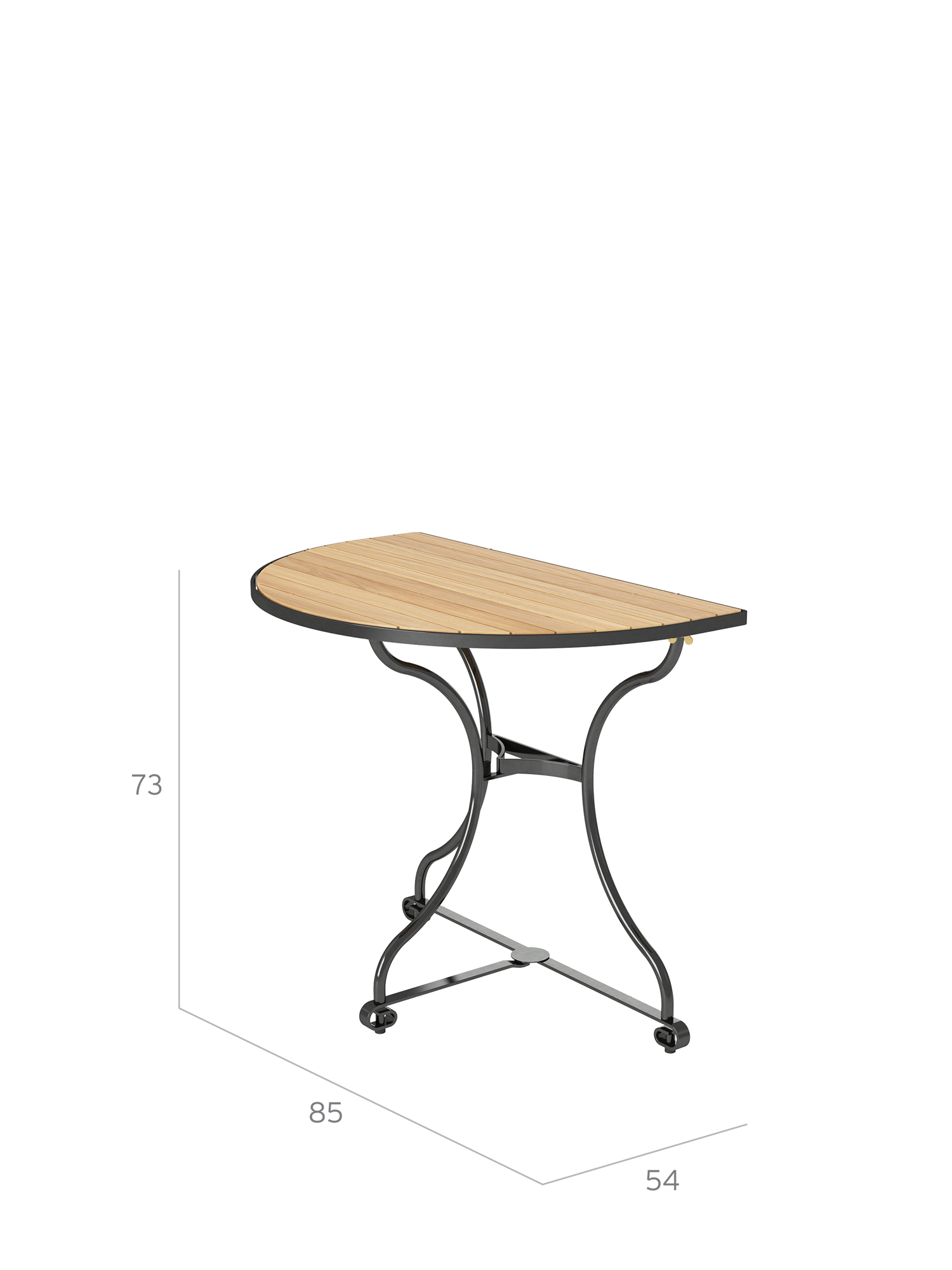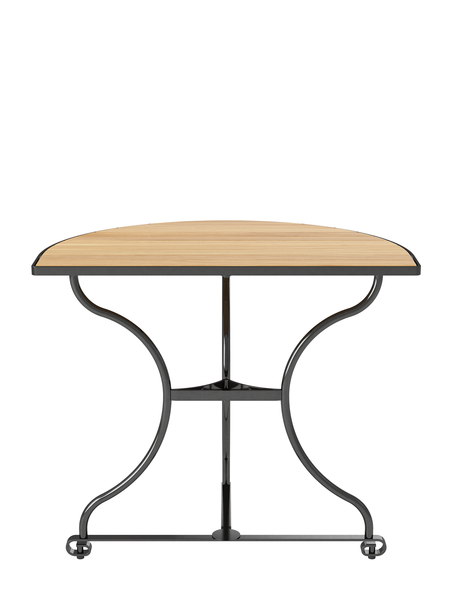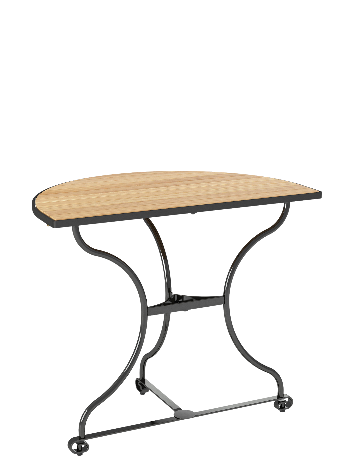 The folding semi-circular table has a frame of galvanised, powder-coated steel, the tabletop is made of teak slats bound in a steel hoop. Floor gliders of hard-wearing synthetic material protect valuable flooring from scratches.