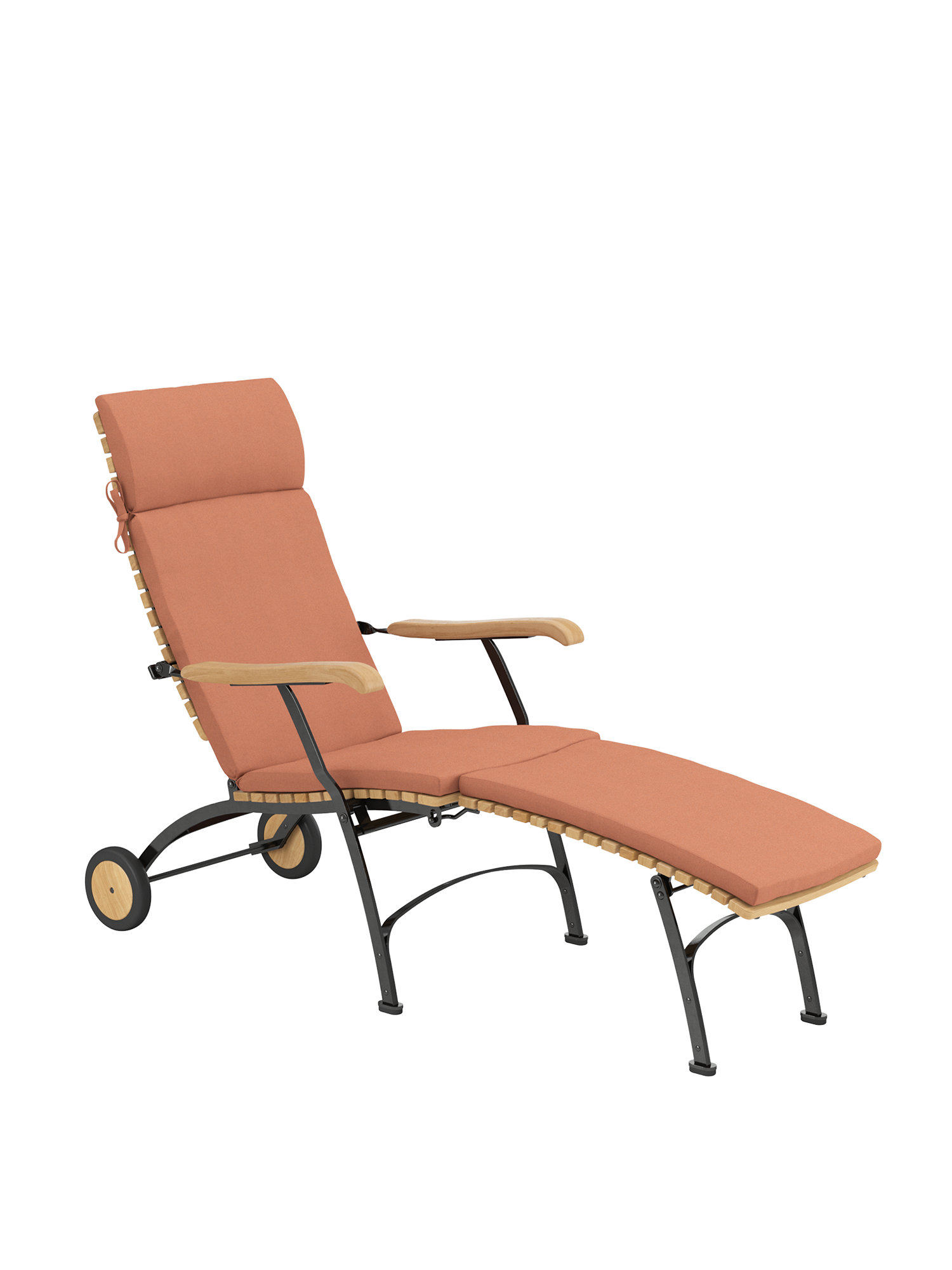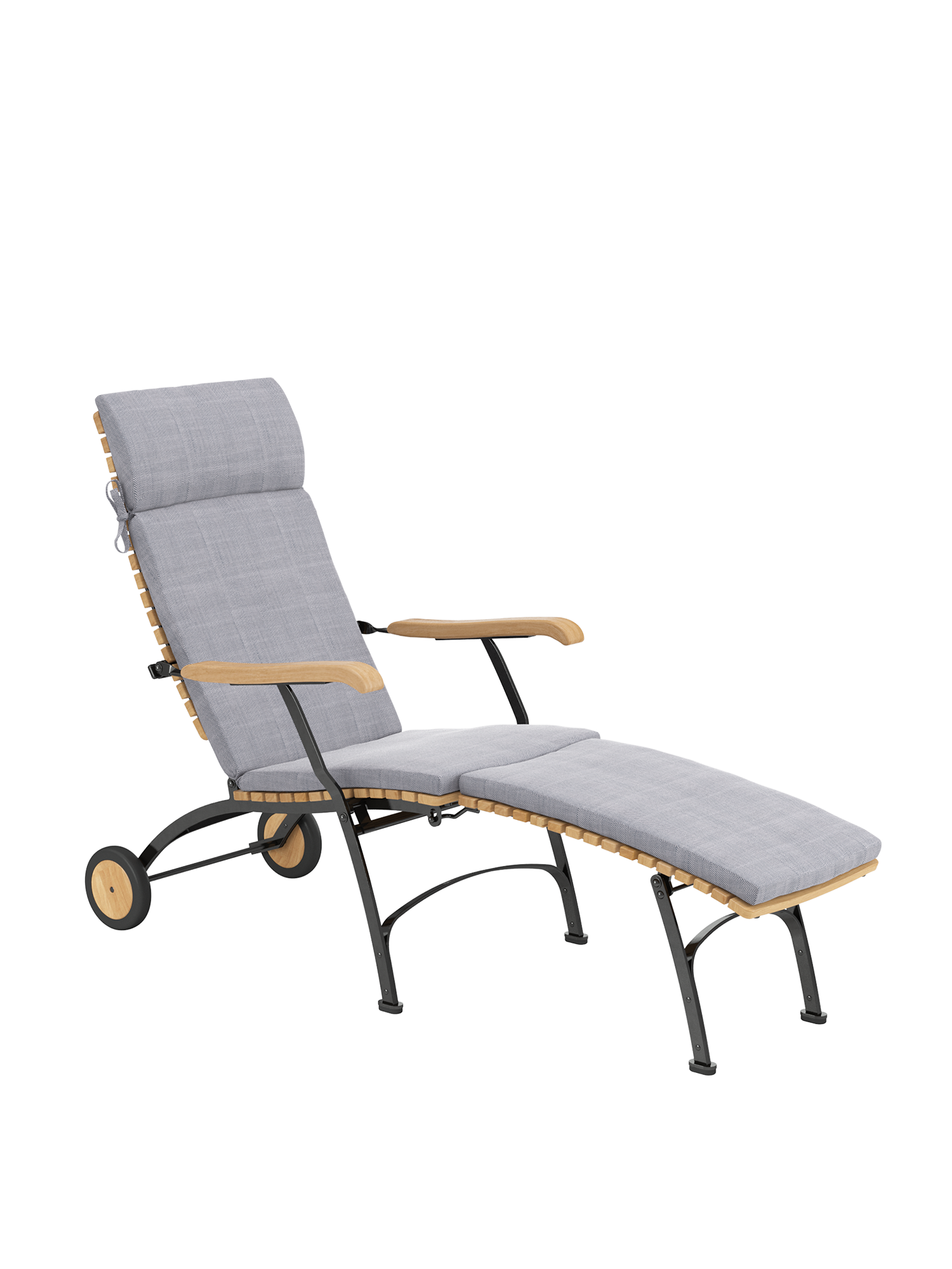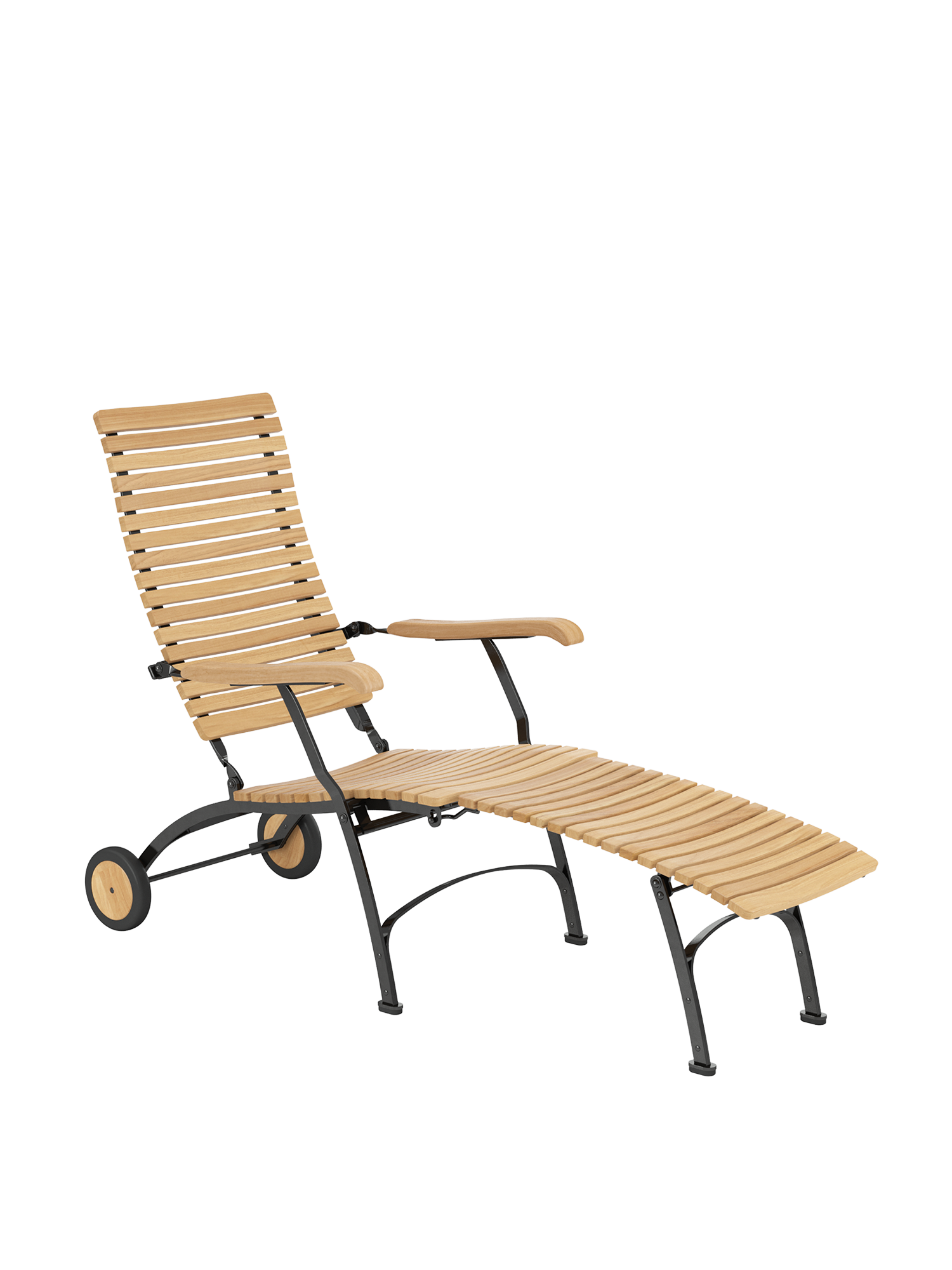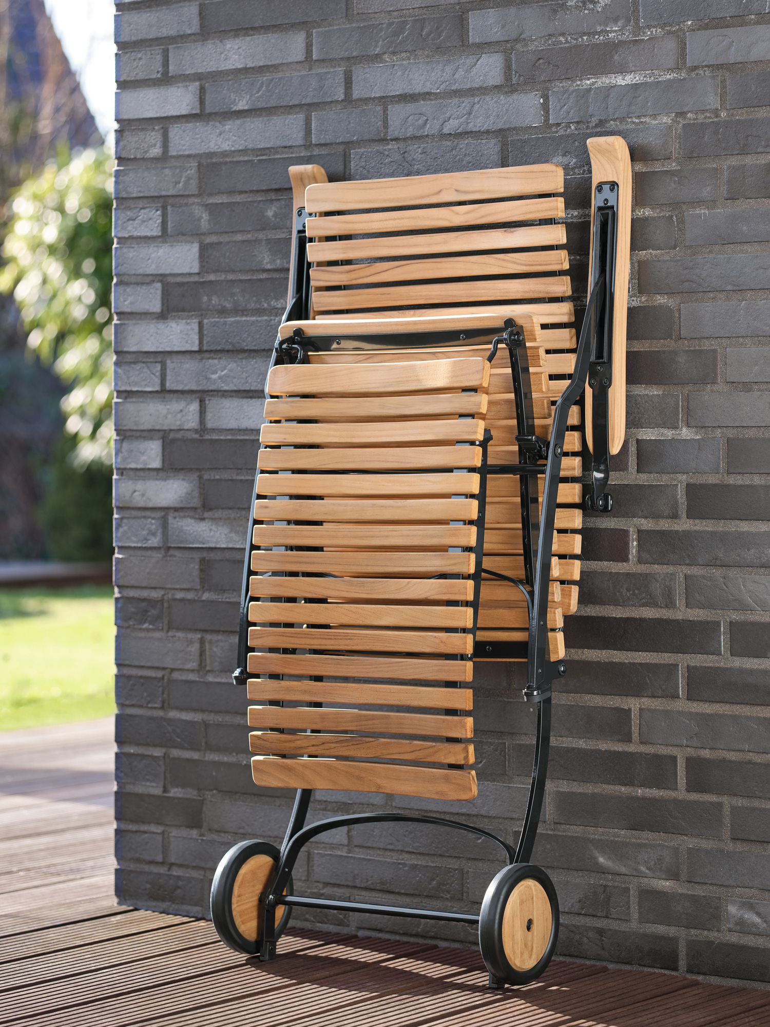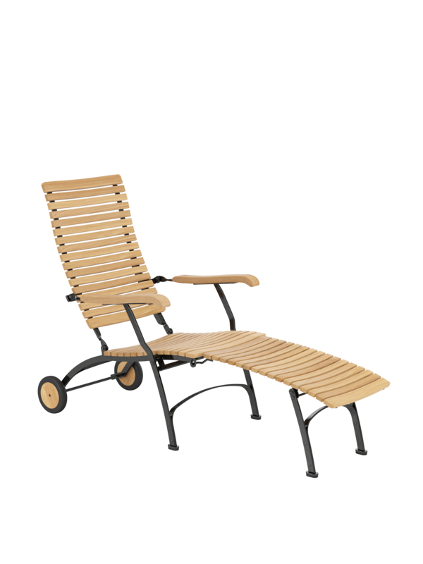 For easy and long-term outdoor use, all bolts of the joints are made of stainless steel, in rust-proof bearings. Polyamide runners under the seat ensure a smooth folding action and protect the powder-coated metal. The frame is made from galvanised, and therefore rust-protected, powder-coated steel. With its wheels of teak the deck chair is easy to move about the garden. Floor gliders of hard-wearing synthetic material protect valuable flooring from scratches.