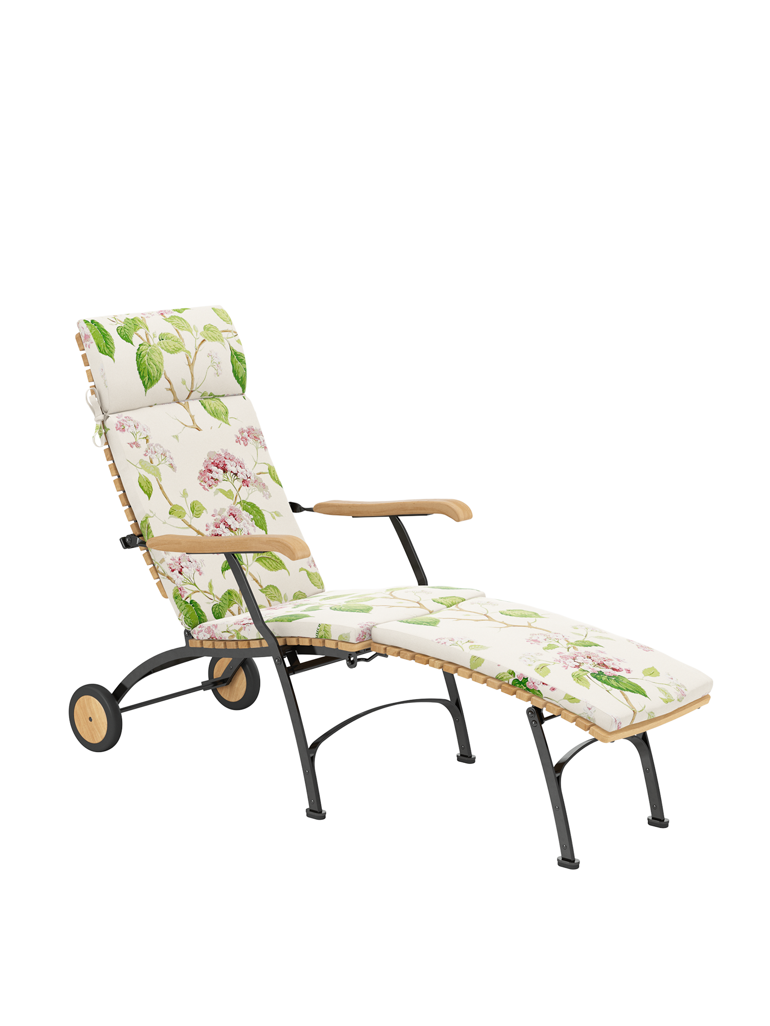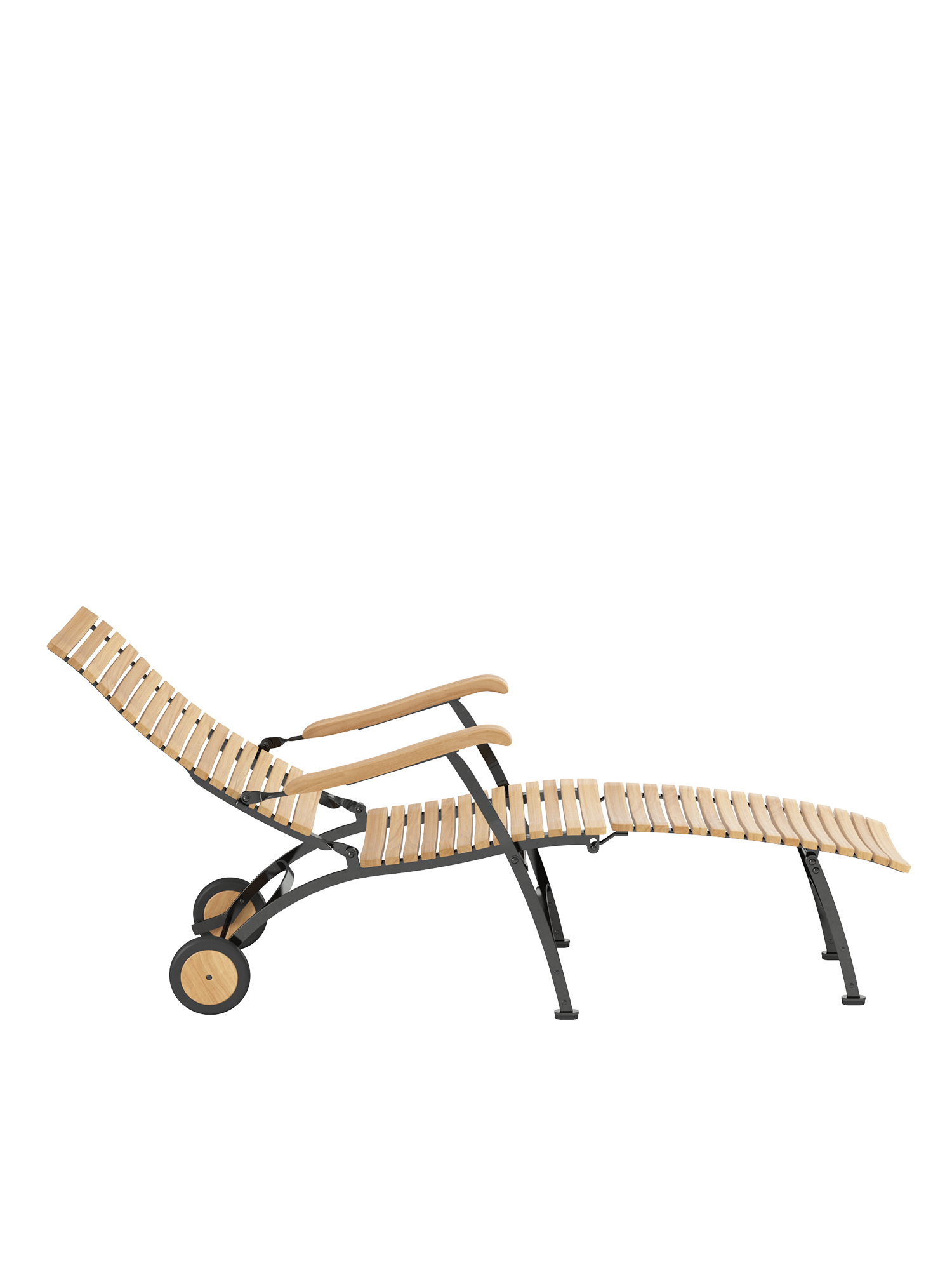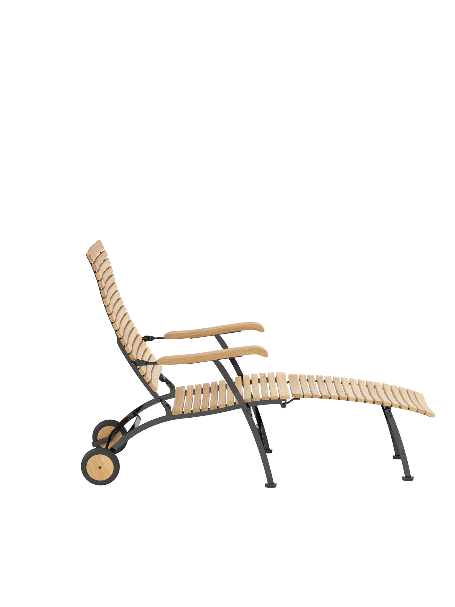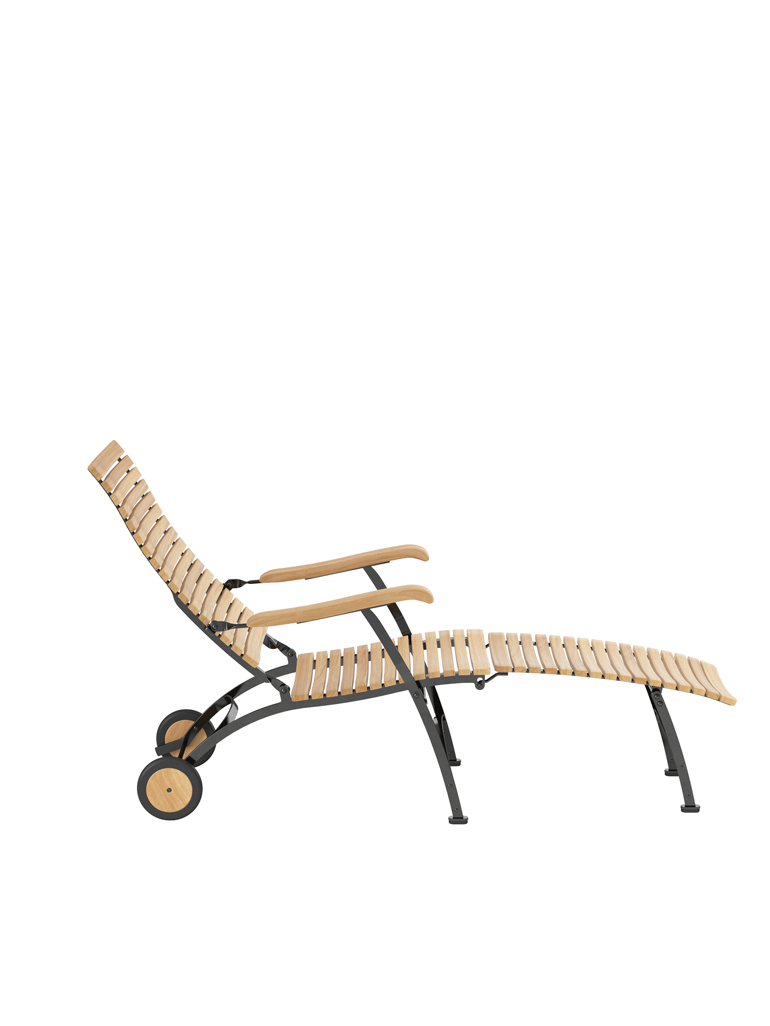 For easy and long-term outdoor use, all bolts of the joints are made of stainless steel, in rust-proof bearings. Polyamide runners under the seat ensure a smooth folding action and protect the powder-coated metal. The frame is made from galvanised, and therefore rust-protected, powder-coated steel. With its wheels of teak the deck chair is easy to move about the garden. Floor gliders of hard-wearing synthetic material protect valuable flooring from scratches.