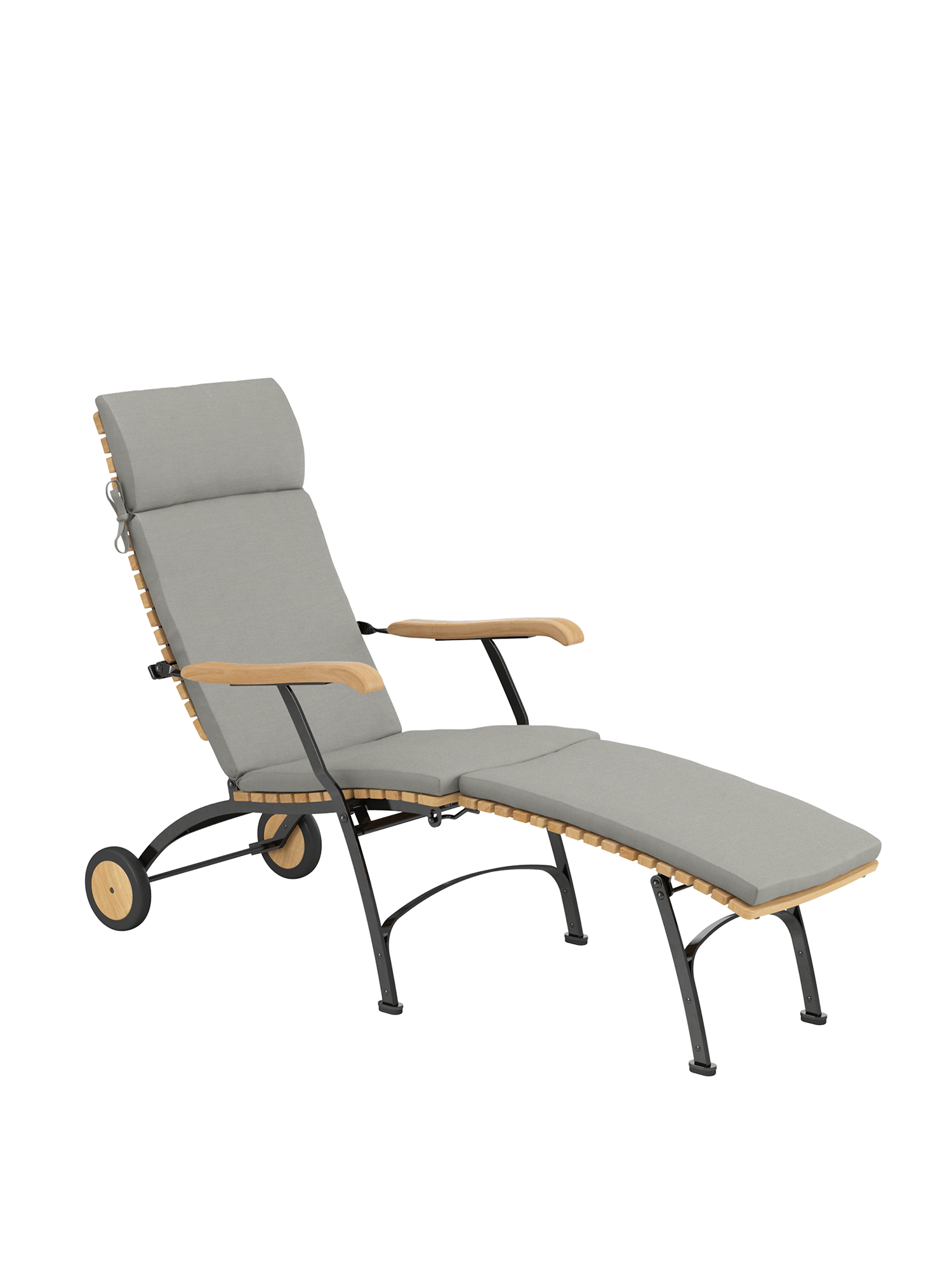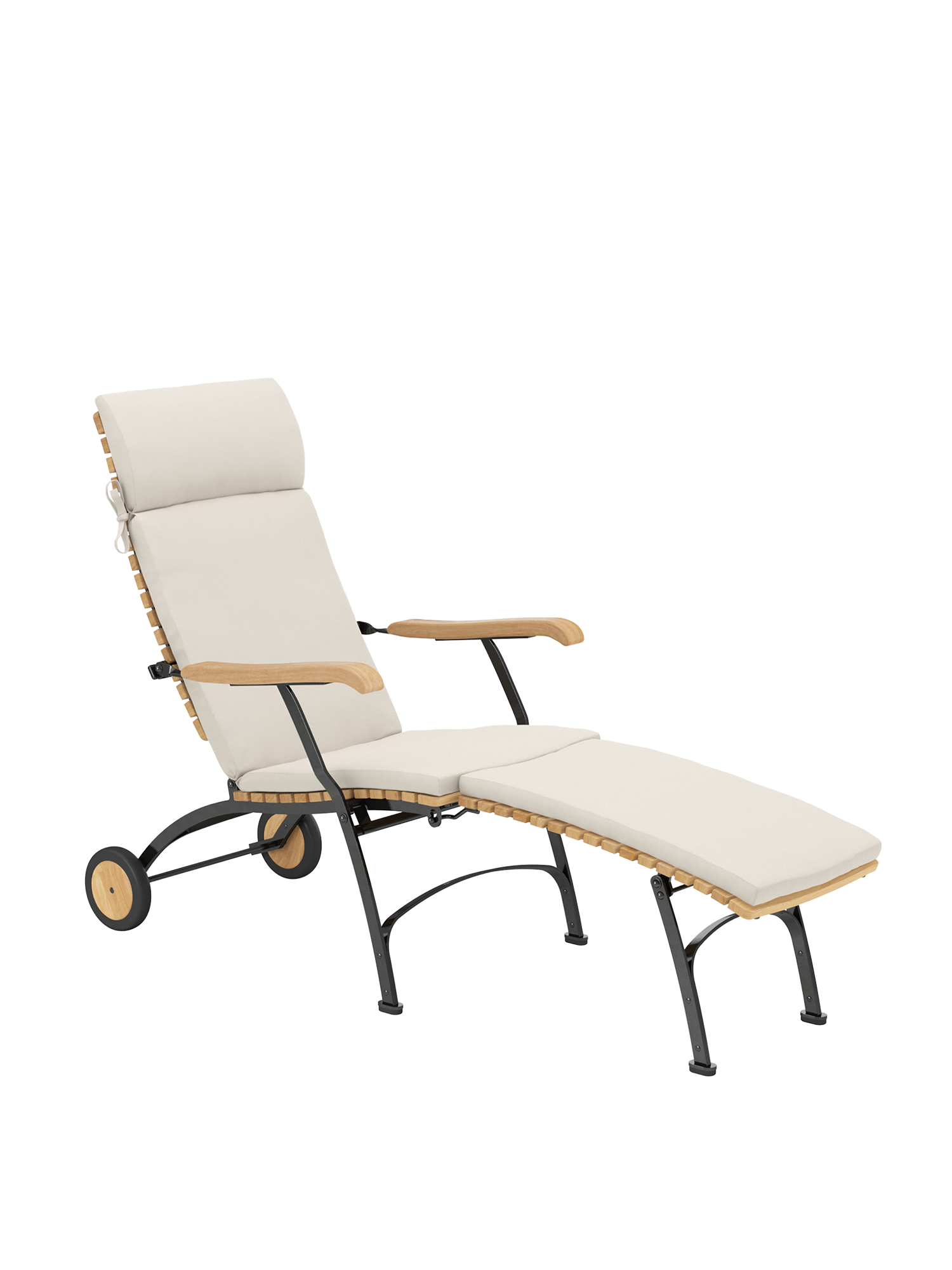The backrest of the deck chair is adjustable to five positions. It is made of closely aligned, solid teak slats. Their shape is modelled after one of the most unusual curvatures, that of the human spine. Thanks to the detachable footrest, the deck chair becomes a comfortable easy chair – in the wink of an eye. Cushions in various colours increase the comfort of the furniture and set fine accents.