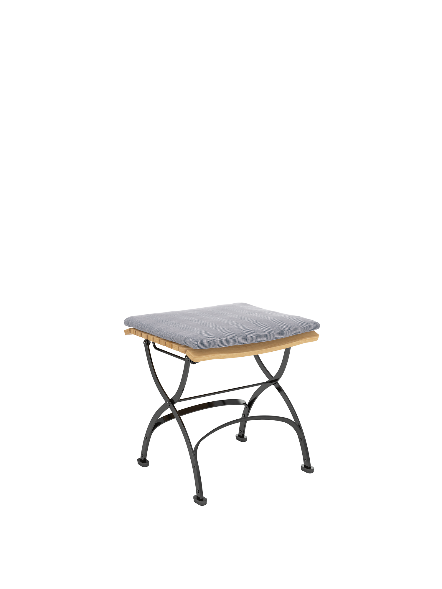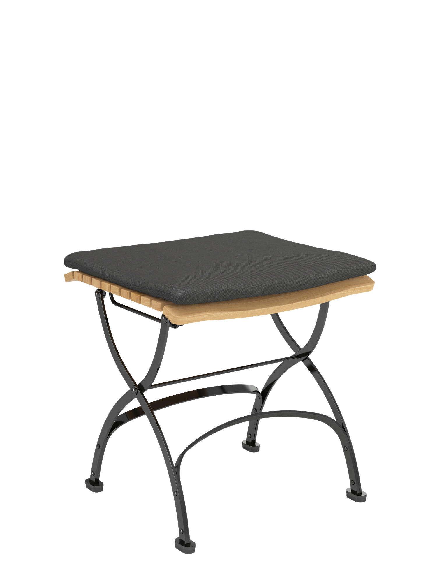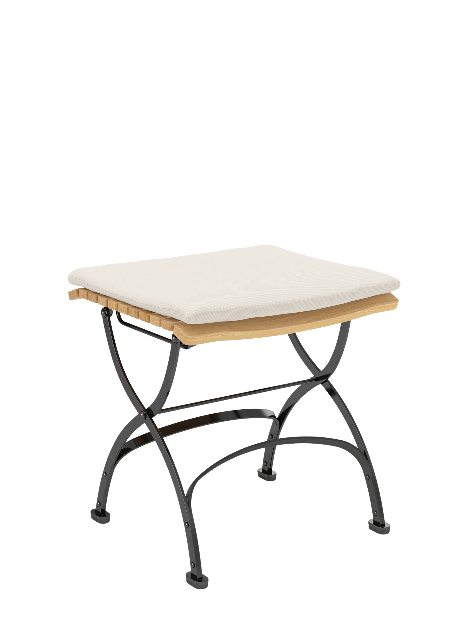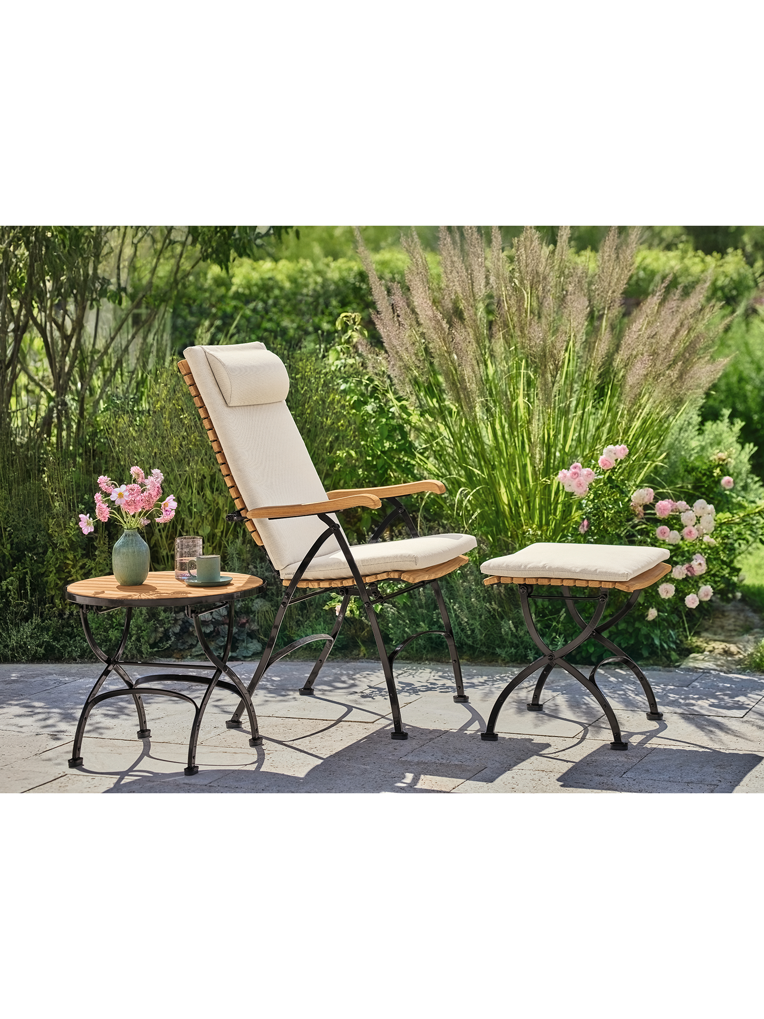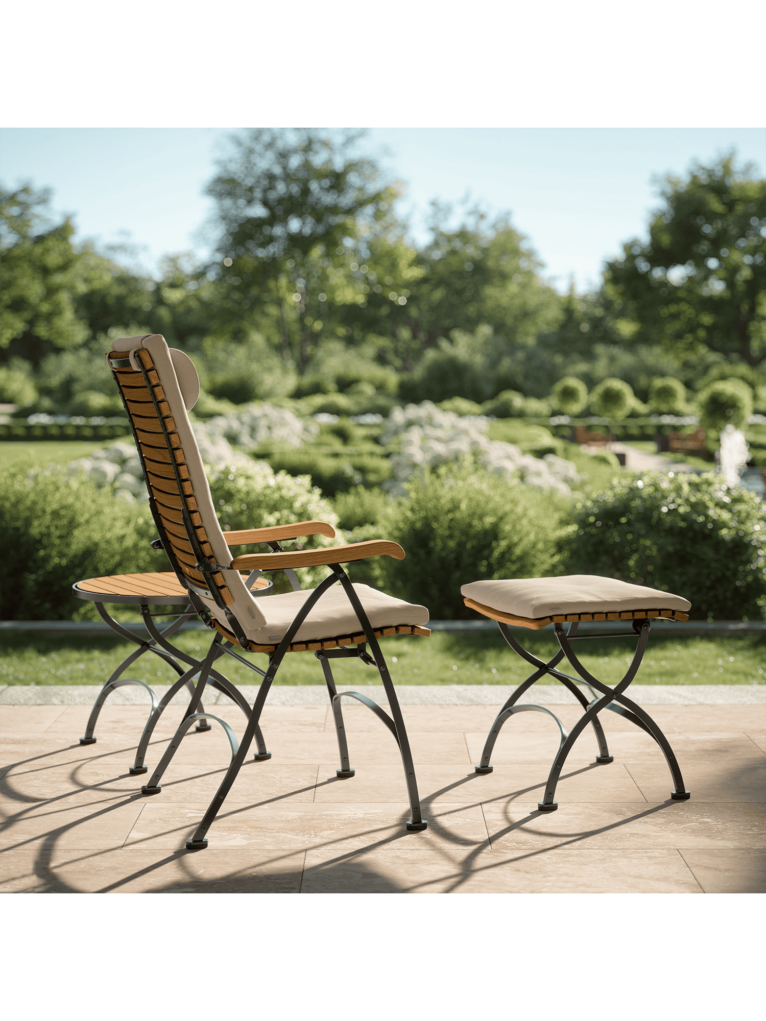 Easily unfolded in no time, it transforms the recliner into a deck chair and doubles as a simple seating option. Its seat is made of ergonomically shaped teak slats, while the frame is crafted from galvanised, powder-coated steel. Cushions in various colors further enhance the comfort of the garden furniture and add subtle accents.